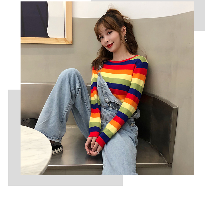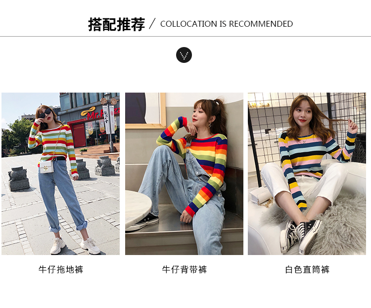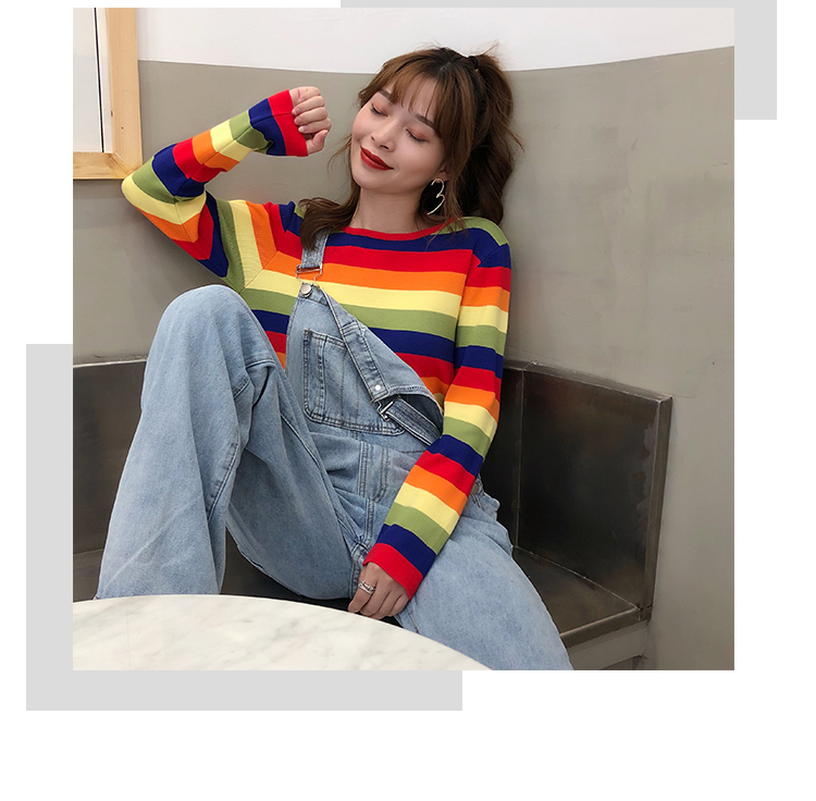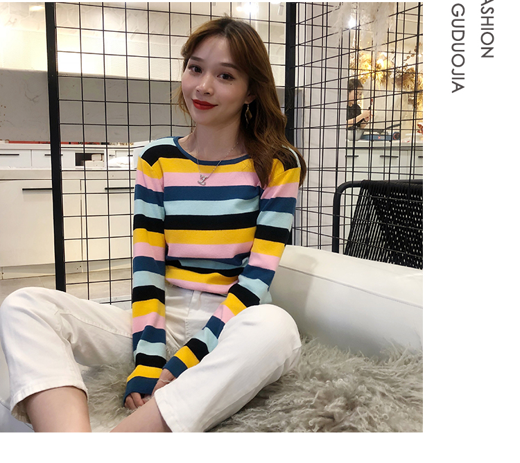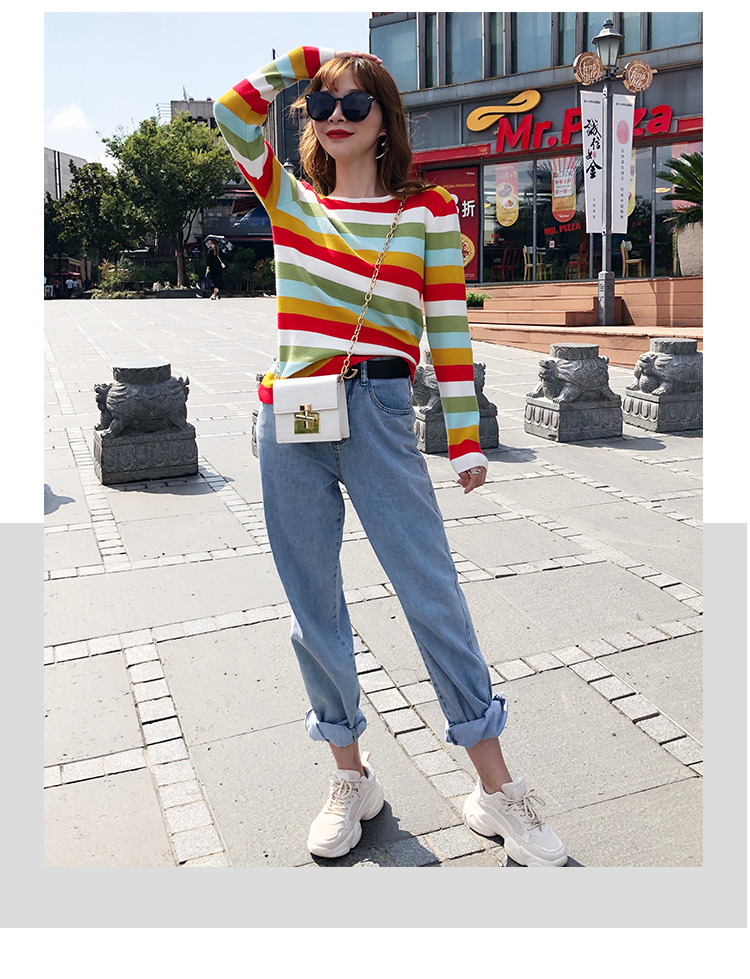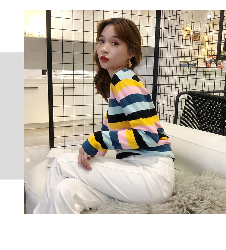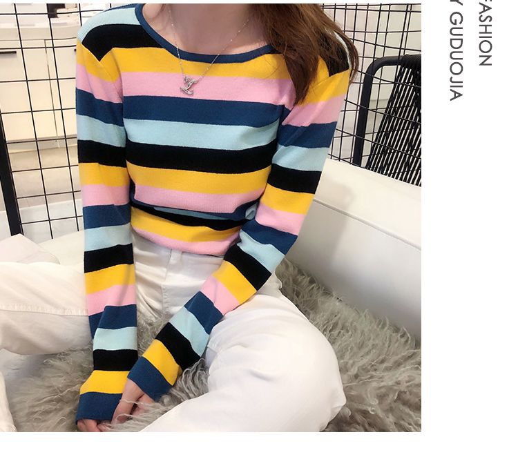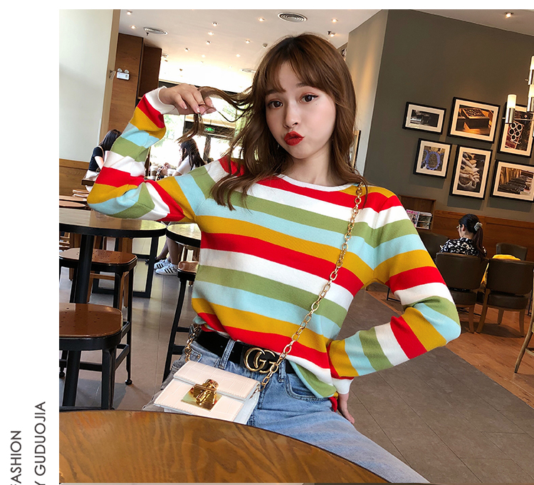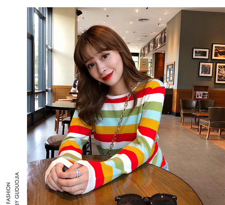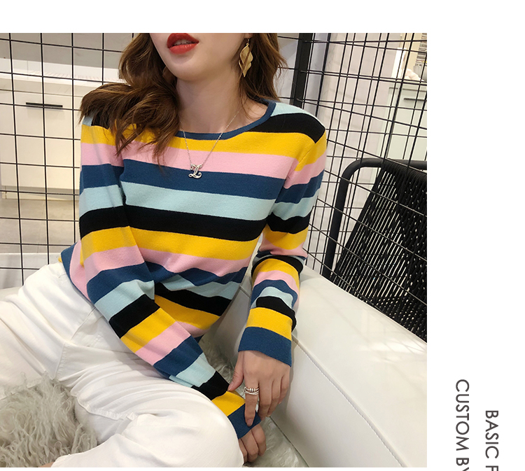 2019秋冬季新款寬松外穿套頭毛衣女彩虹條紋針織衫百搭打底衫上衣1入