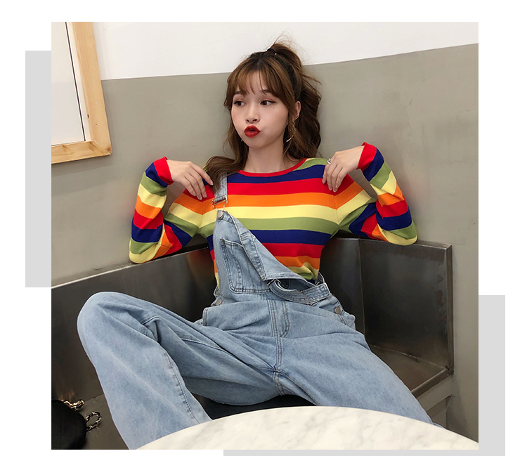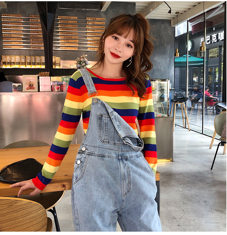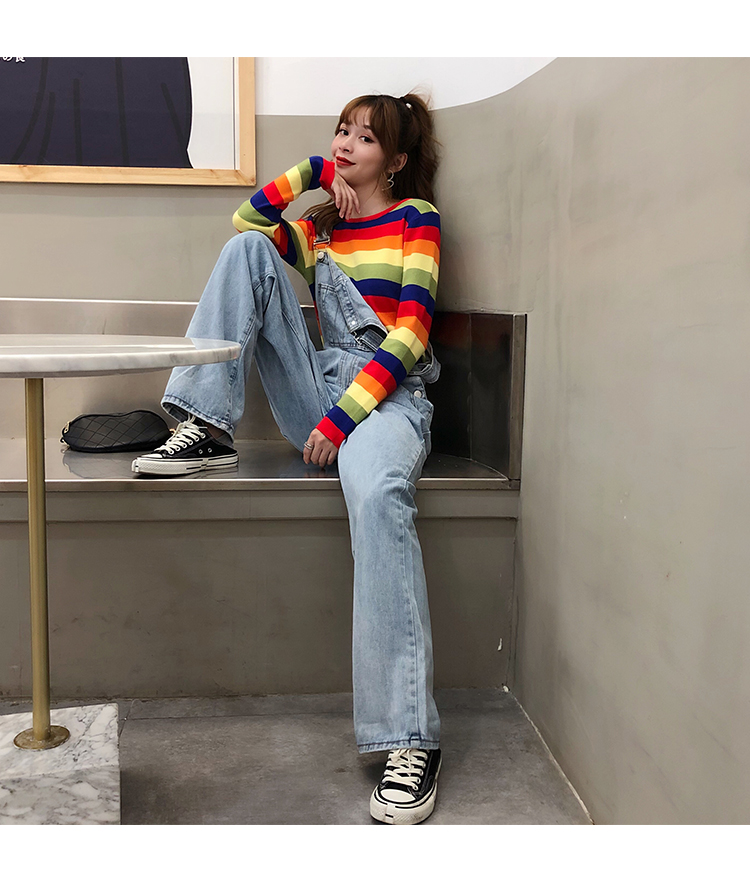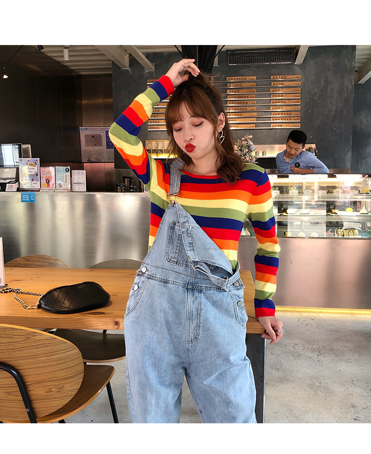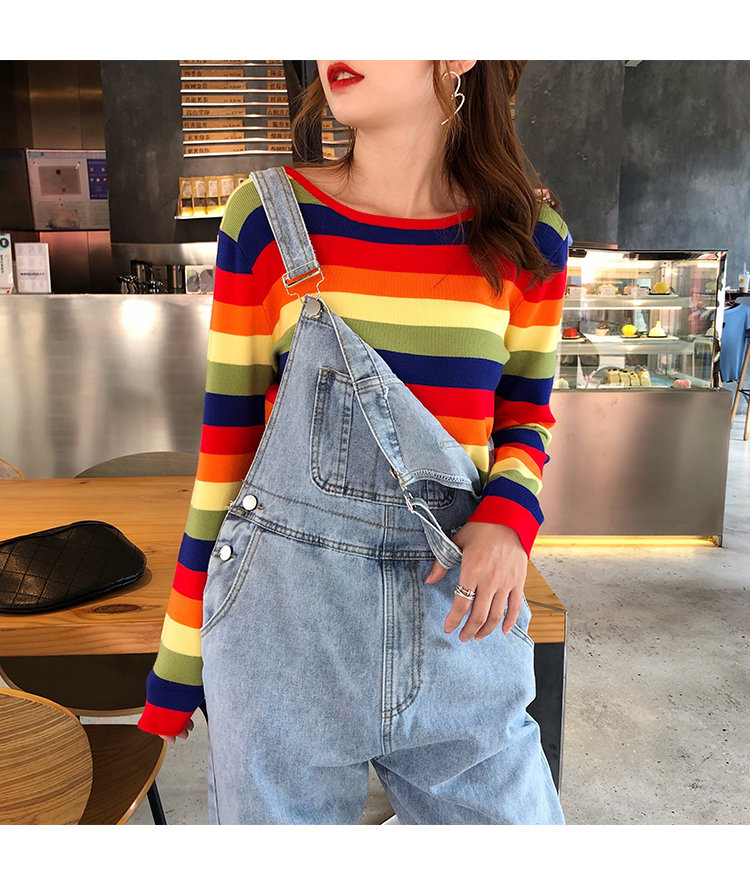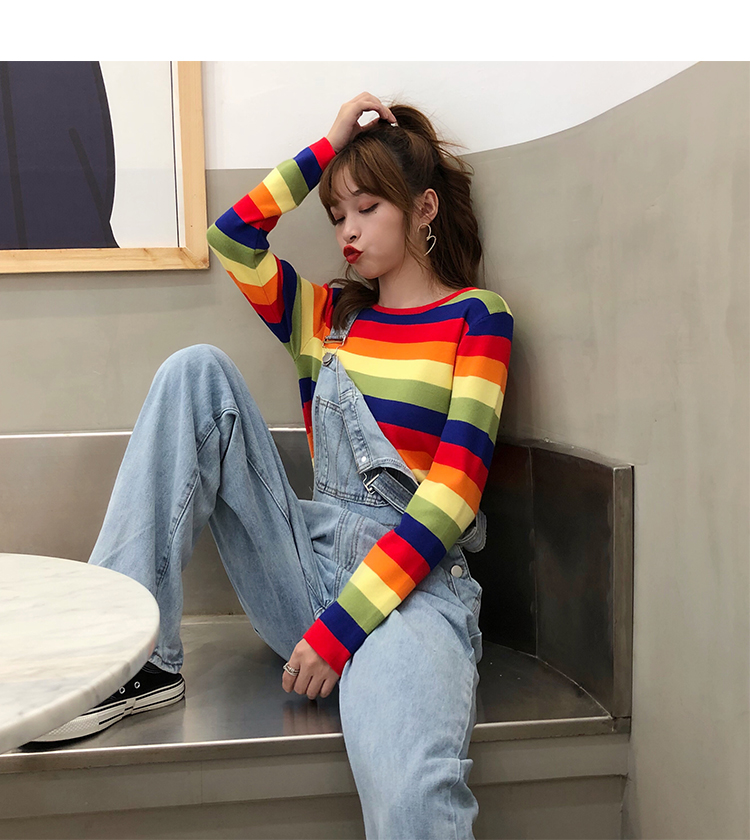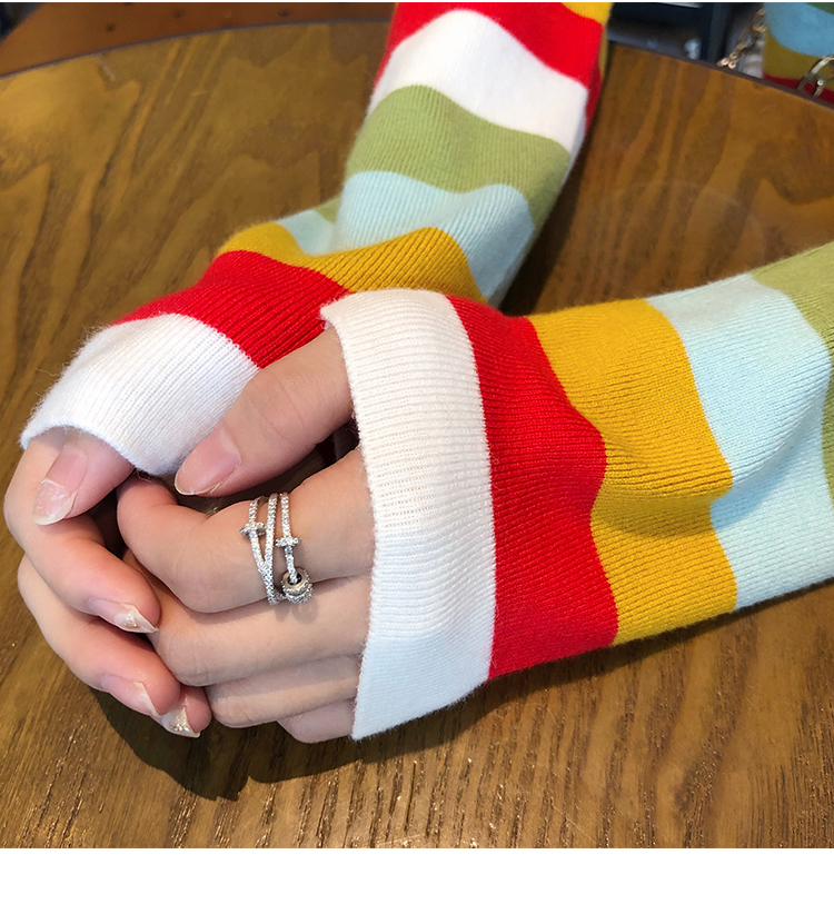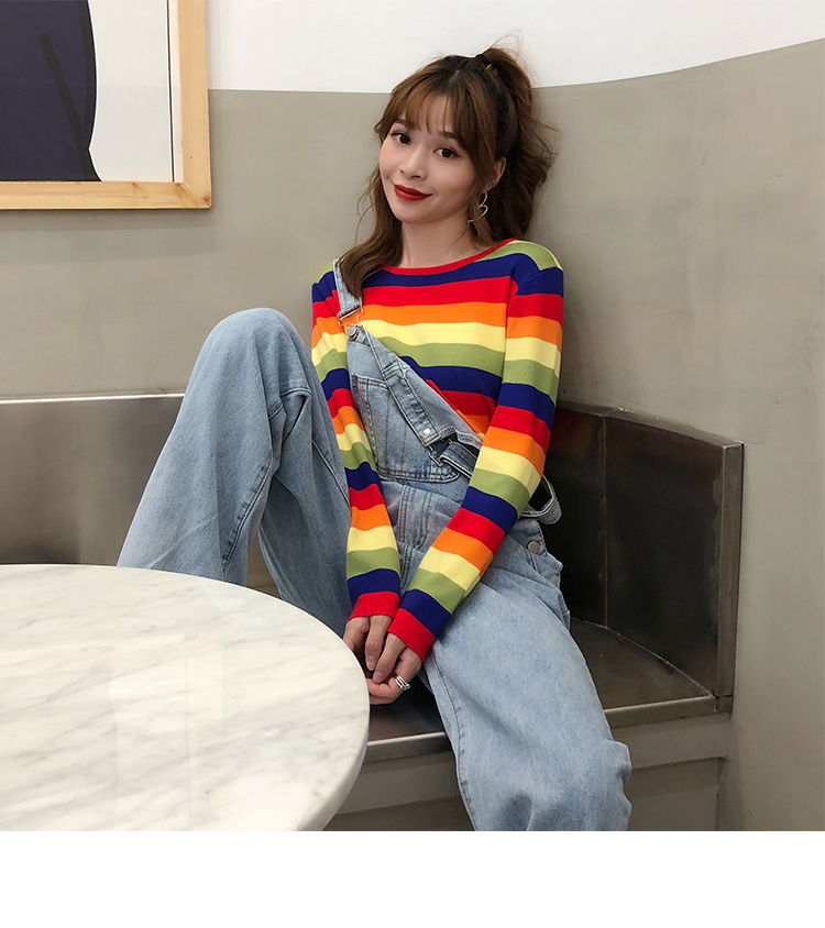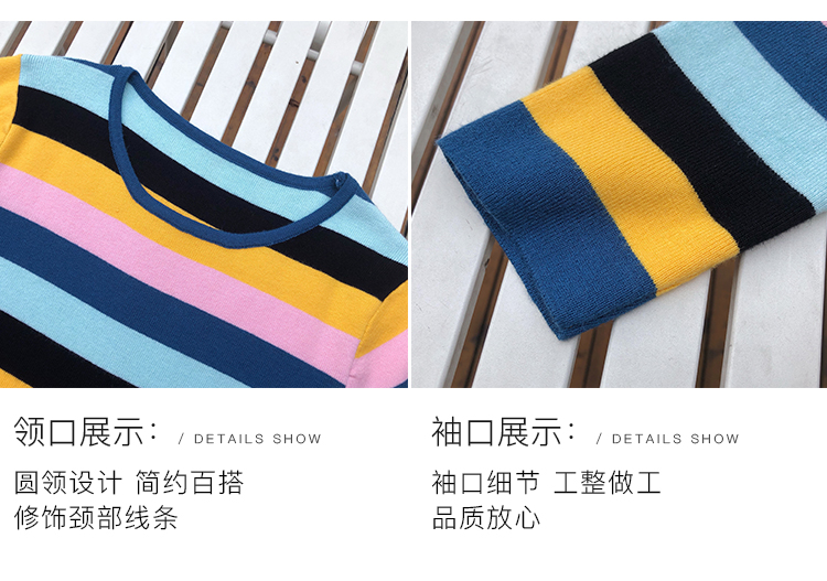 2019秋冬季新款寬松外穿套頭毛衣女彩虹條紋針織衫百搭打底衫上衣1入