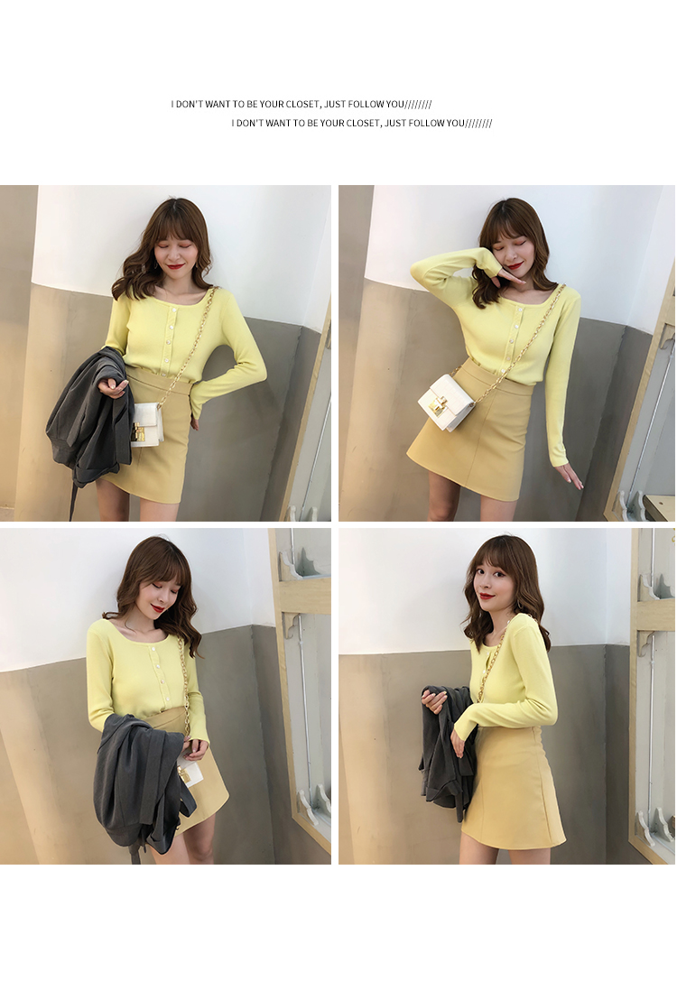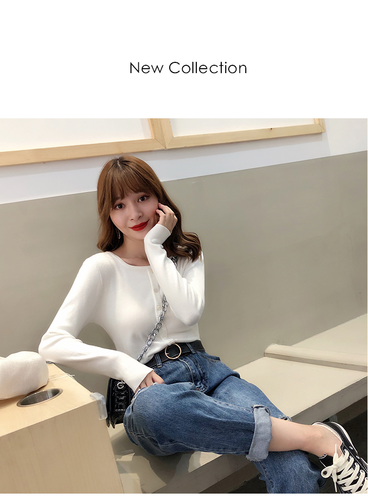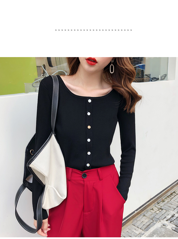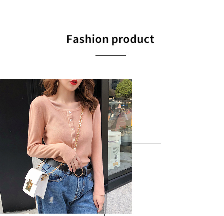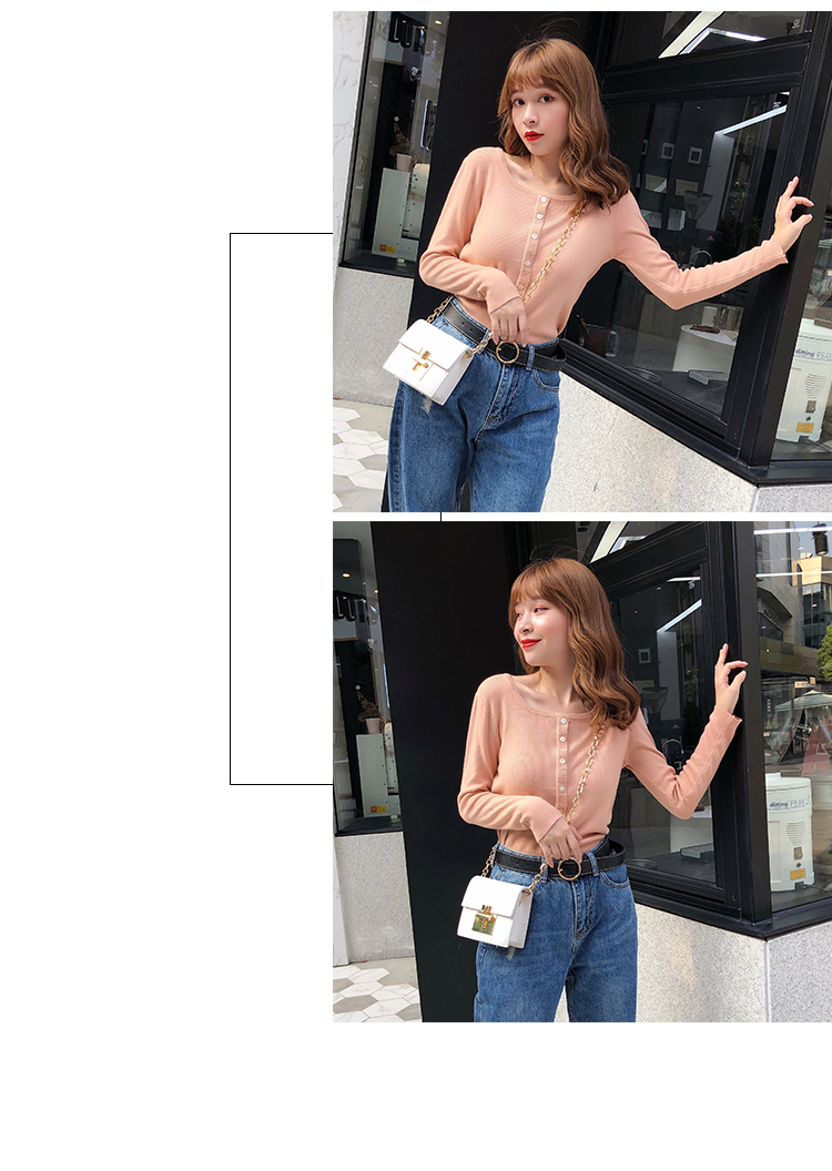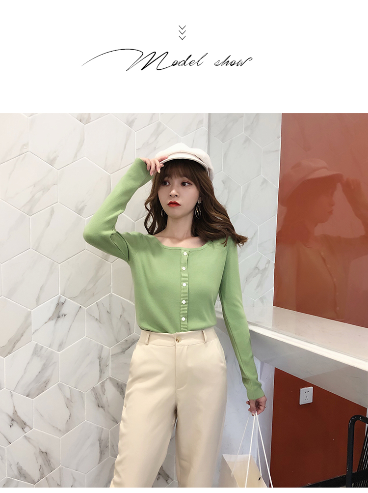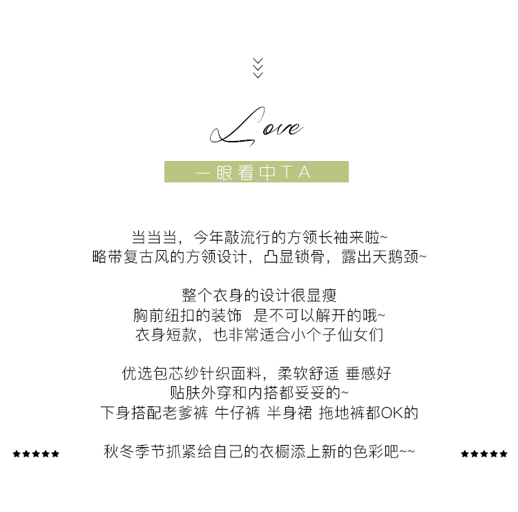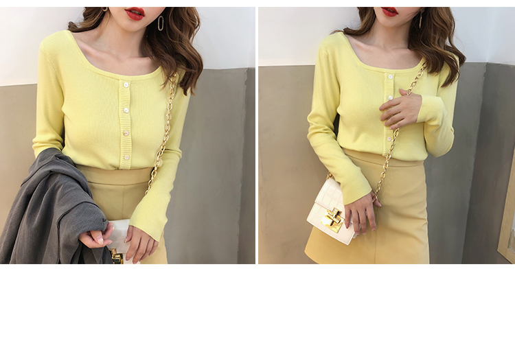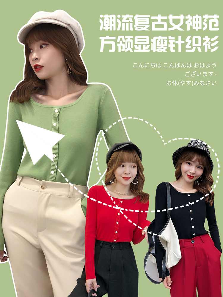 2019秋冬新款復古方領顯瘦上衣女長袖T恤寬松短款針織衫打底毛衣1入