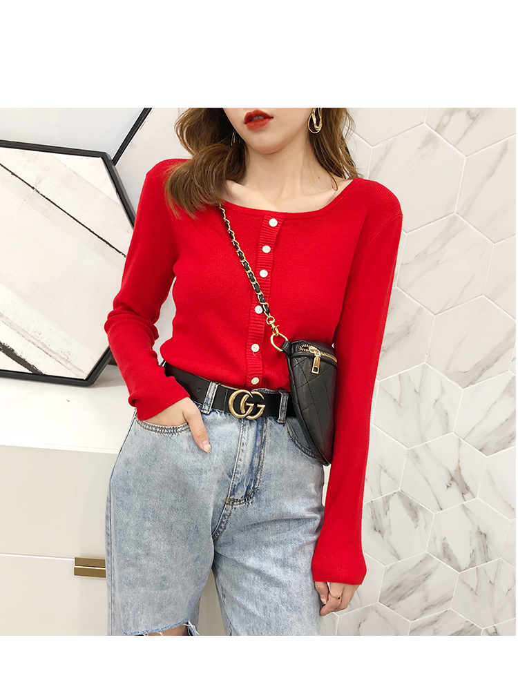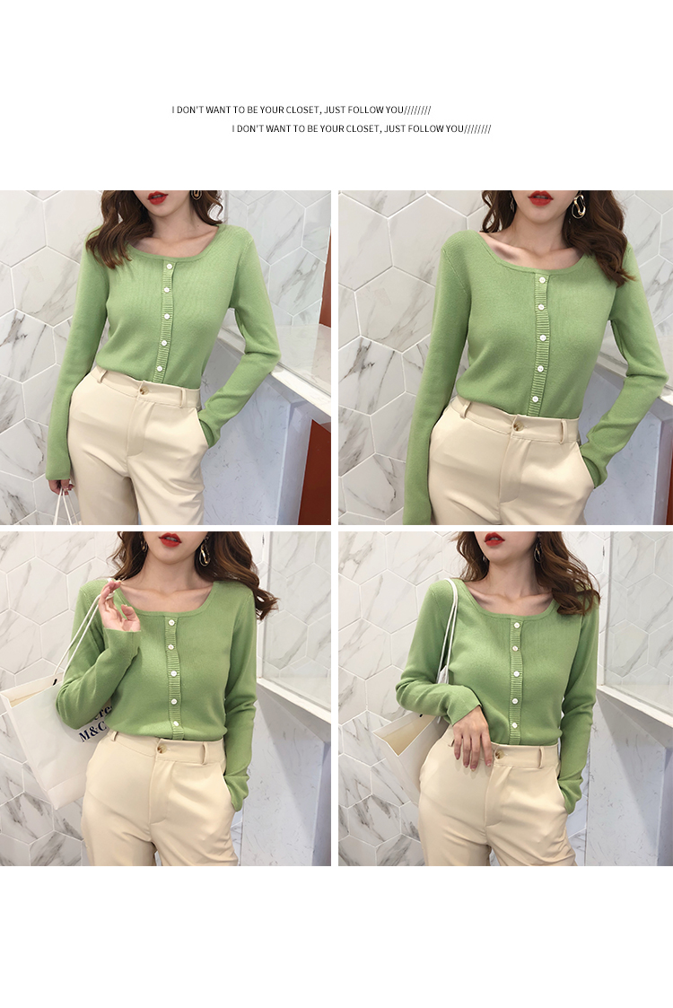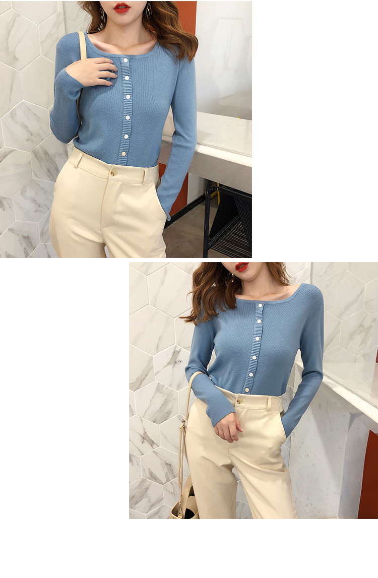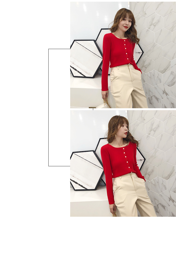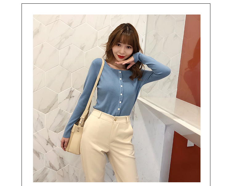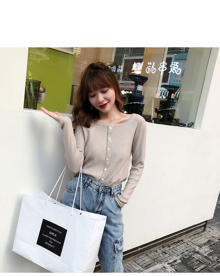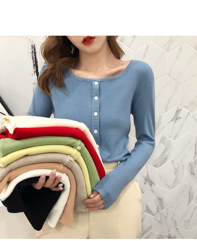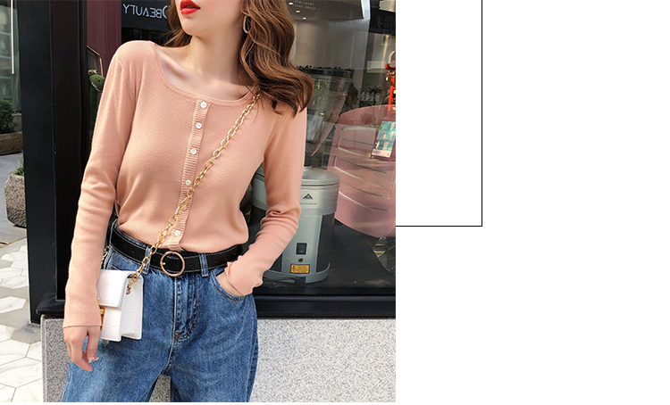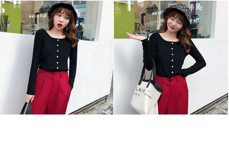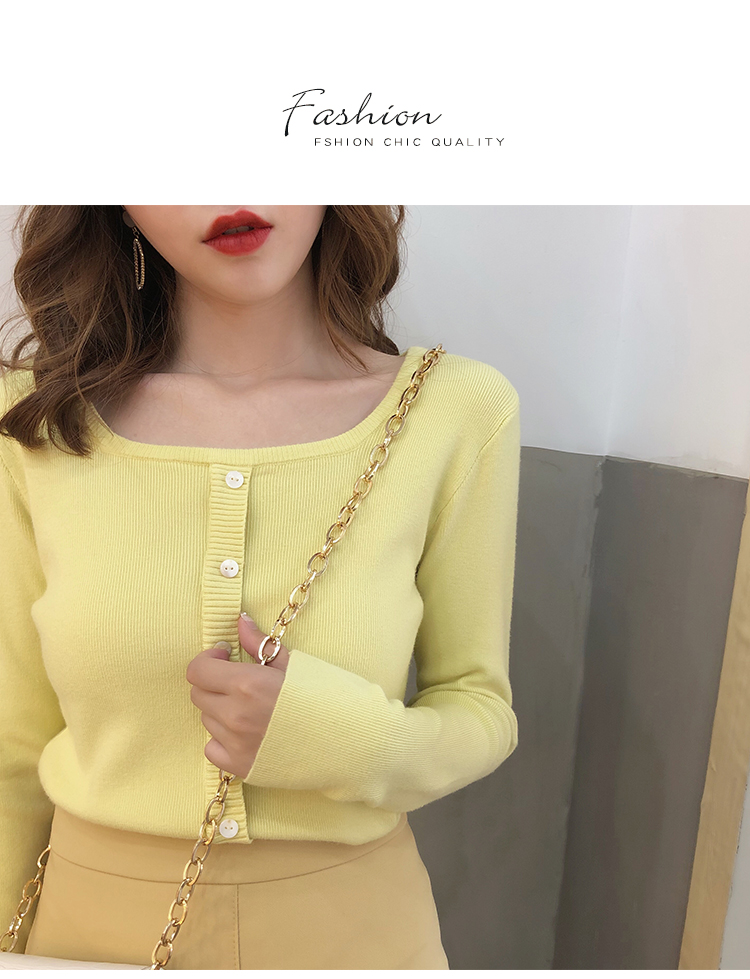 2019秋冬新款復古方領顯瘦上衣女長袖T恤寬松短款針織衫打底毛衣1入