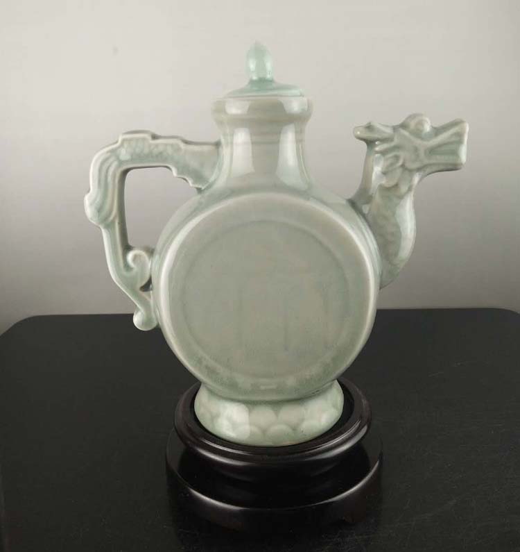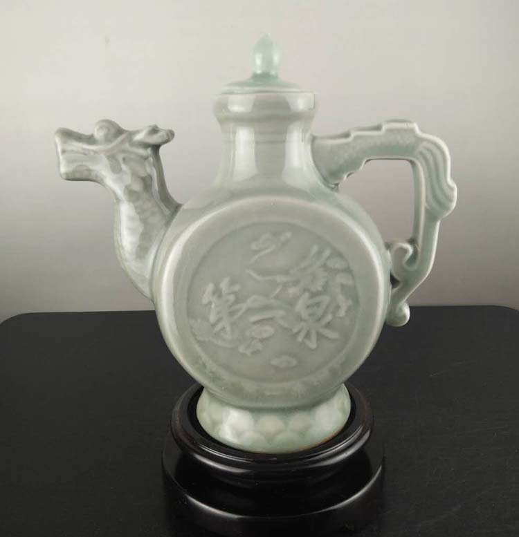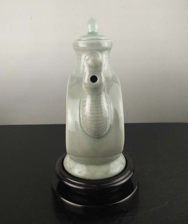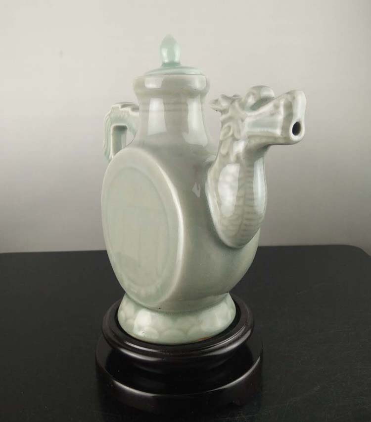 【詳細說明】:此壺是80年代龍泉瓷器總廠(上垟瓷廠)燒制的產品,壺型屬于老一輩瓷器制作人以鳳為題材精心設計,器型大氣美觀、實用。釉面深淺恰到好處,古樸逼真。