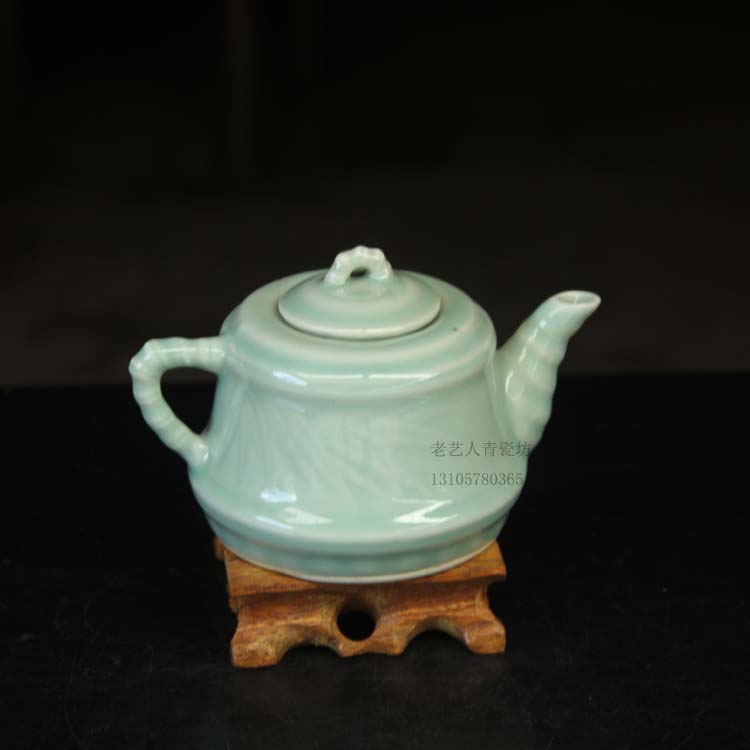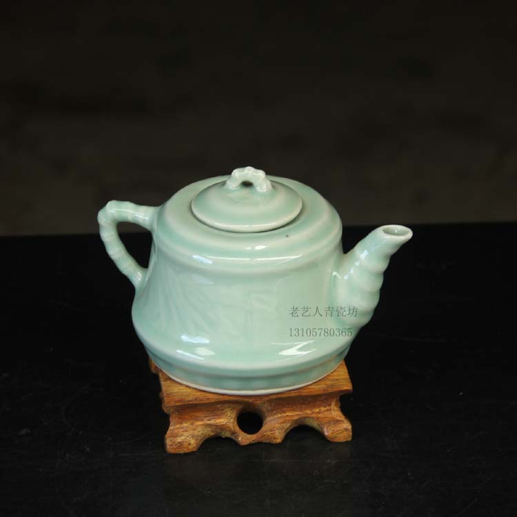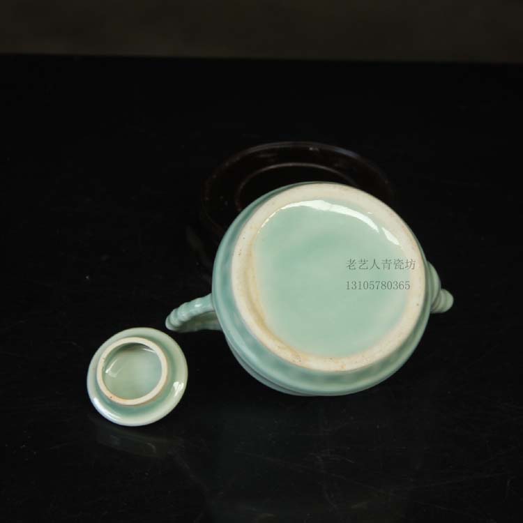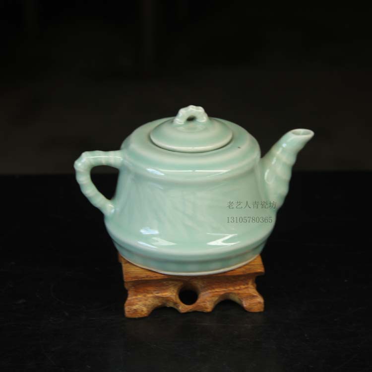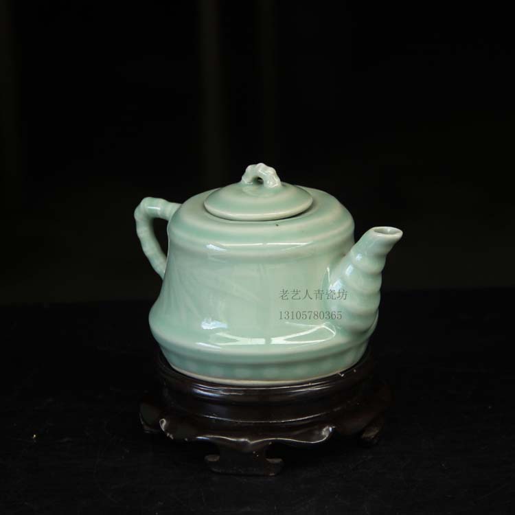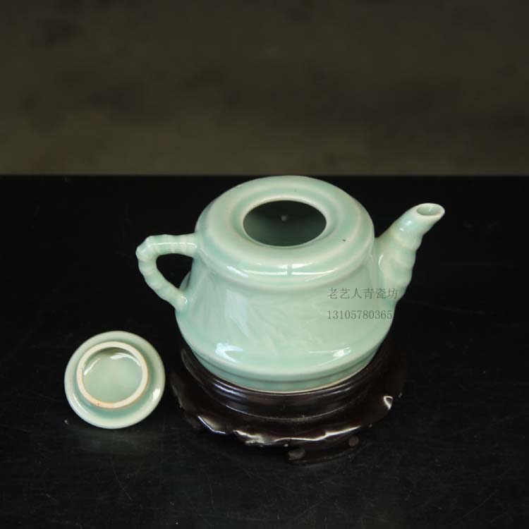 【詳細說明】:80年代柴窯燒制產品,屬于當時的出口精品。此壺是80年代龍泉瓷器總廠(上垟瓷廠)燒制的產品,壺型屬于老一輩瓷器制作人精心設計,器型比例恰到好處,美觀大方實用。是當年批量生產的產品。本店現在所售的竹節壺品相是當年選瓷標準的一級品。因受成型生產環境、設備工具等簡陋;及龍窯燒制時:窯內裝窯環境復雜(此壺需要放入特制的?內燒制,才能使此壺在燒制過程中均勻受溫),加上人工觀火控溫難度高等因素的影響,形成的成品率極低。當年的一級品產品比起現在瓷器來粗糙,還略帶小瑕疵。其工藝復雜性與難度是現在制瓷工藝無法比擬的,它永遠成為一個歷史的見證,見證當年一個時期青瓷制作工藝水平的高難度。