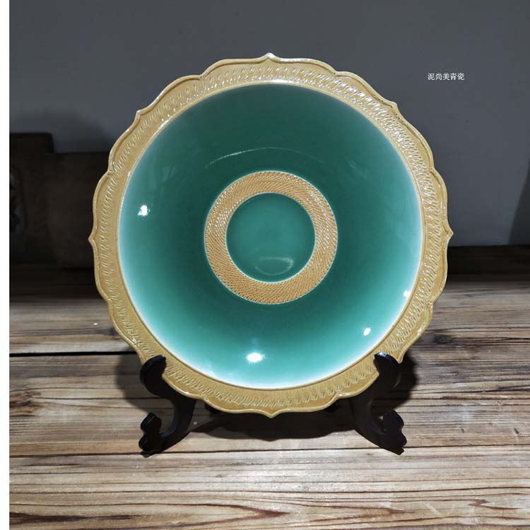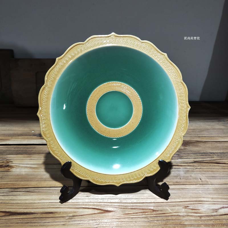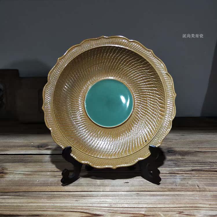 【詳細說明】:純手工制作葵花盤,古典精品裝飾盤,手工跳刀紋飾猶如編織紋,釉色十分古樸誘人,梅子青與黃釉結合,盤托釉---美美的獻上翠玉玲瓏,就如月兒和藍天。