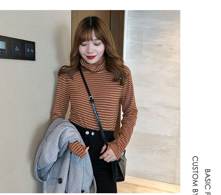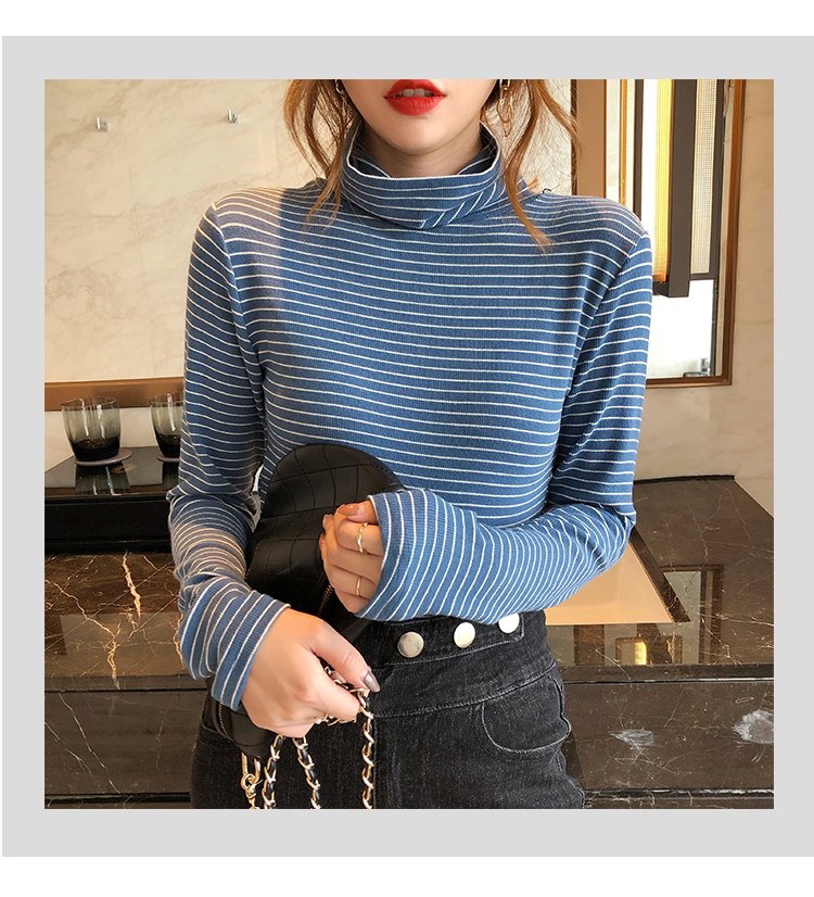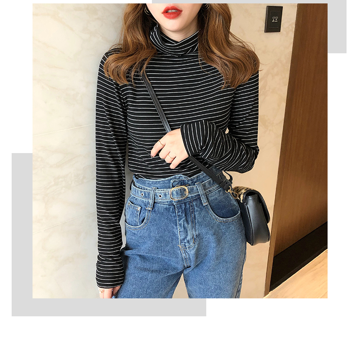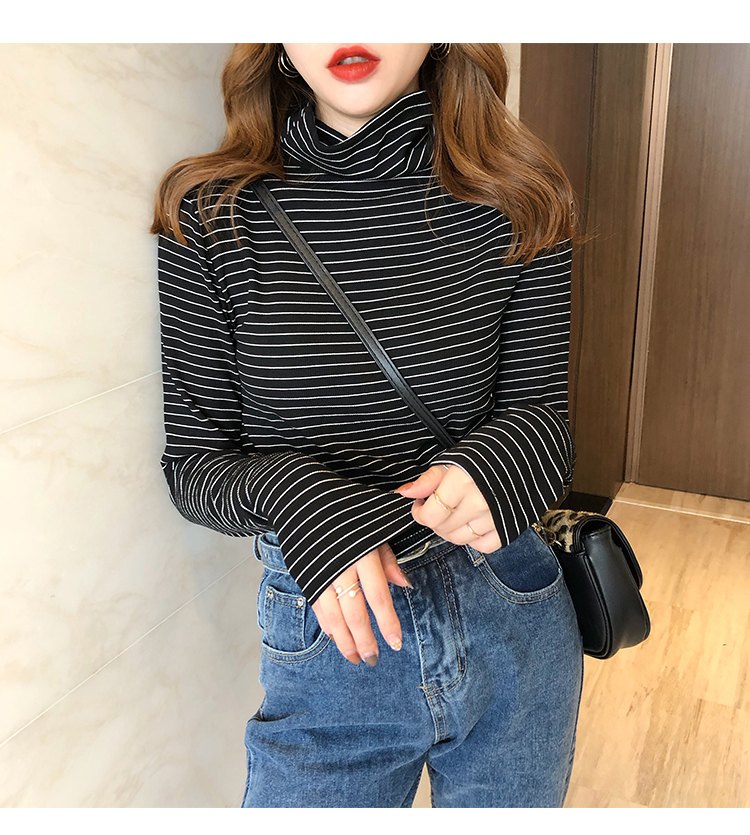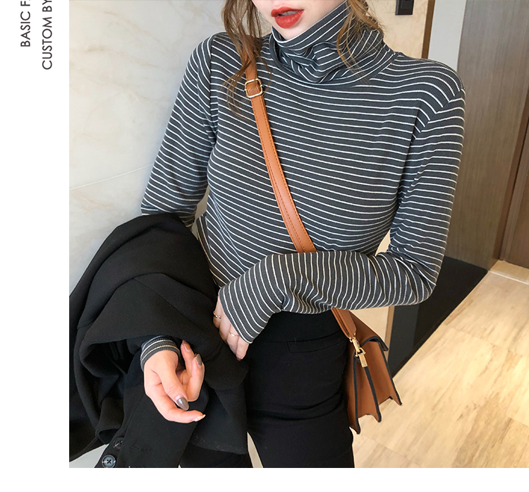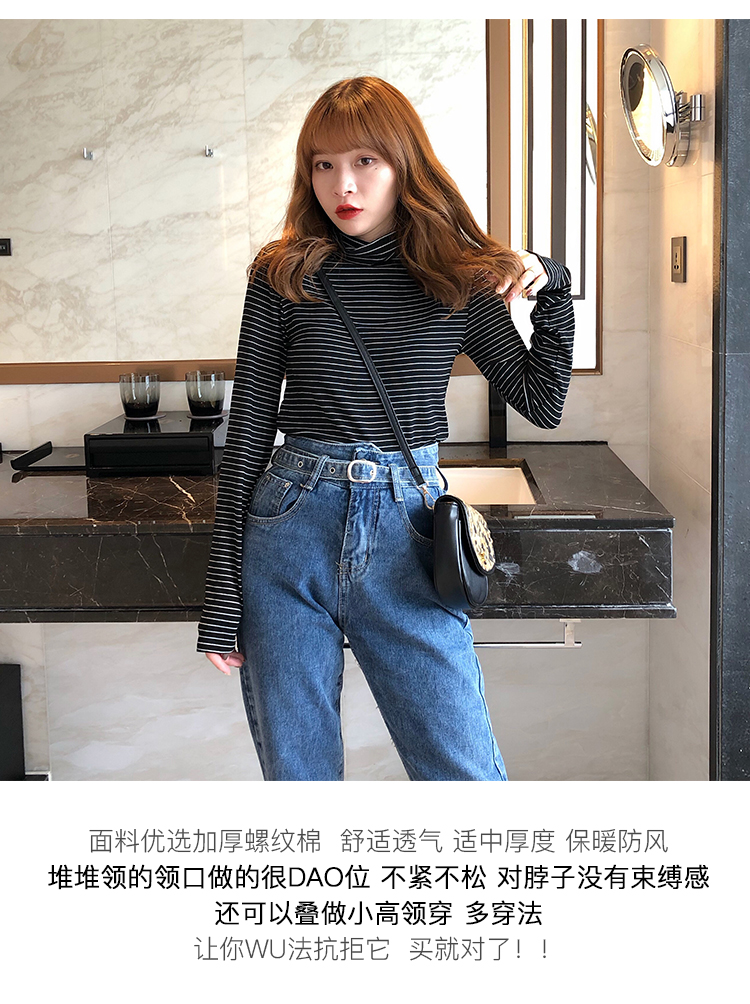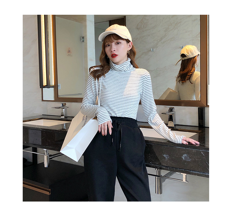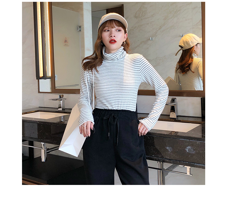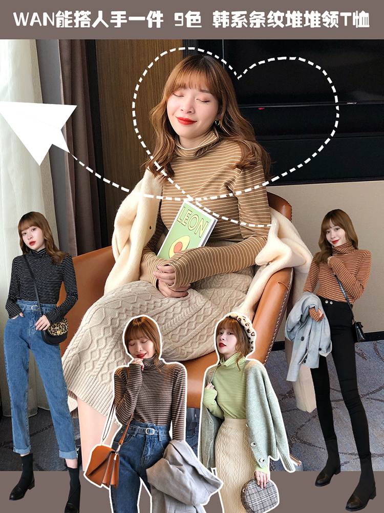 2019秋冬新款韓版條紋長袖T恤女洋氣堆堆領打底衫高領內搭上衣潮1入