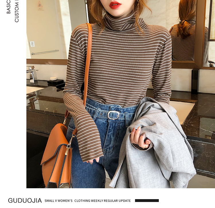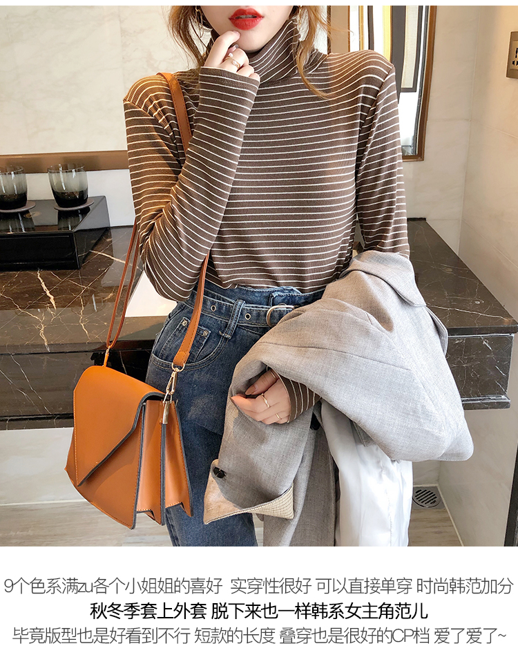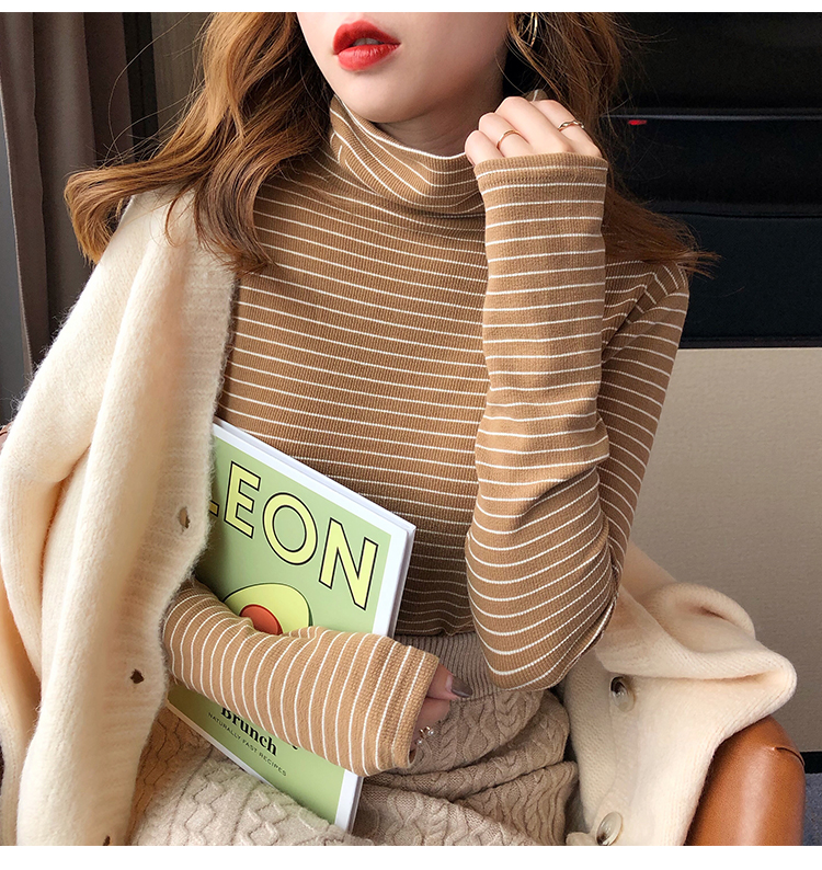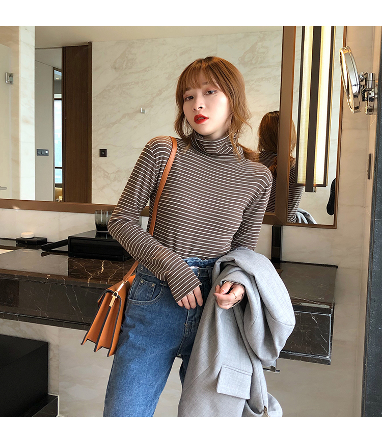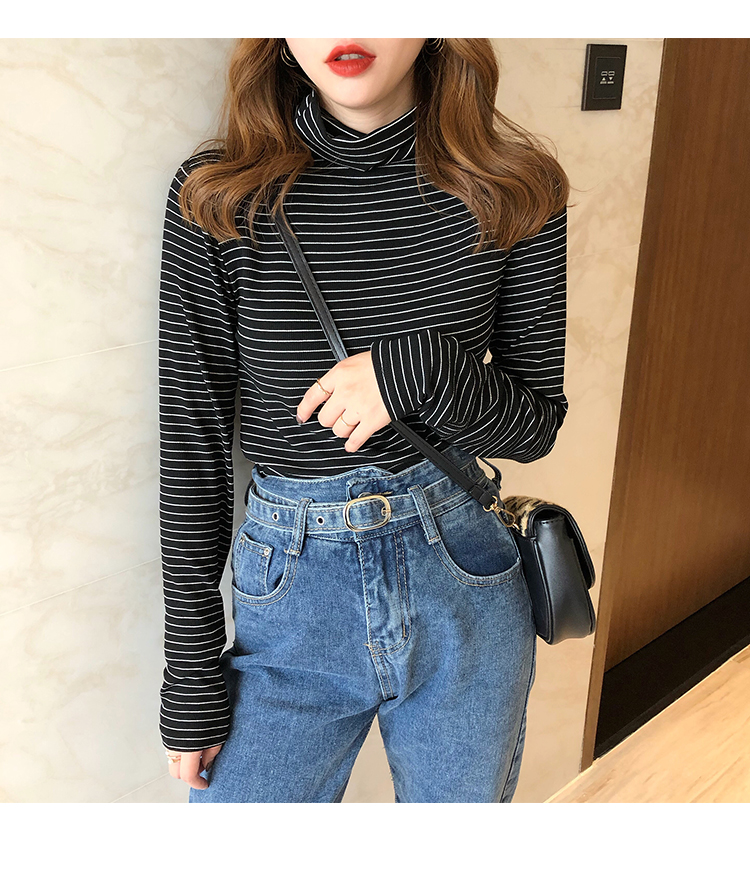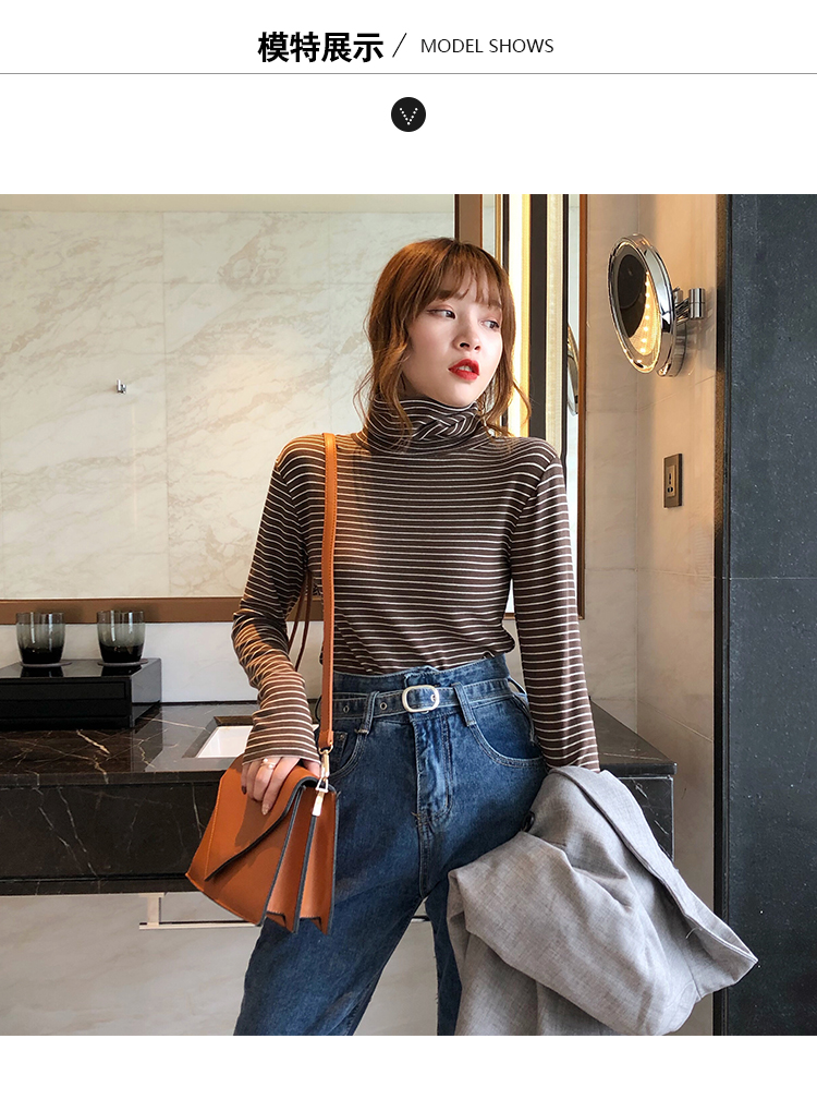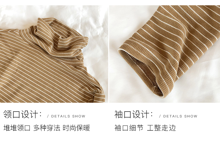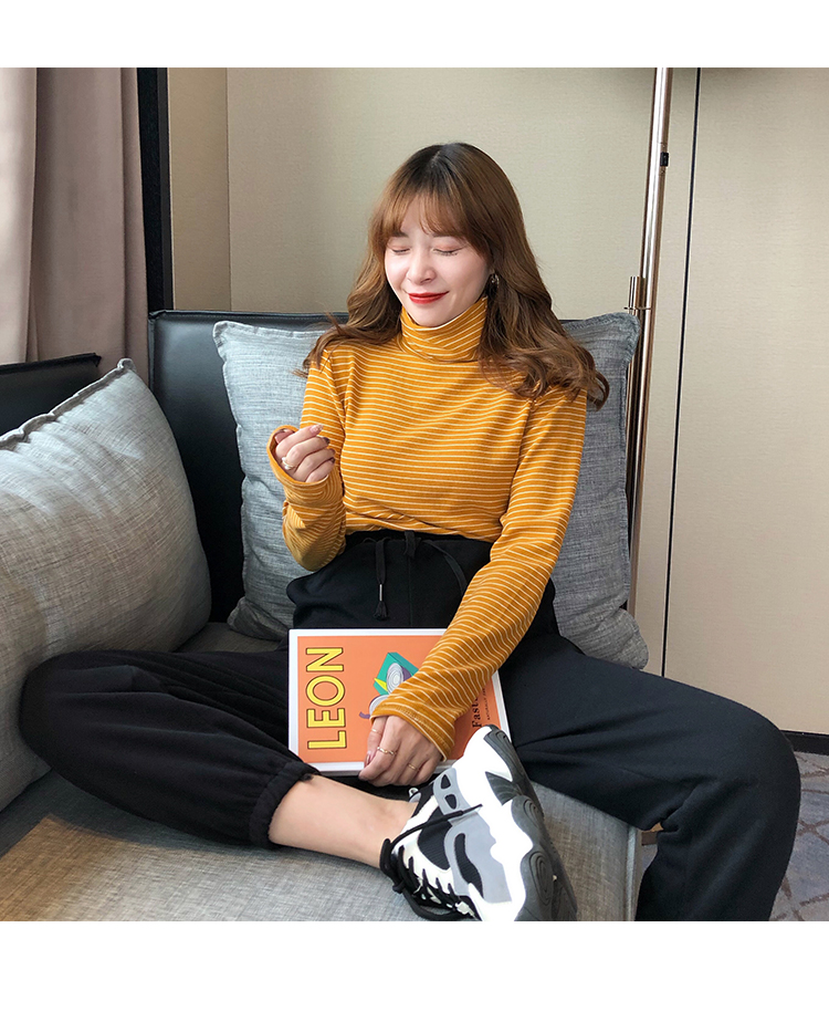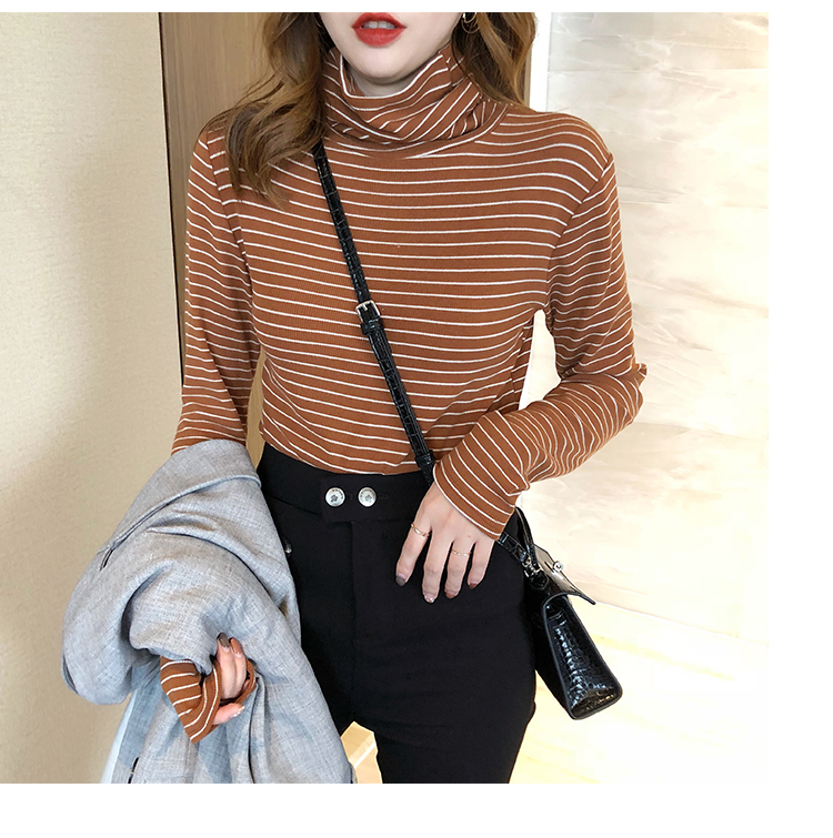 2019秋冬新款韓版條紋長袖T恤女洋氣堆堆領打底衫高領內搭上衣潮1入