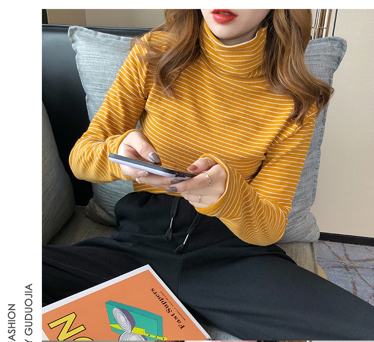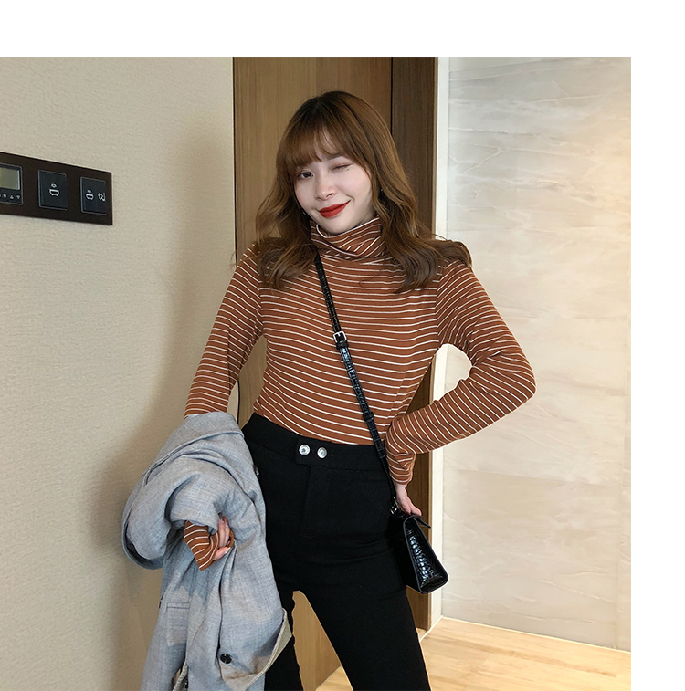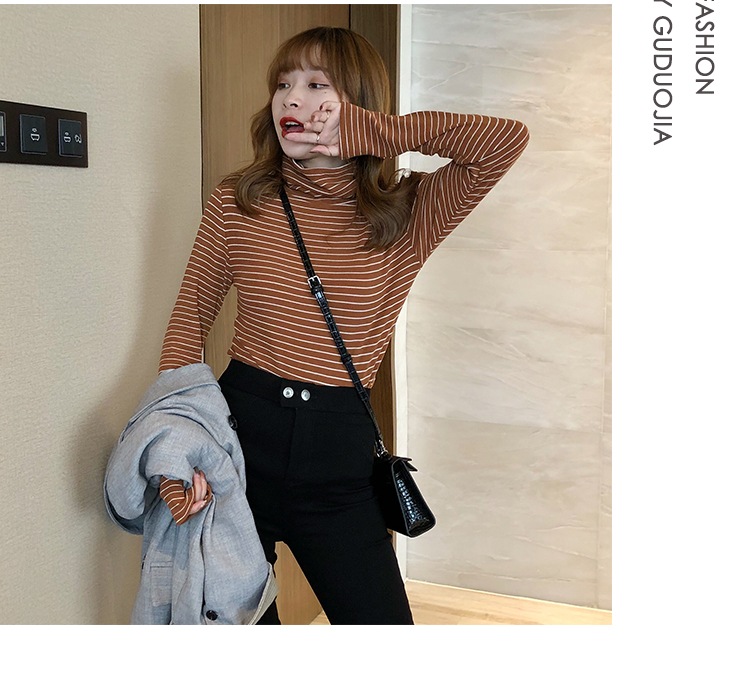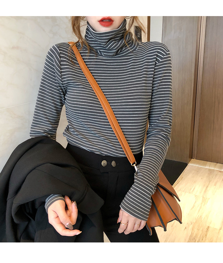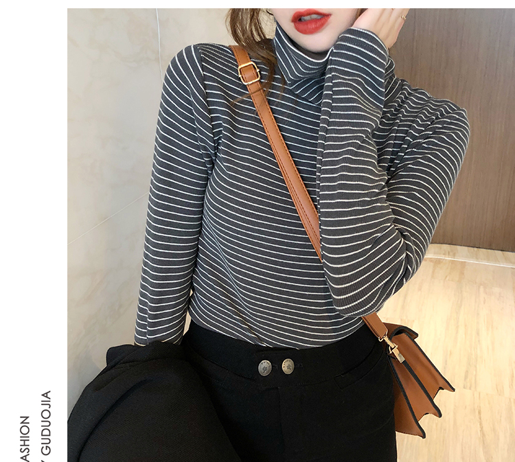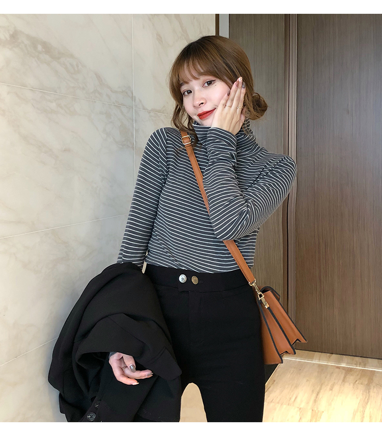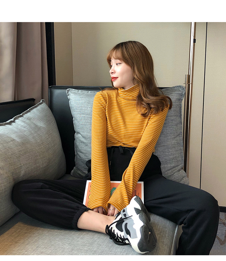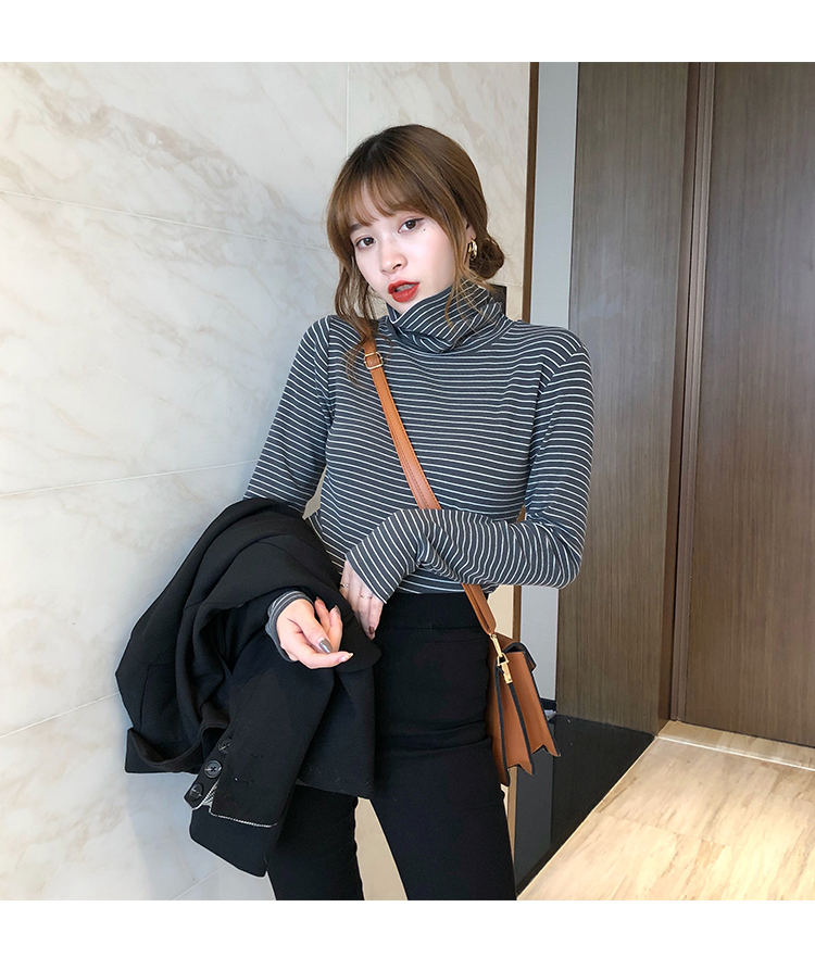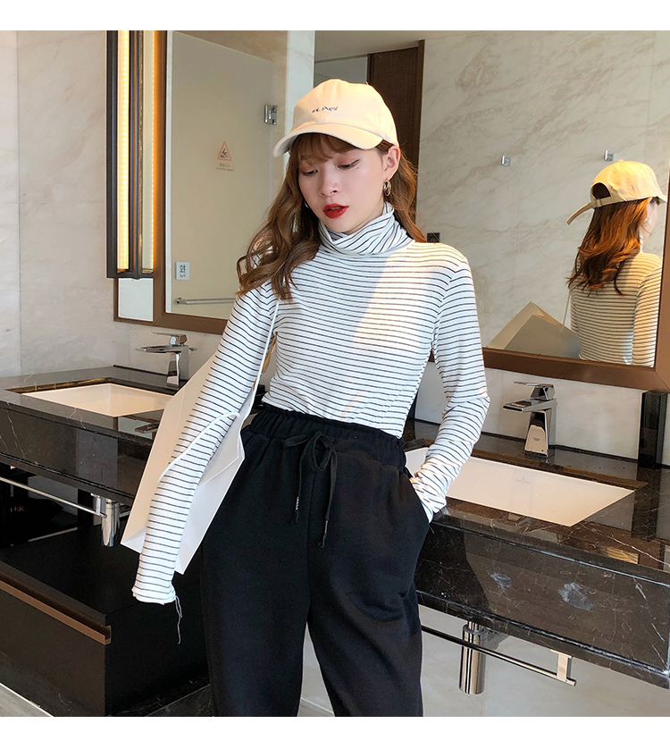 2019秋冬新款韓版條紋長袖T恤女洋氣堆堆領打底衫高領內搭上衣潮1入