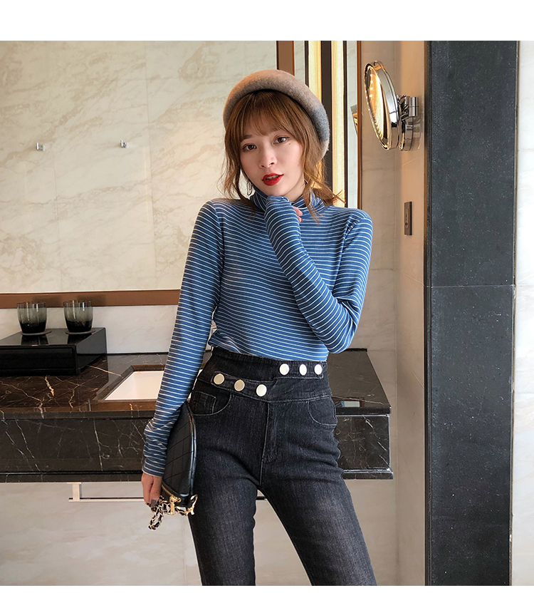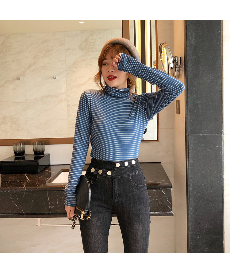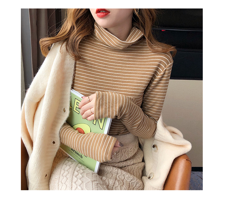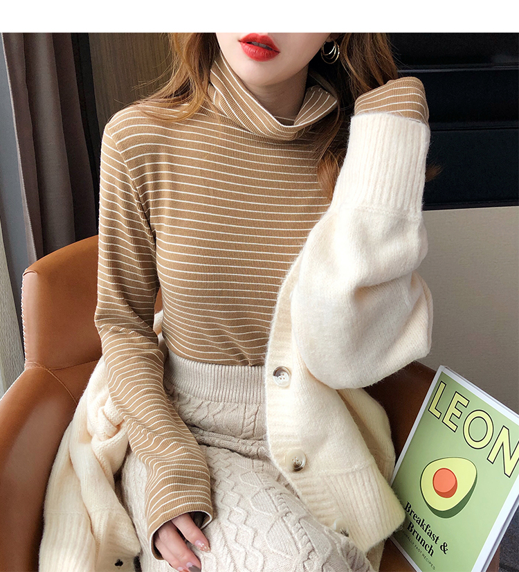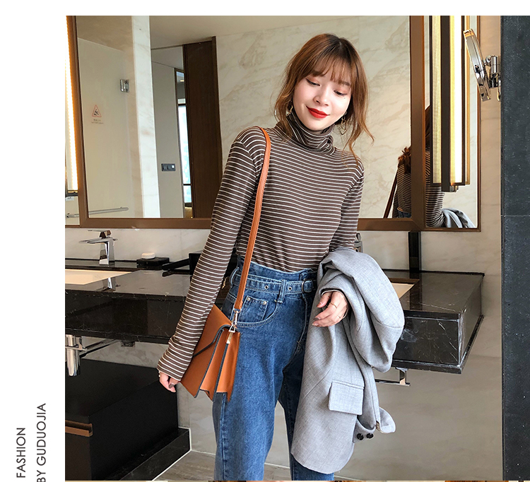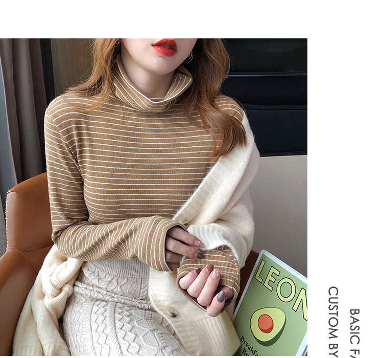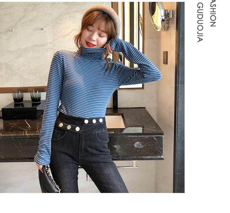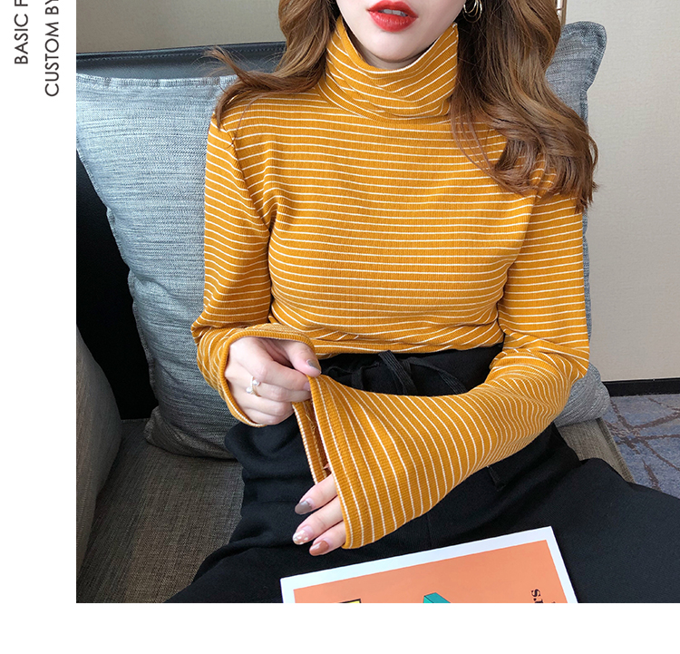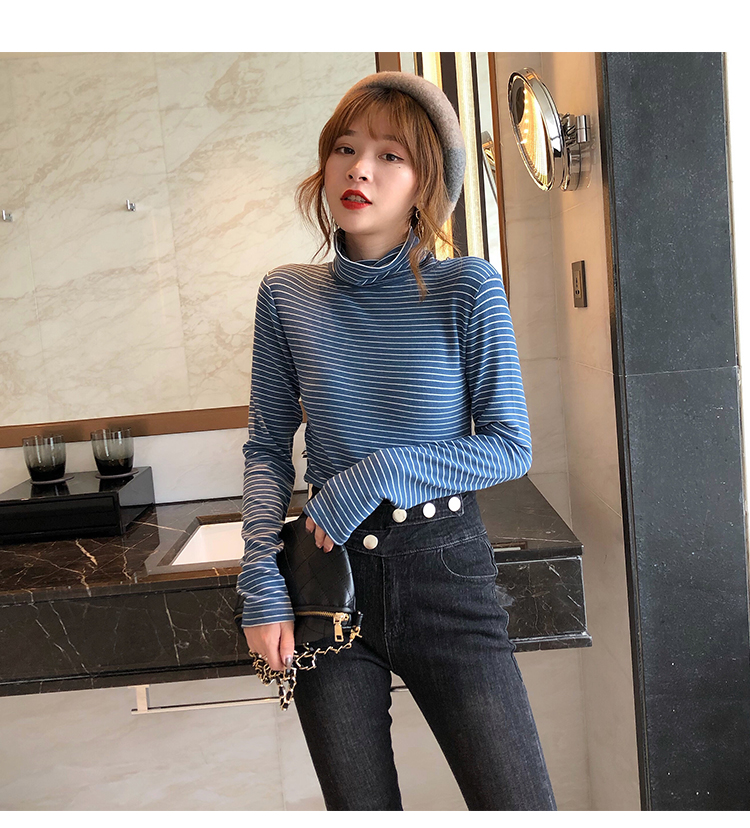 2019秋冬新款韓版條紋長袖T恤女洋氣堆堆領打底衫高領內搭上衣潮1入