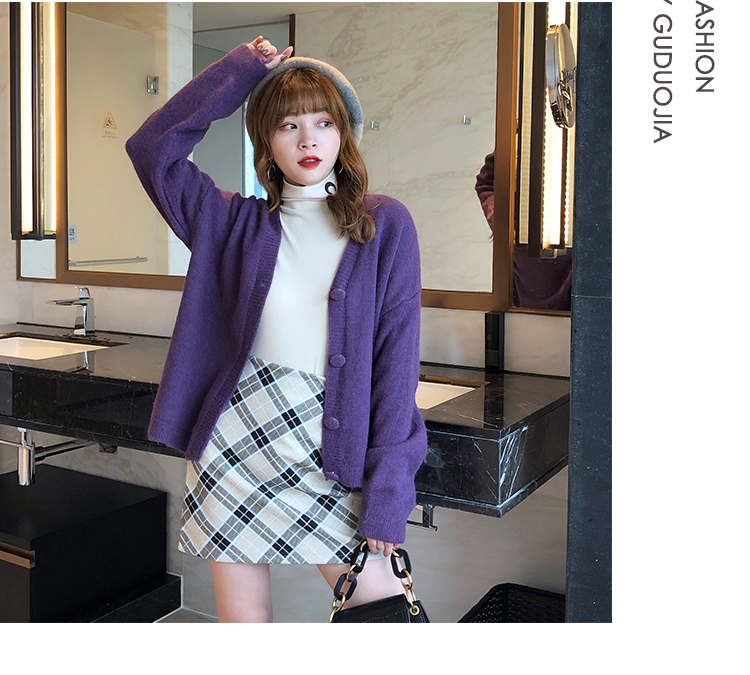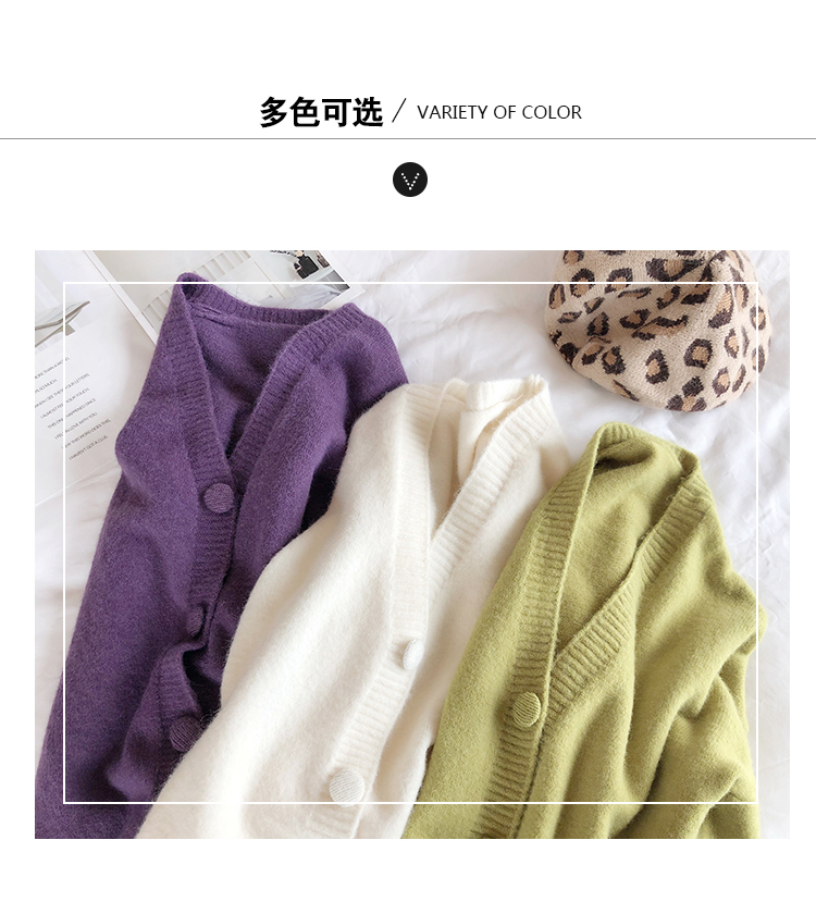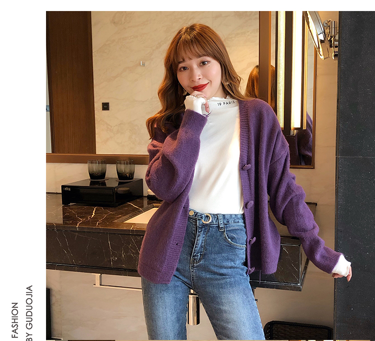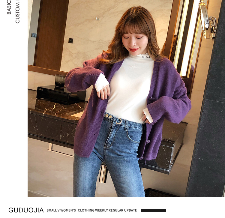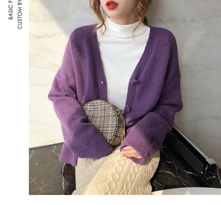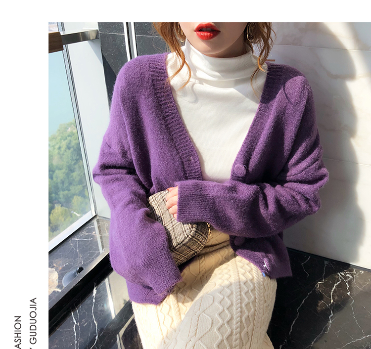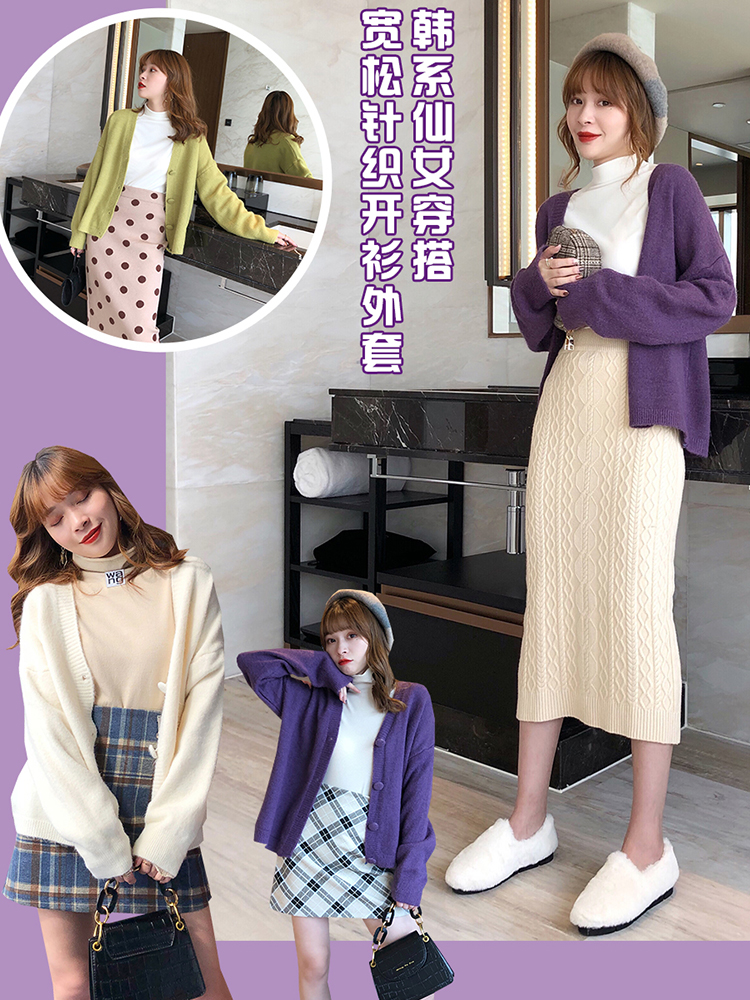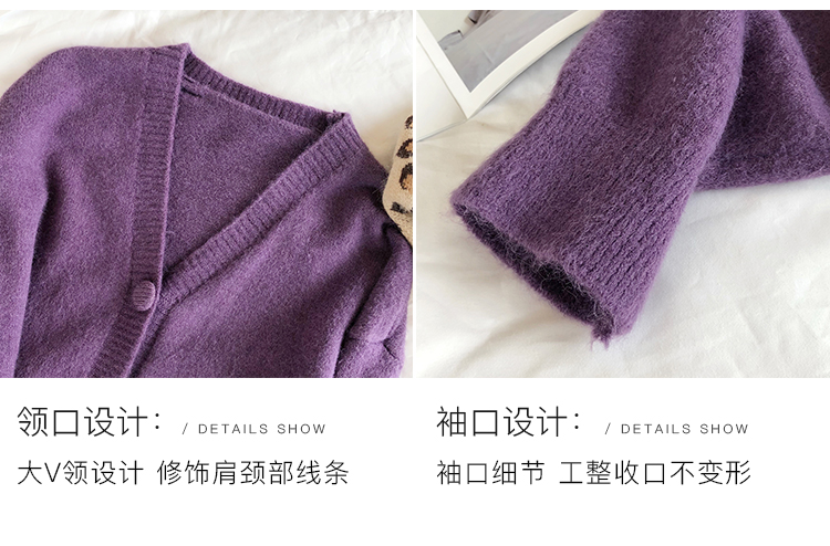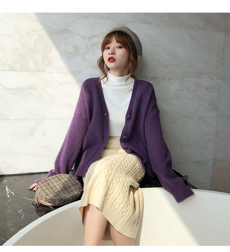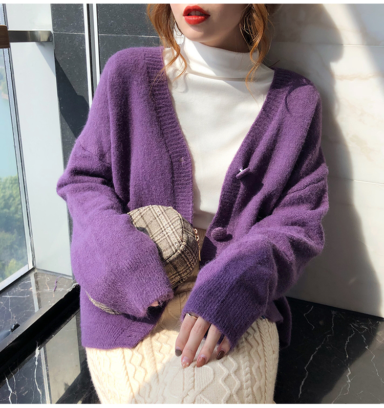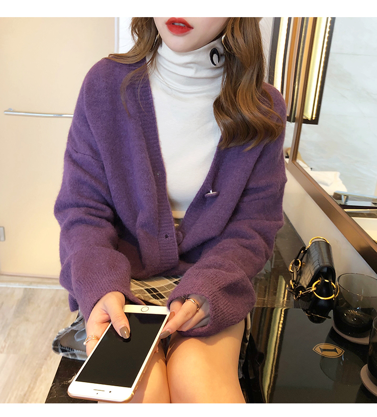 2019秋冬新款寬松外穿針織開衫外套女網紅紫色毛衣V領加厚針織衫1入