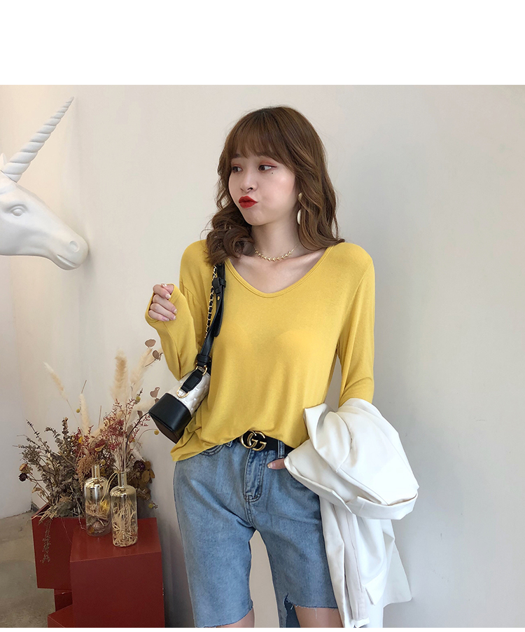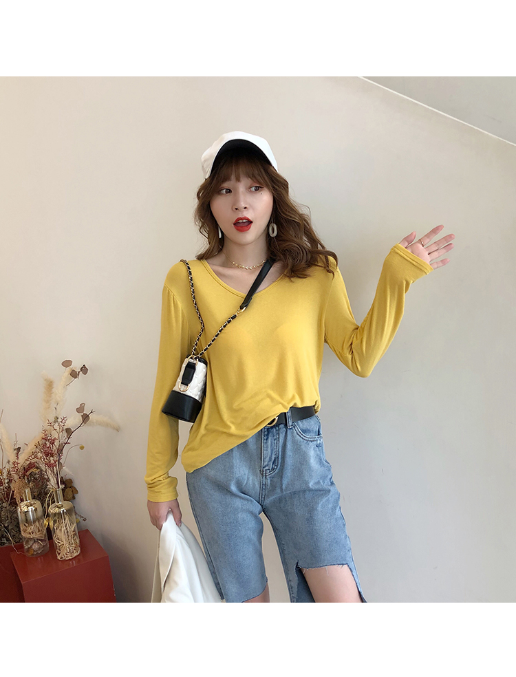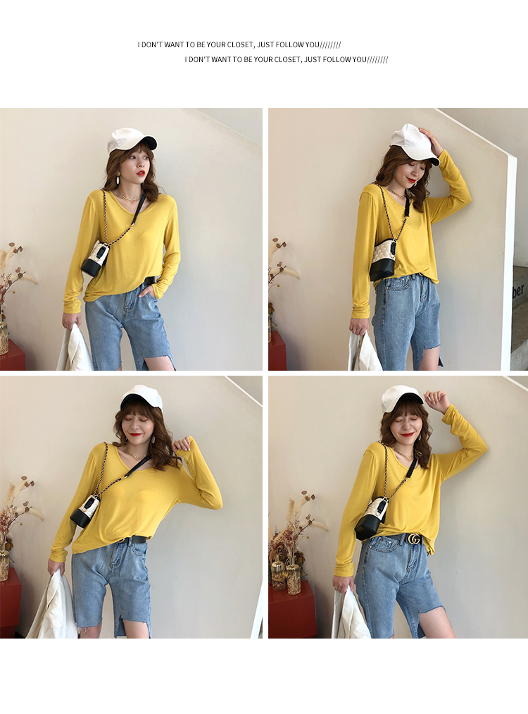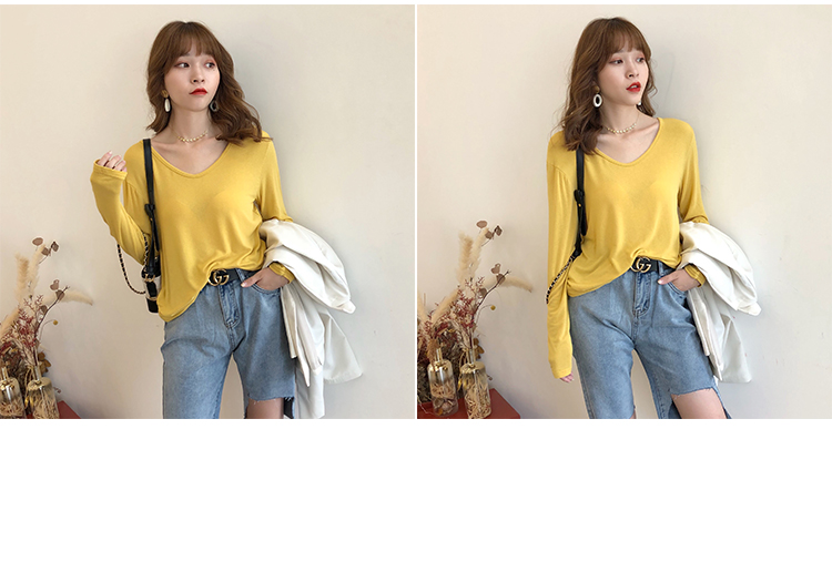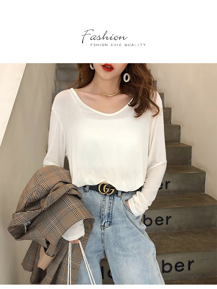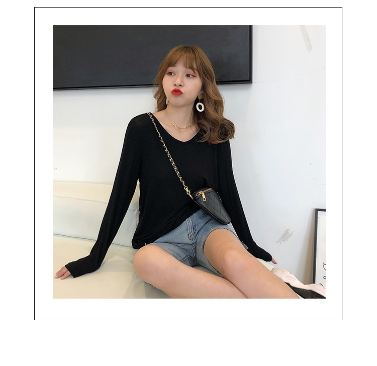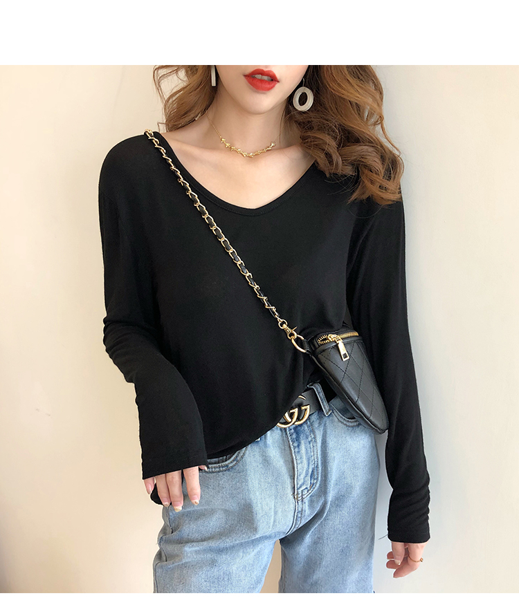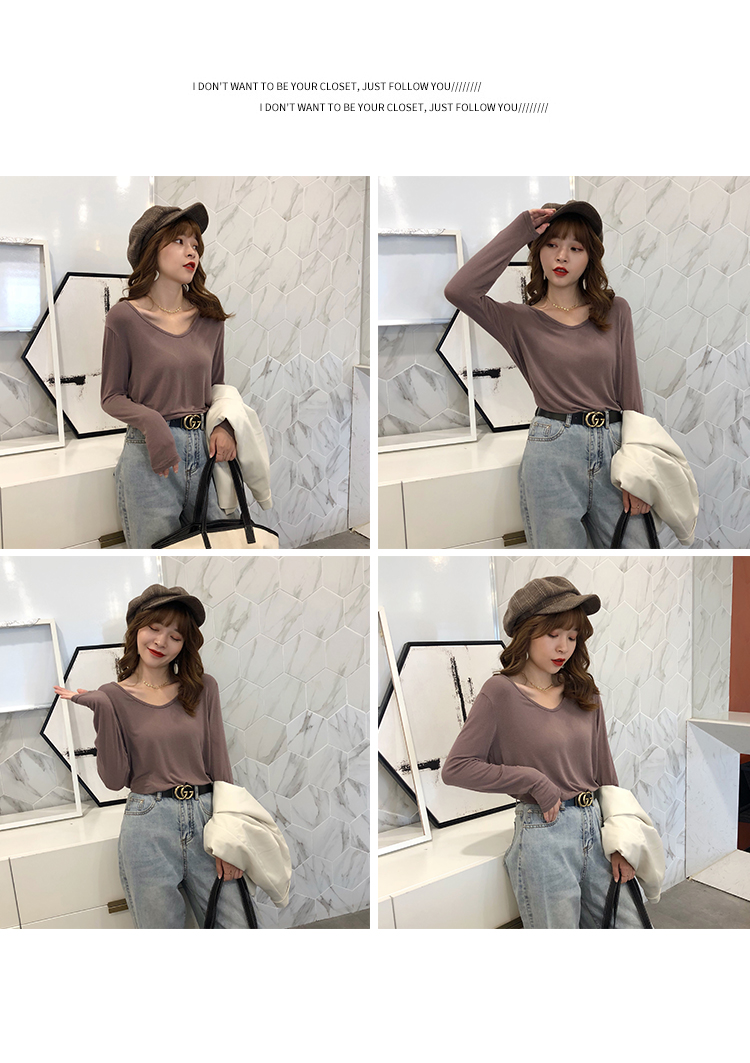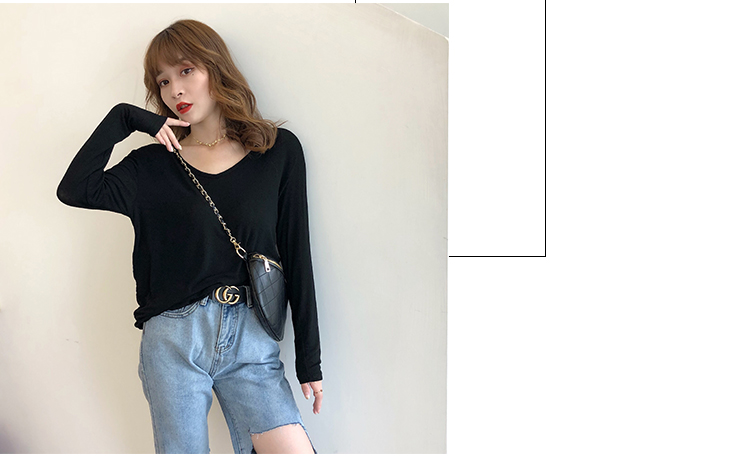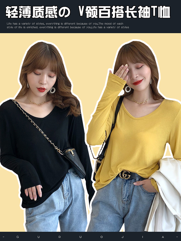 2019秋季新款V領長袖T恤女上衣ins超火寬松韓版薄款打底衫體恤潮1入