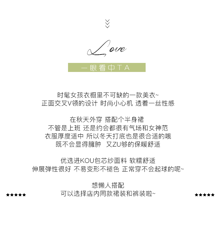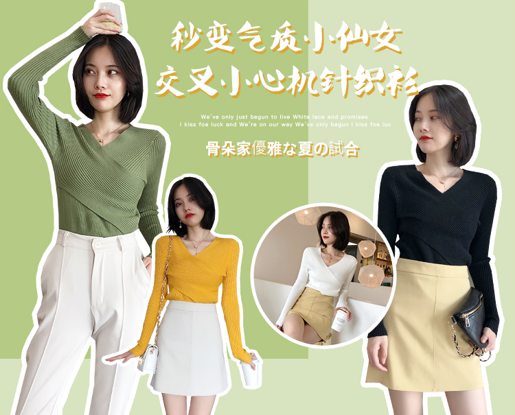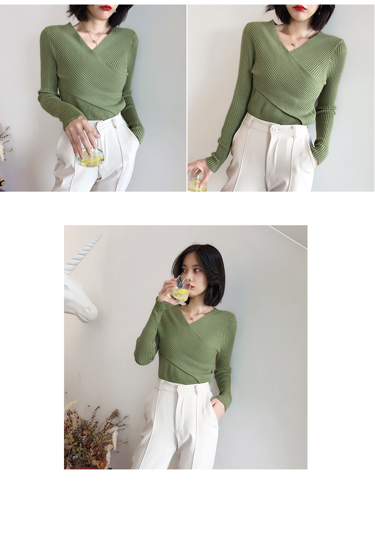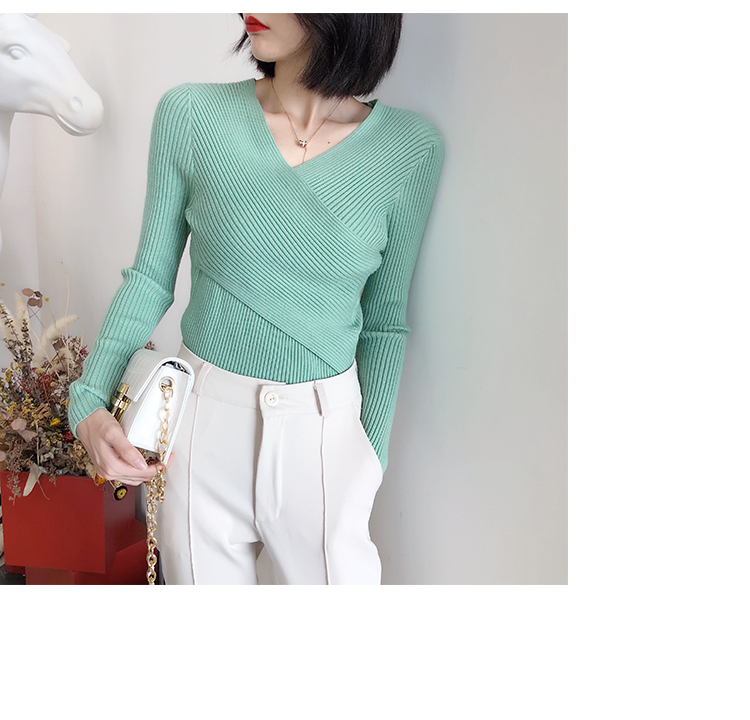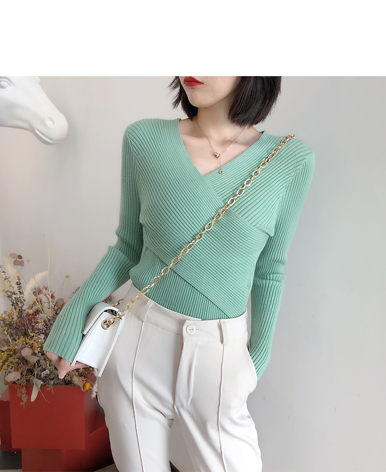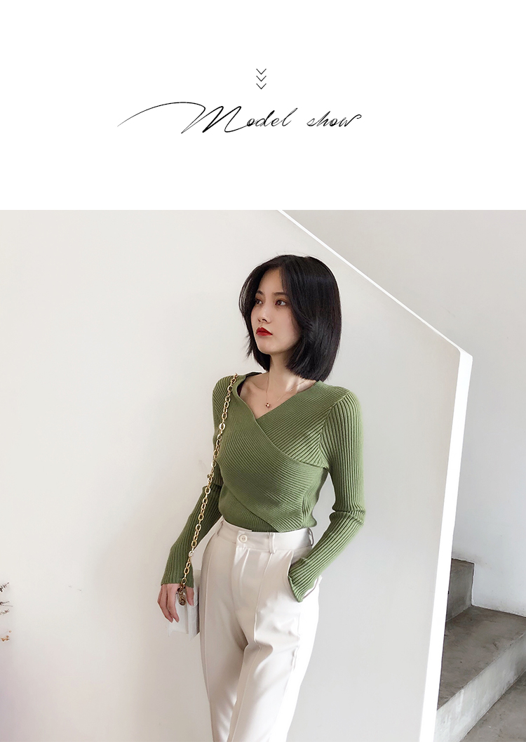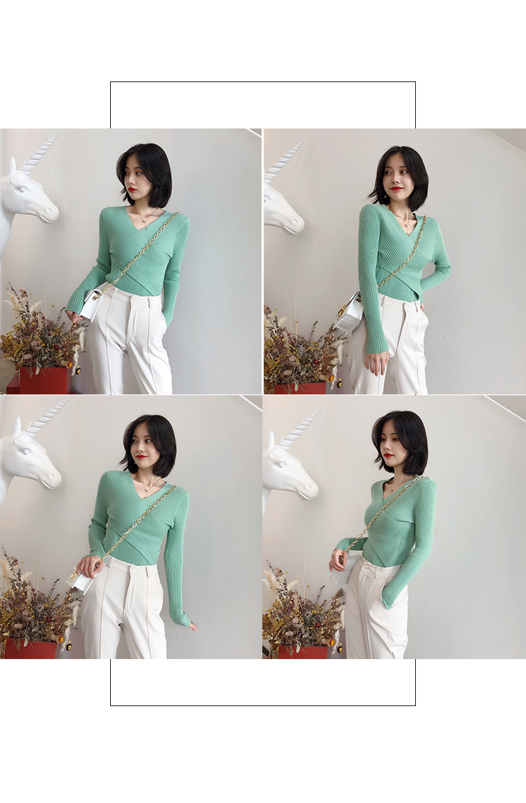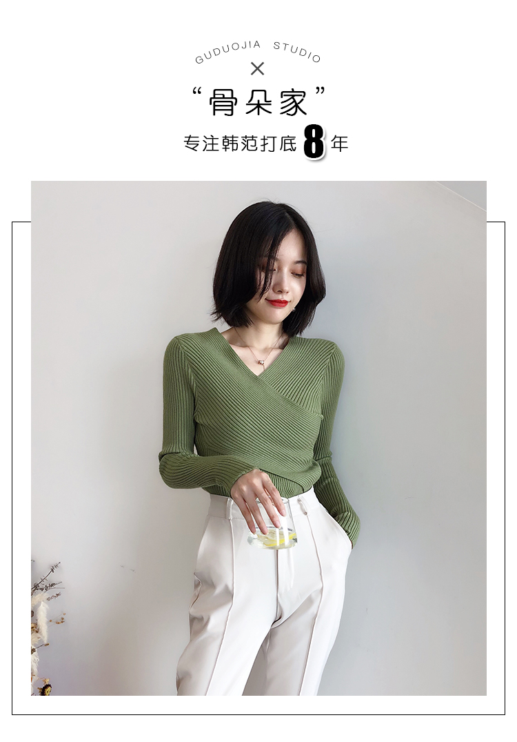 2019秋冬新款V領毛衣女小心機設計感上衣牛油果抹茶綠針織打底衫1入