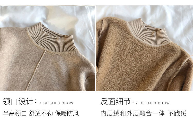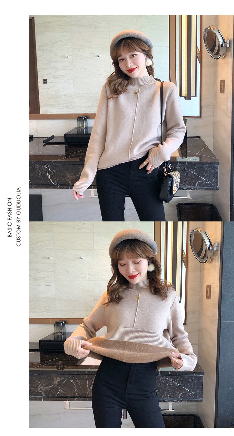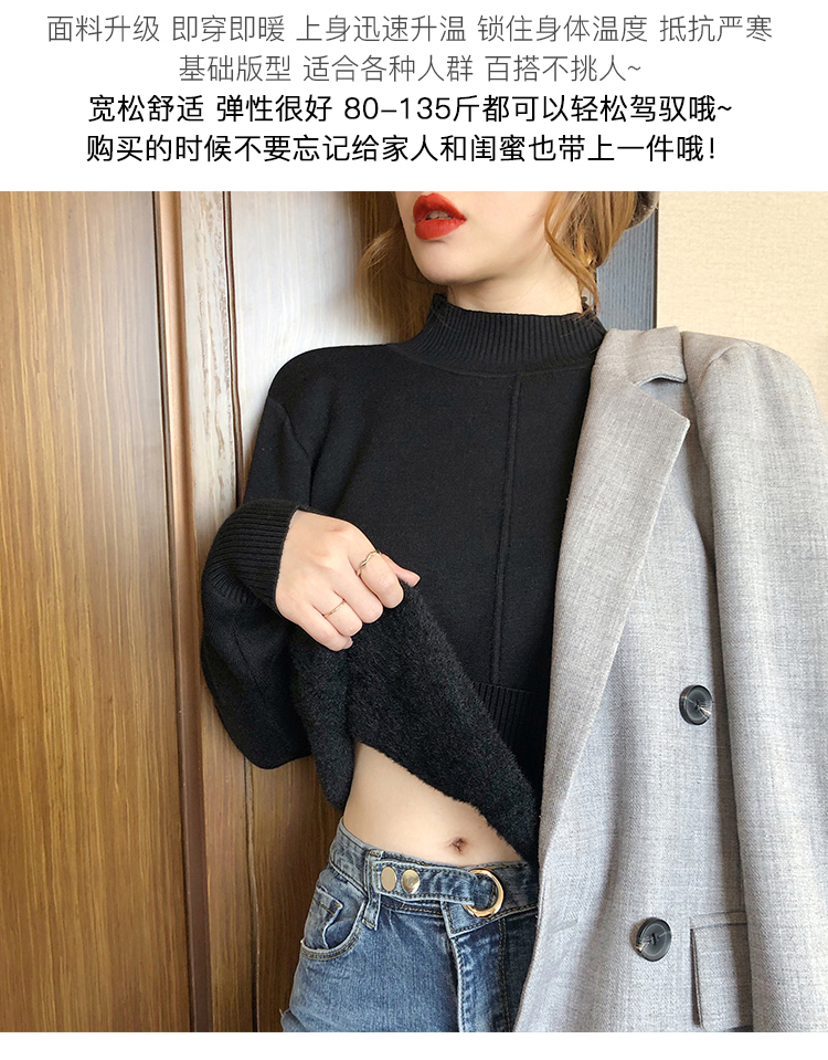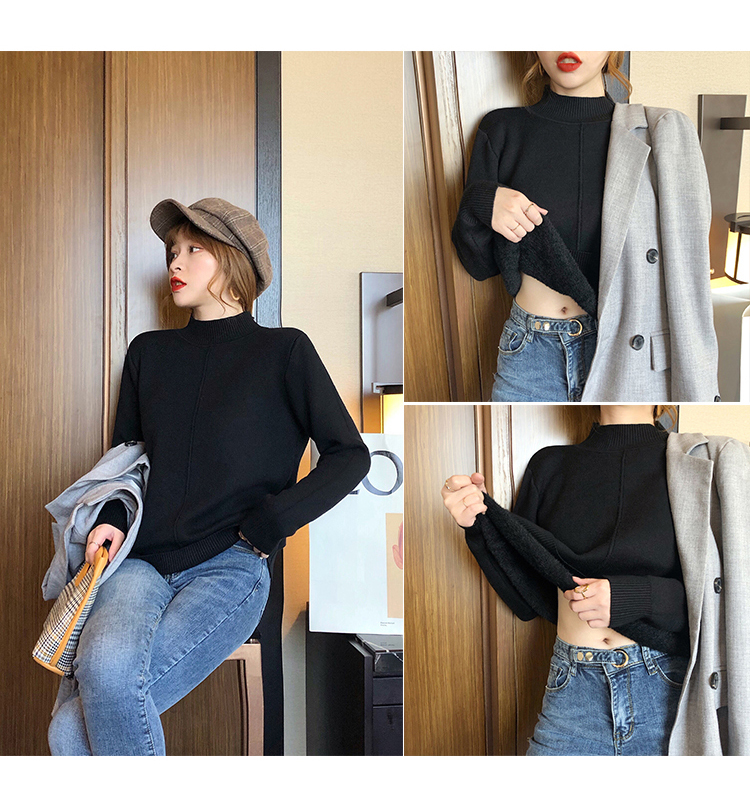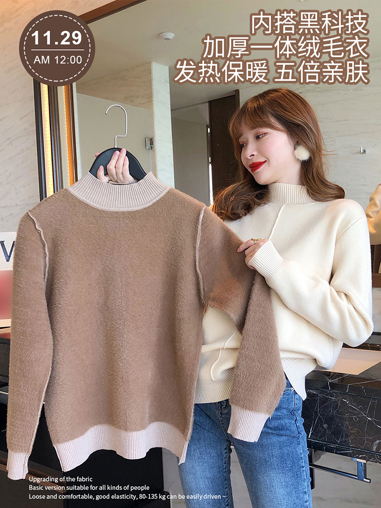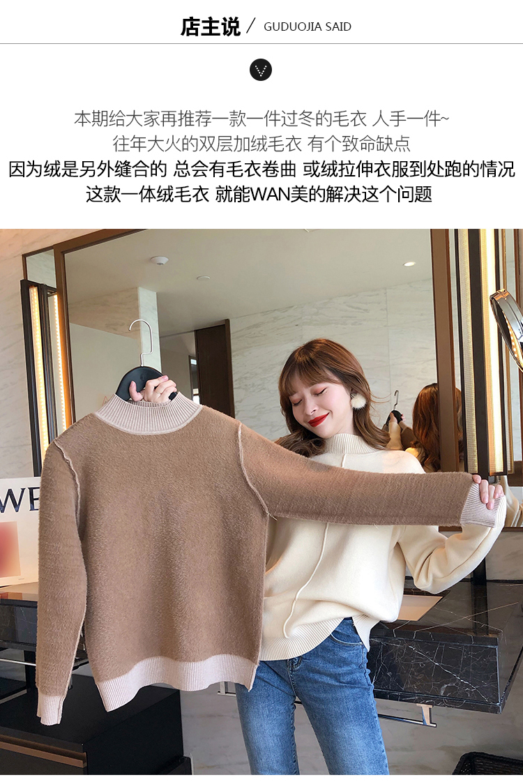 2019秋冬新款加厚一體絨毛衣女半高領寬松針織衫洋氣保暖打底上衣1入