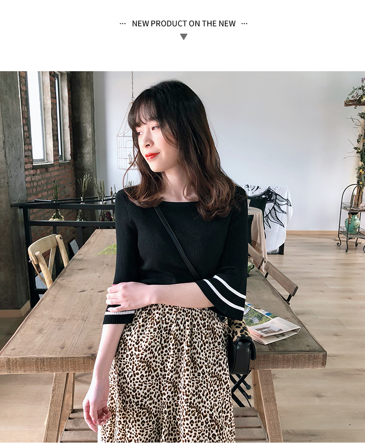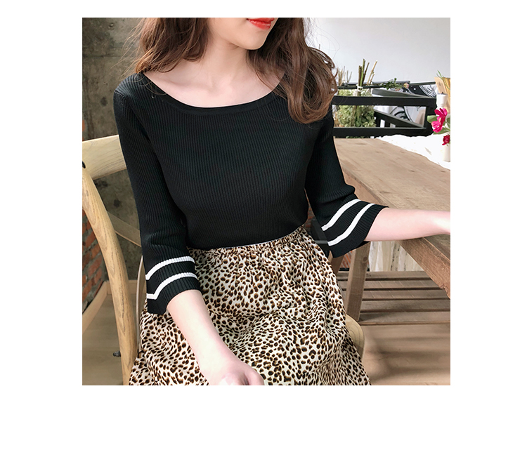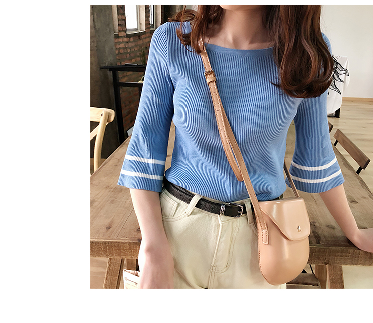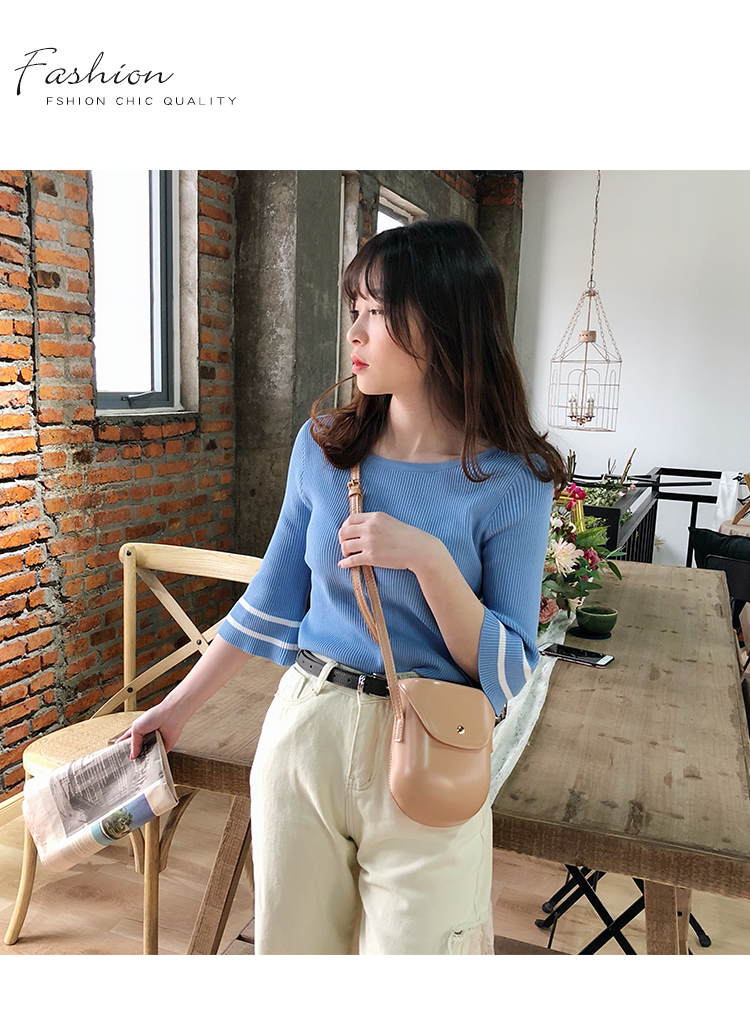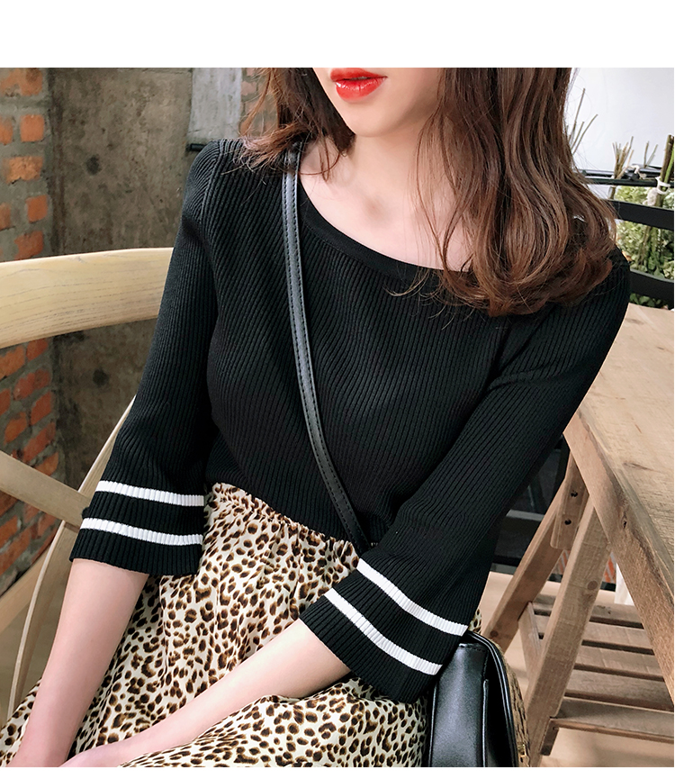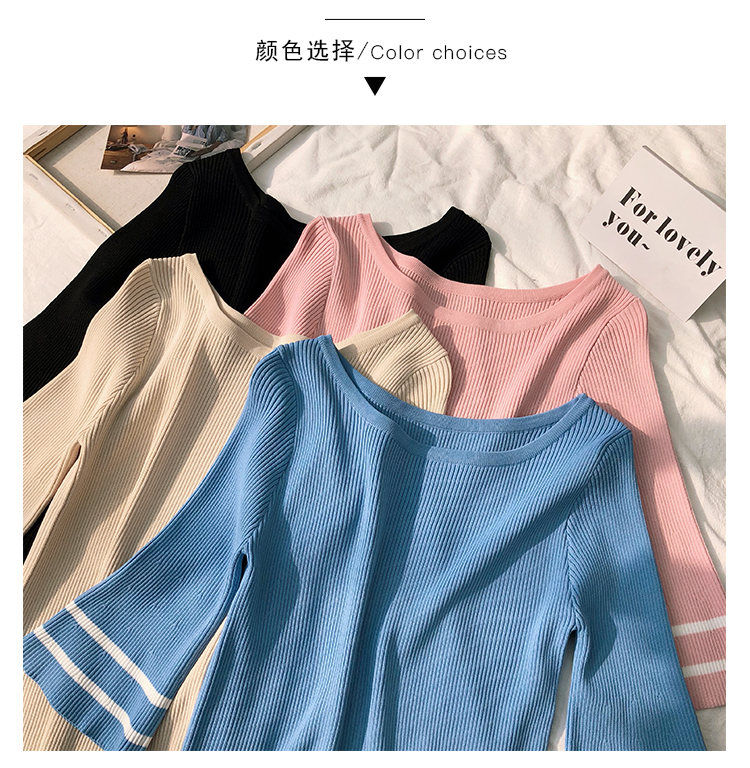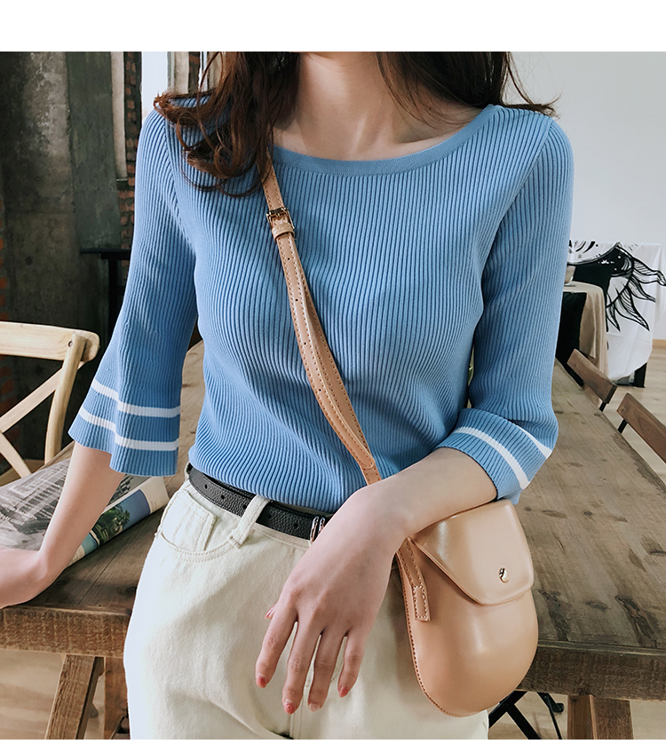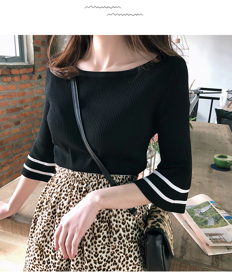 2019春裝新款一字領冰絲針織打底衫女修身內搭喇叭袖上衣短袖T恤1入