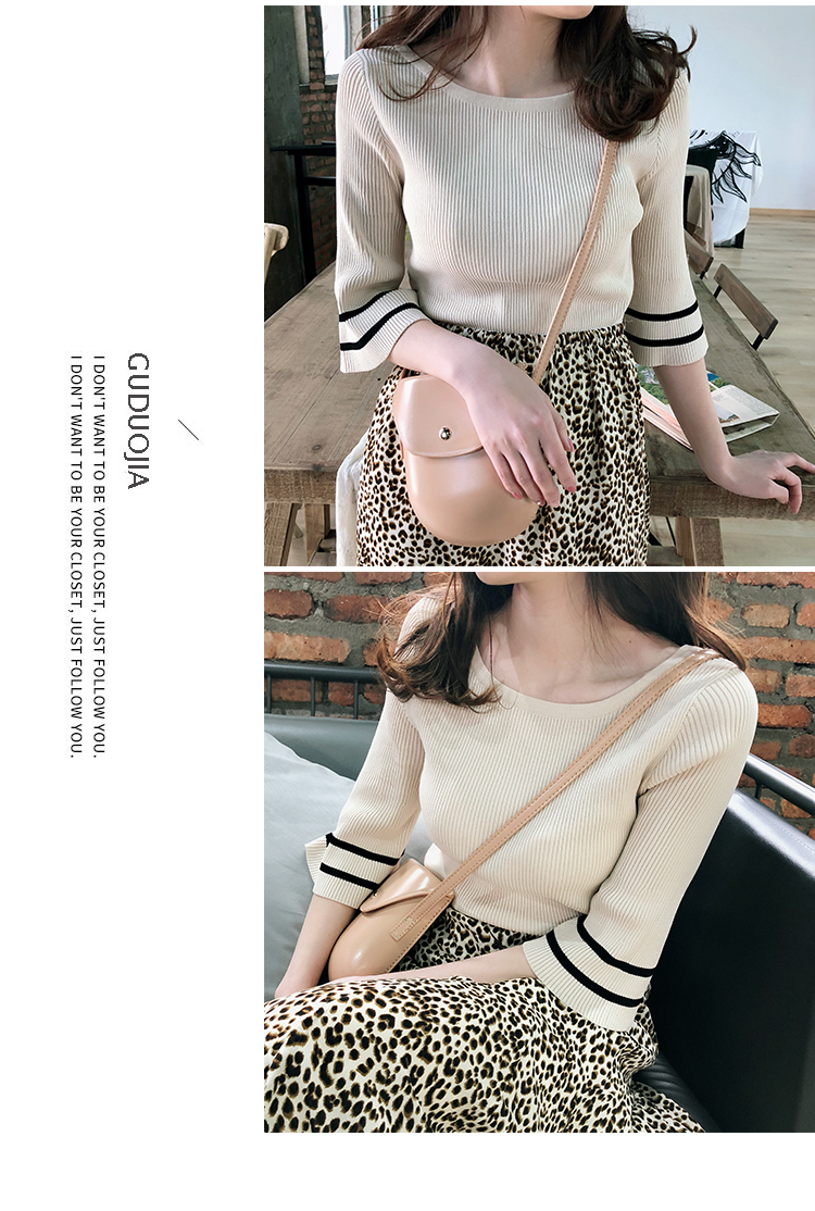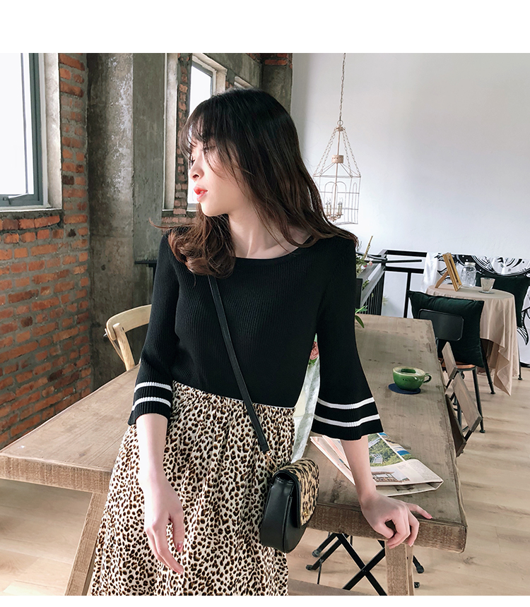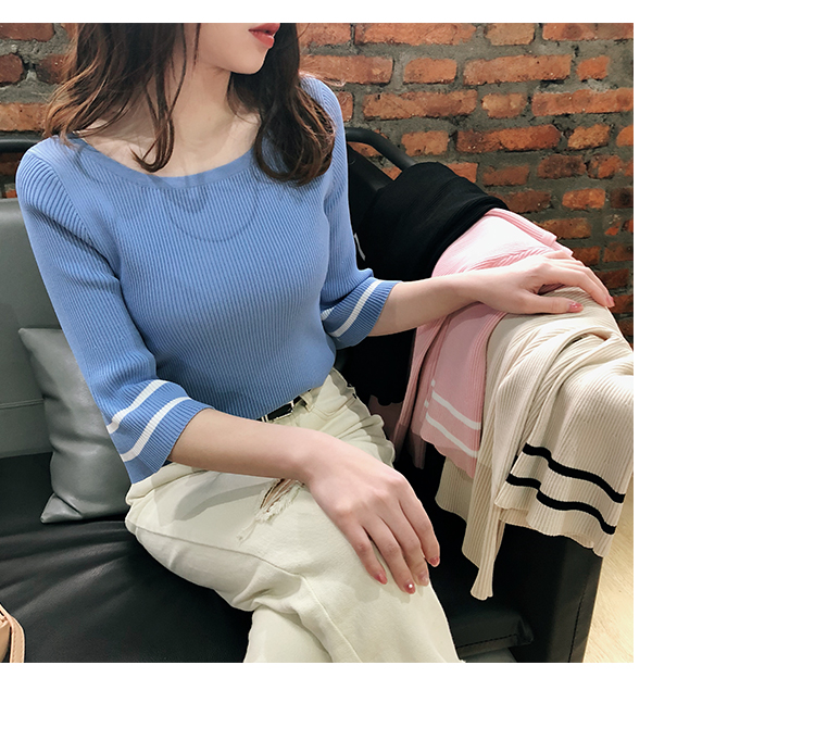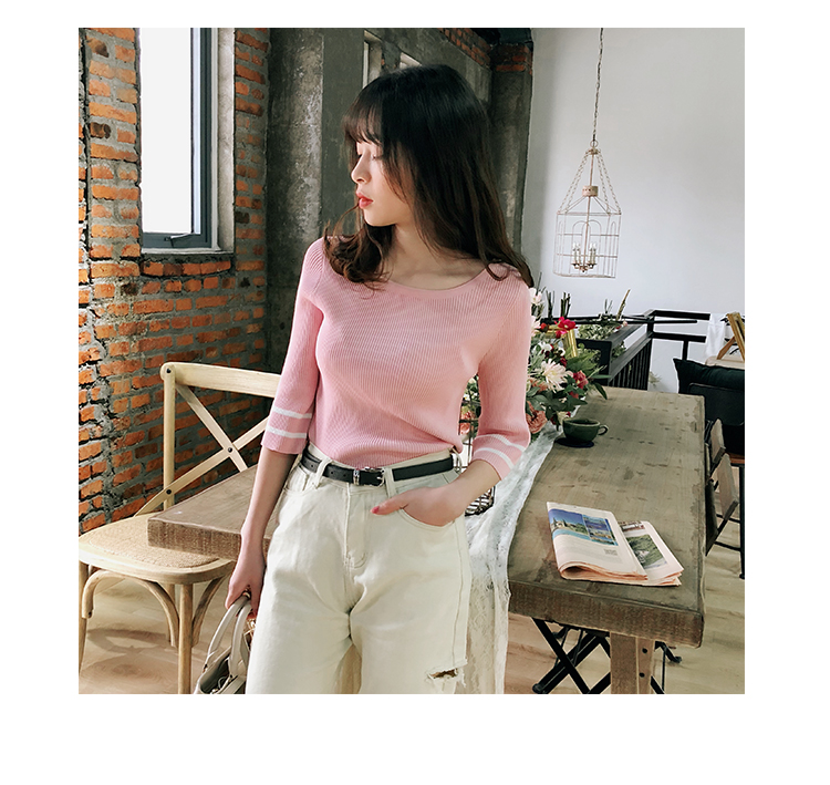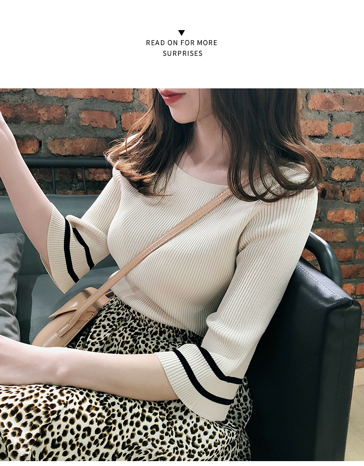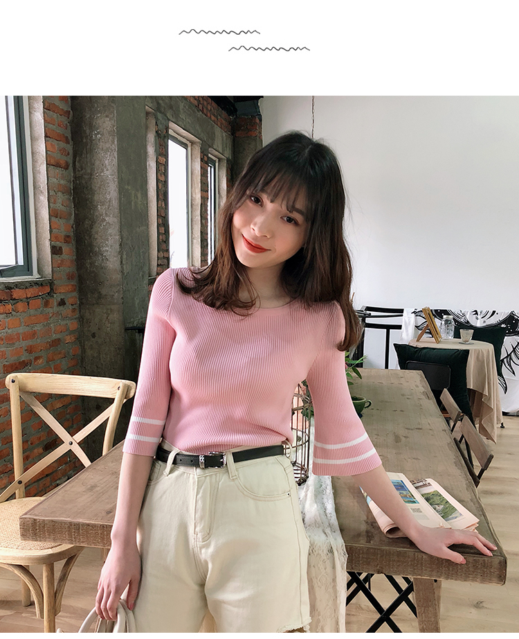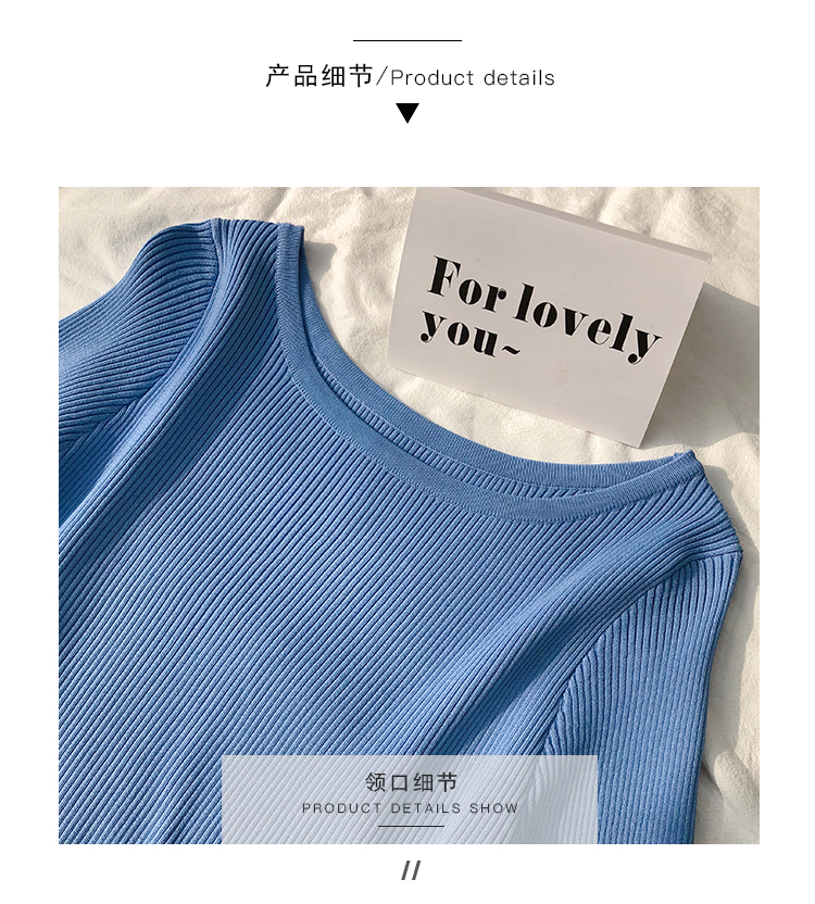 2019春裝新款一字領冰絲針織打底衫女修身內搭喇叭袖上衣短袖T恤1入