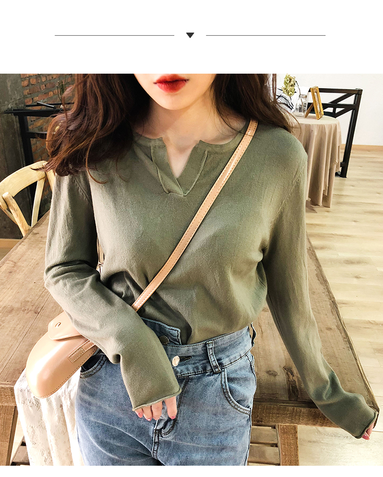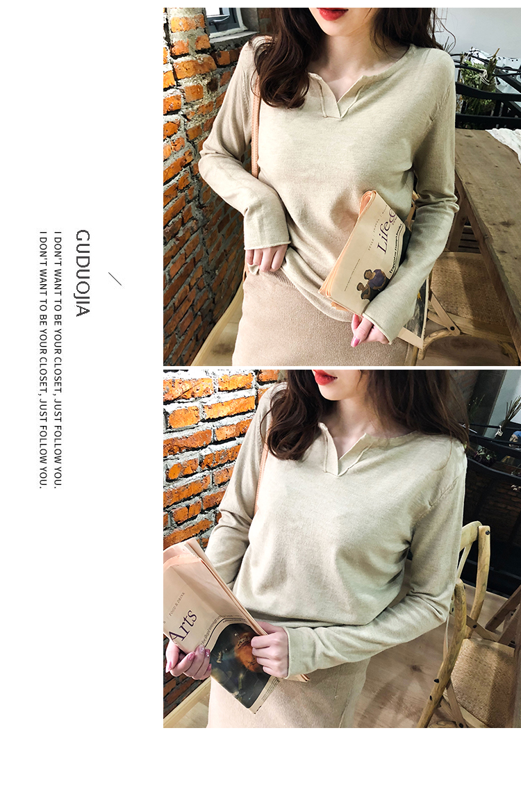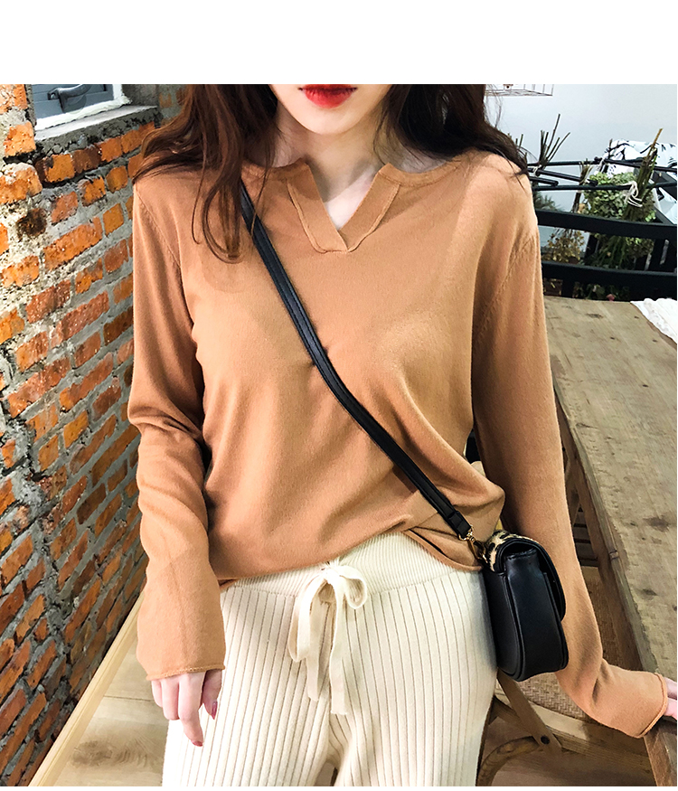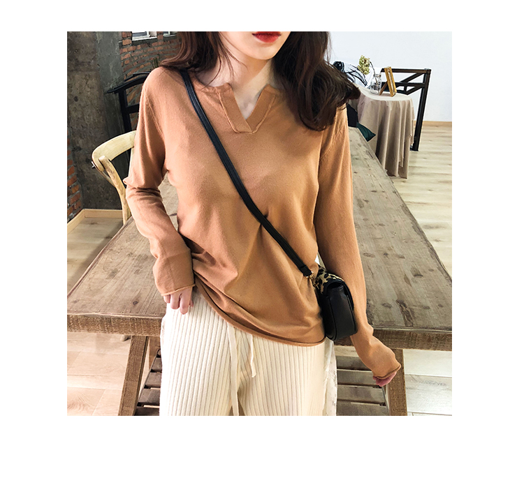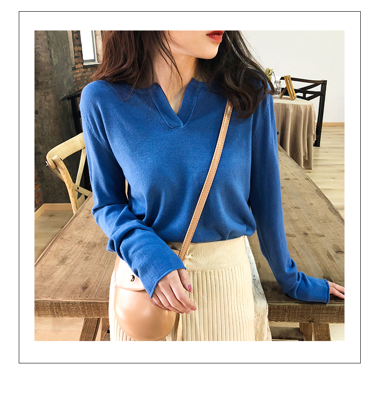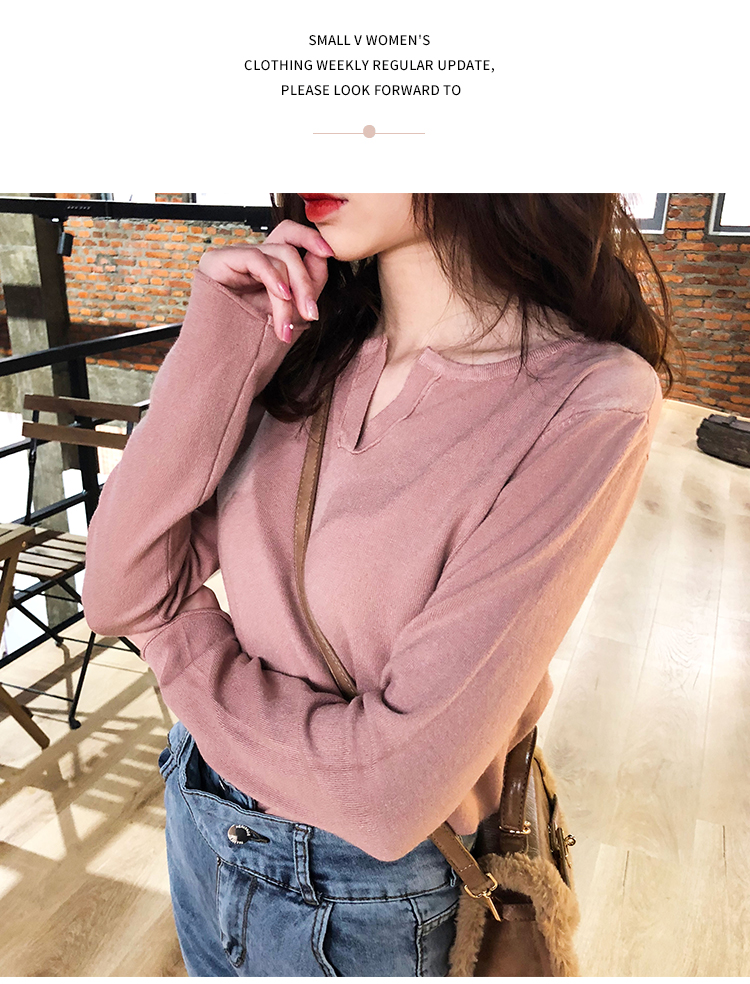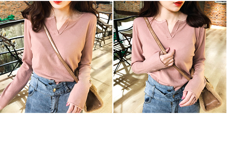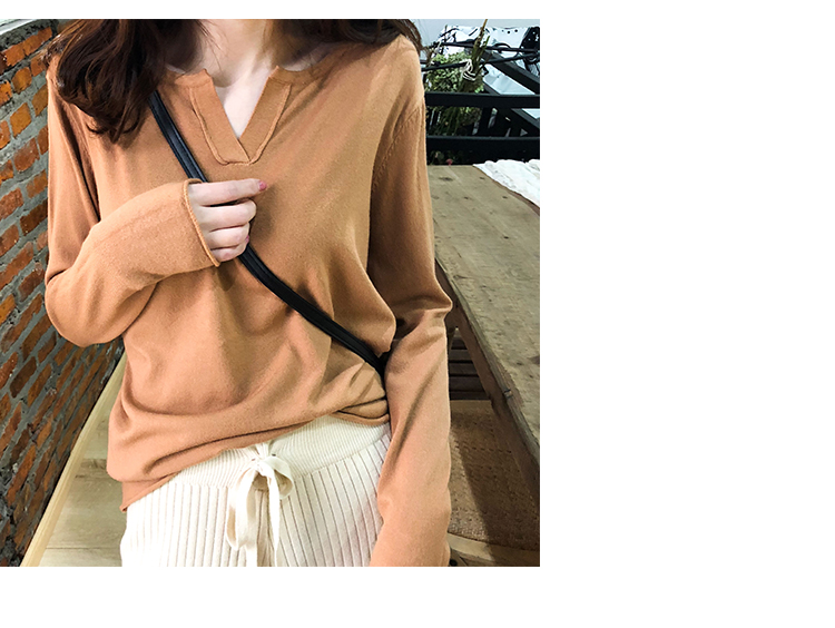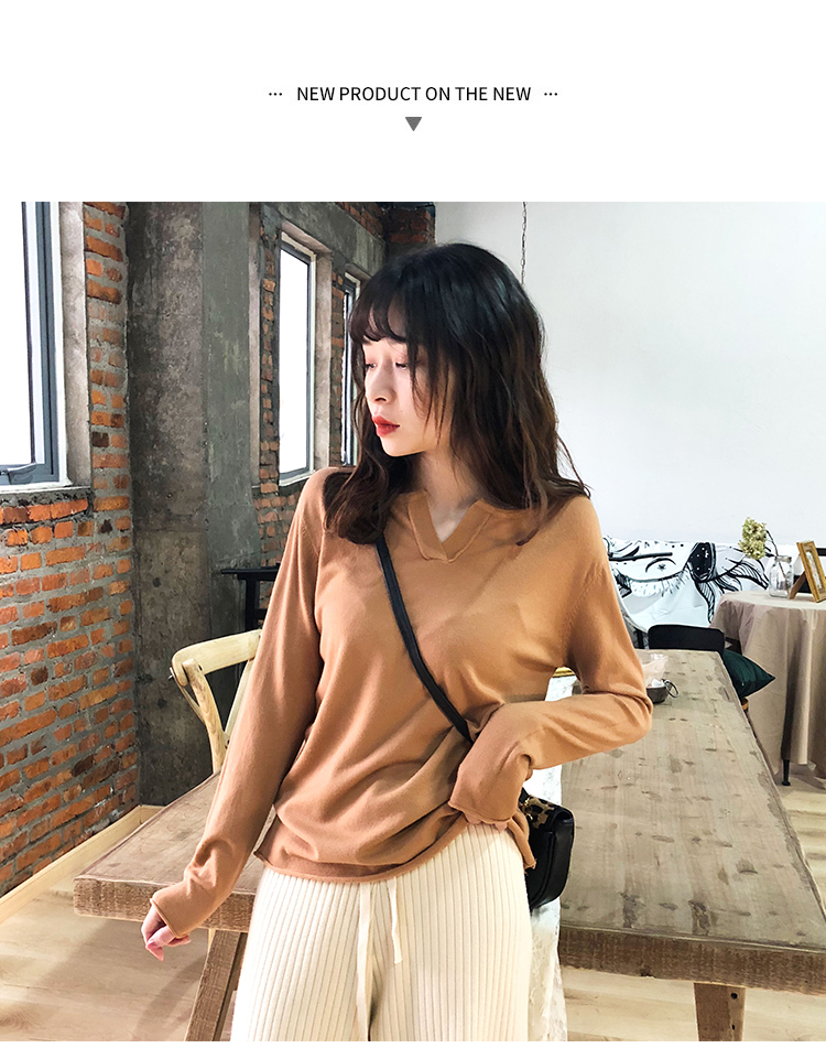 2019秋冬新款寬松外穿V領毛衣女純色韓版薄款針織打底衫內搭上衣1入