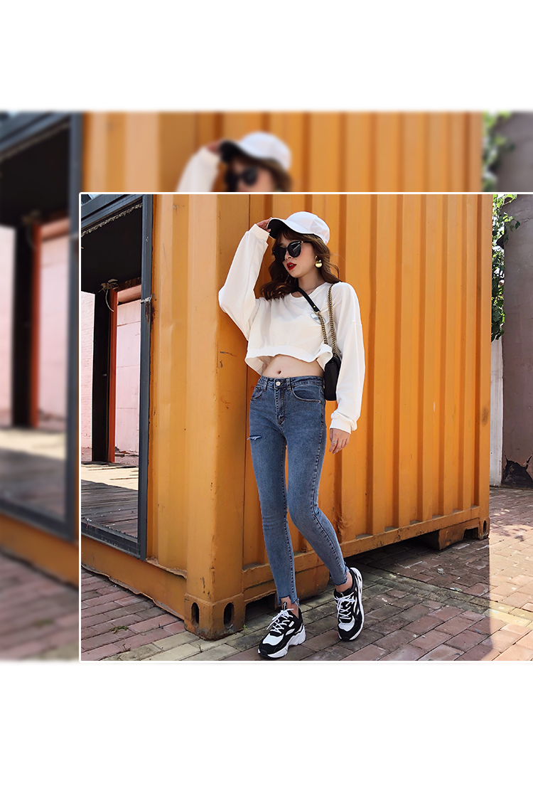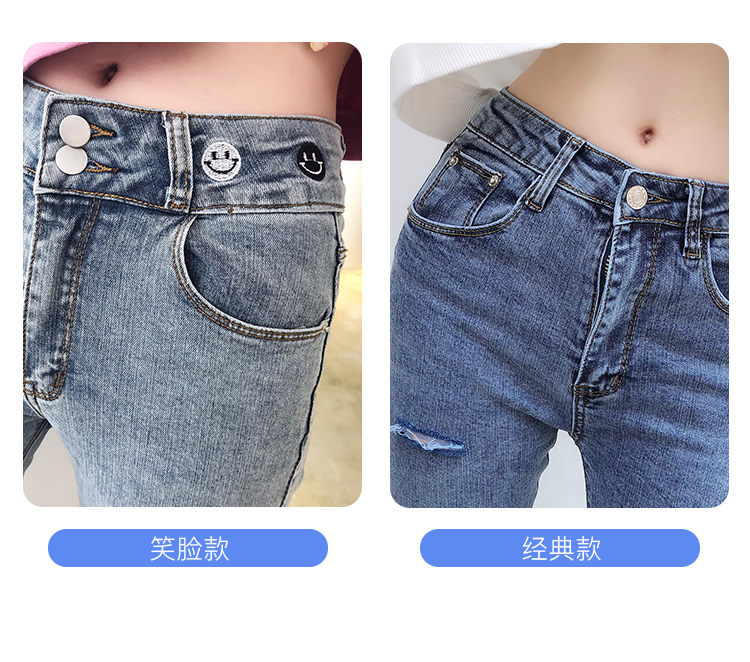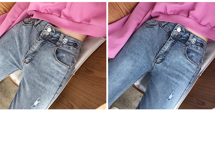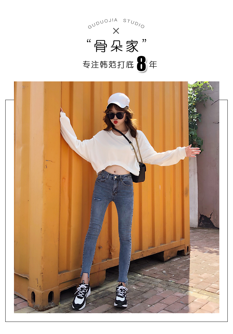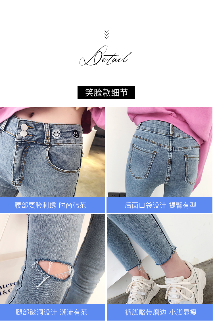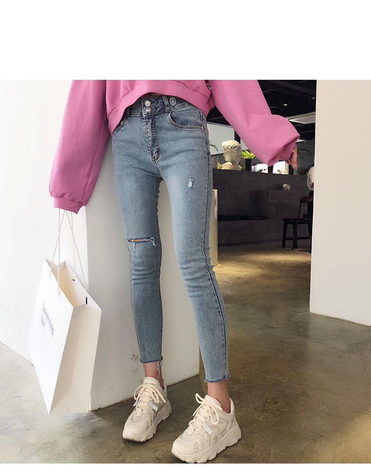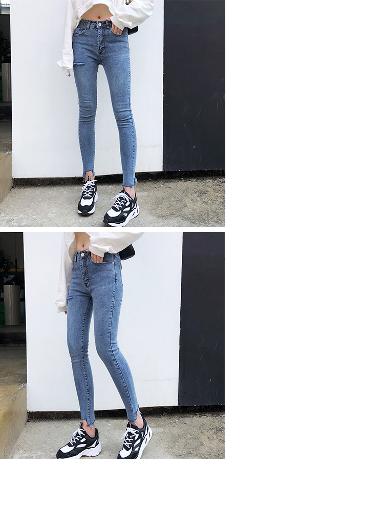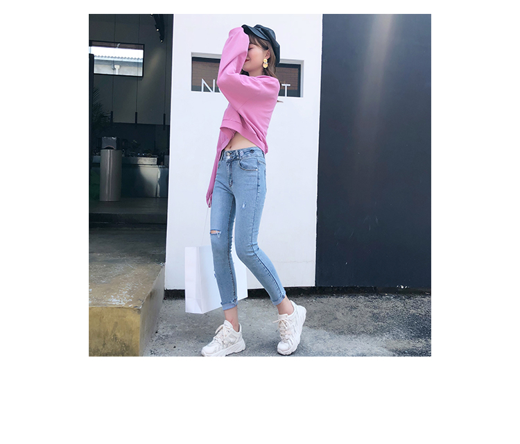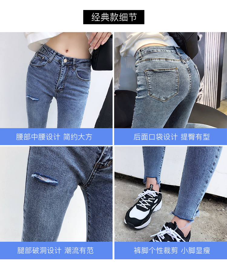 2019秋季新款破洞牛仔褲女高腰顯瘦九分小腳褲韓版緊身百搭鉛筆褲1入