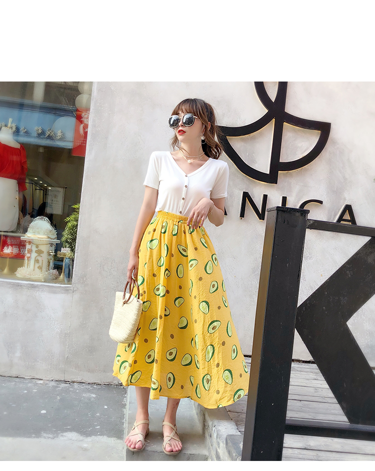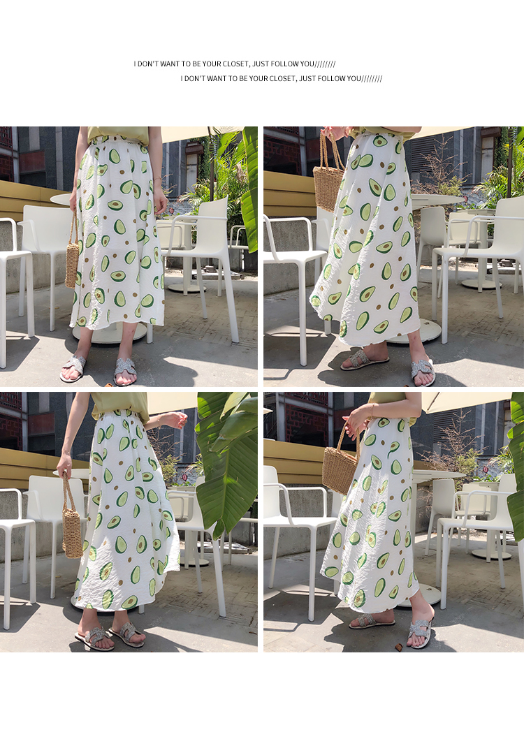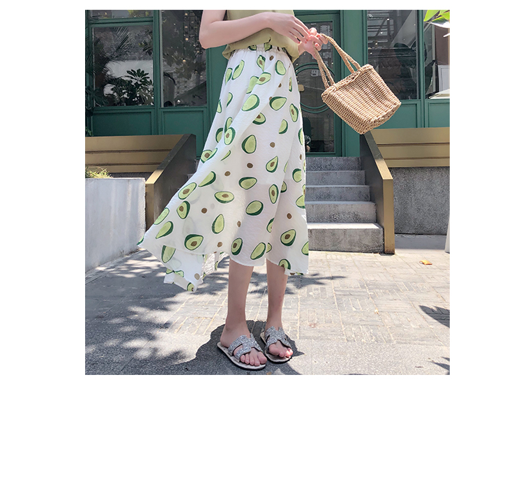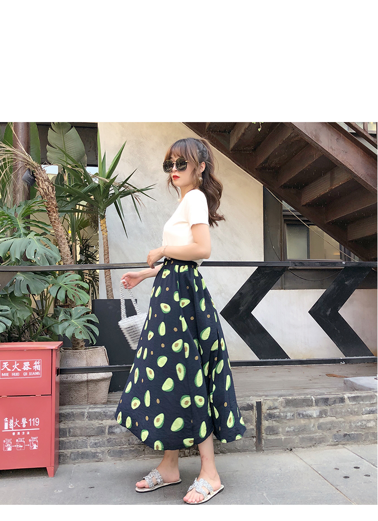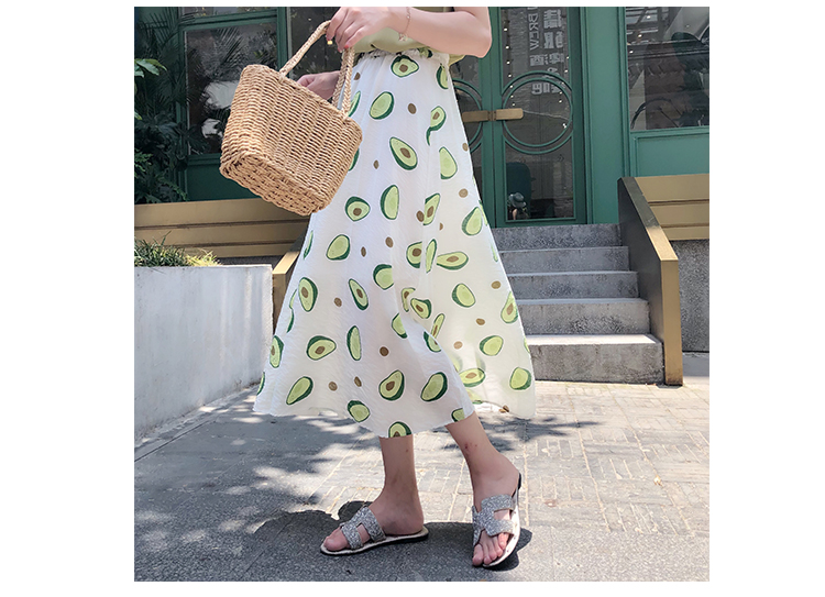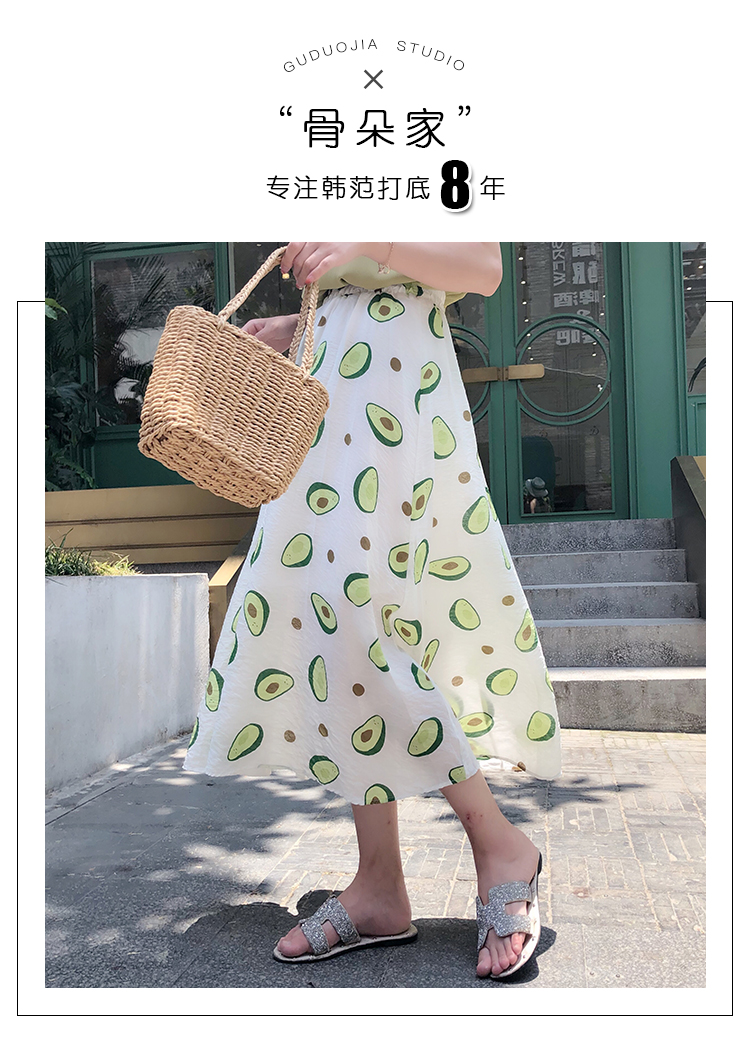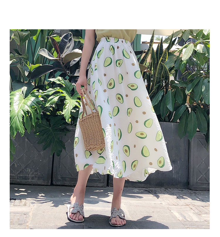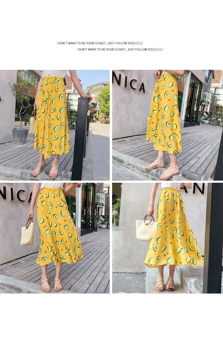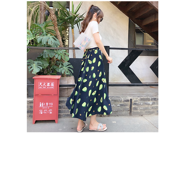 泫雅風印花牛油果雪紡半身裙女高腰顯瘦中長款棉麻A字大擺裙子夏1入