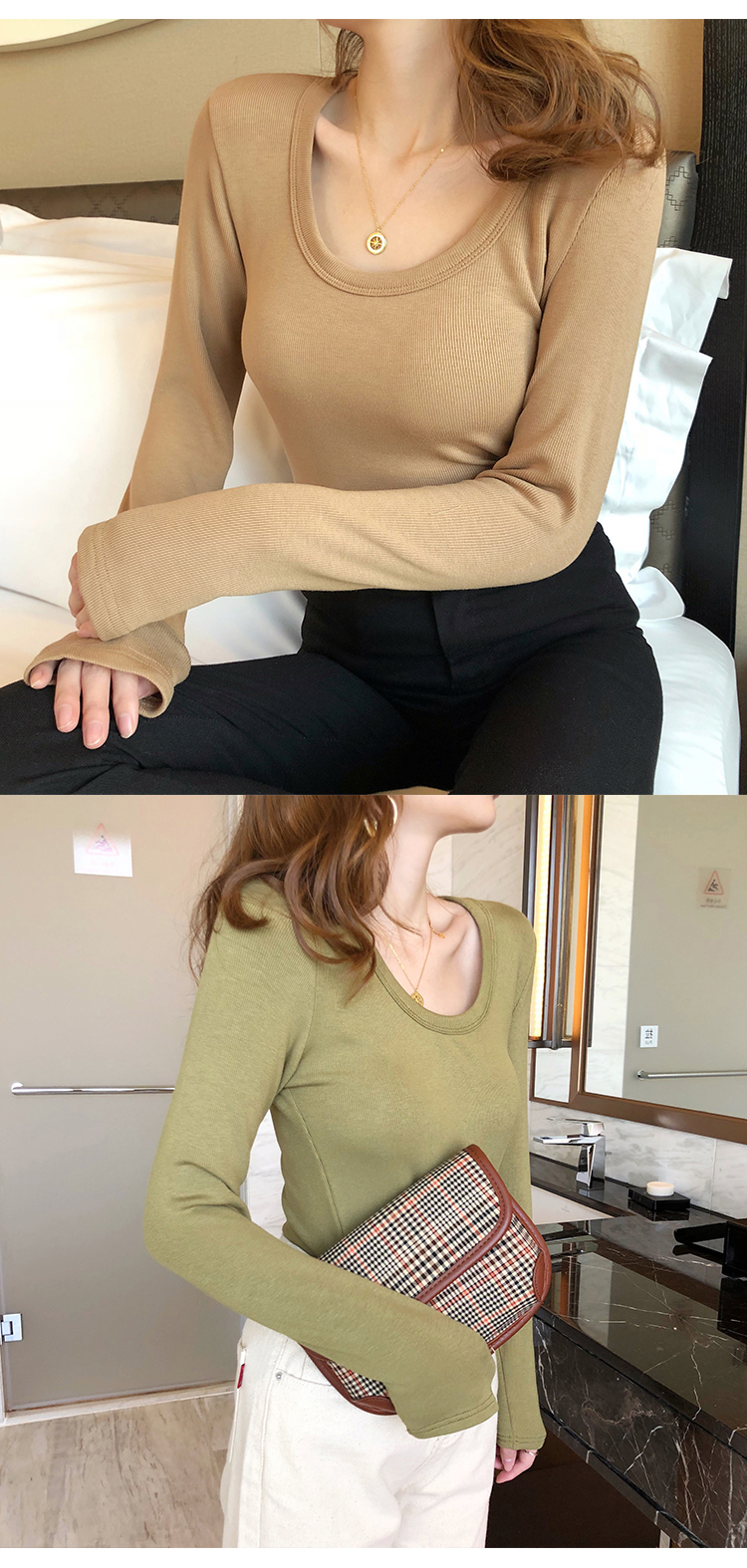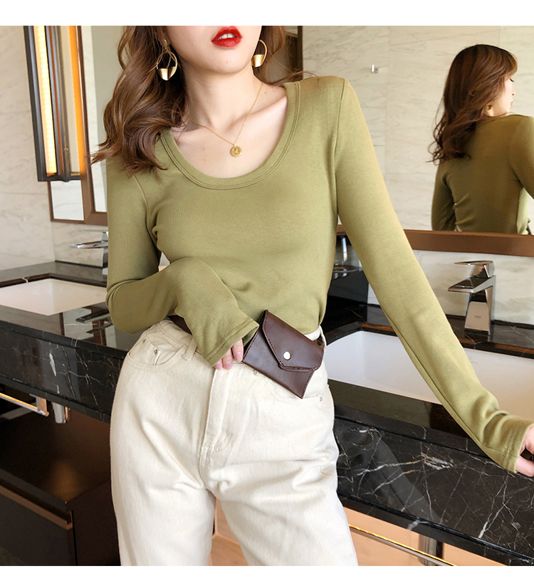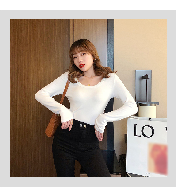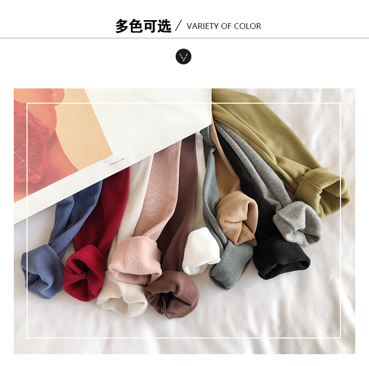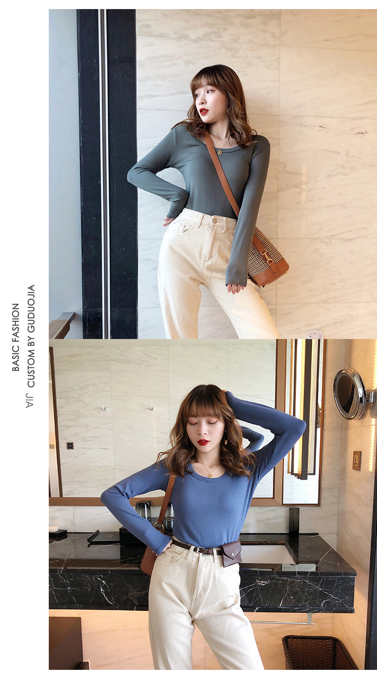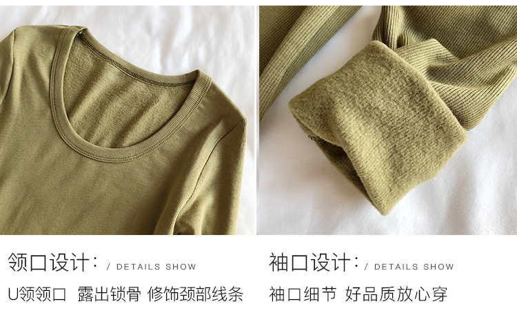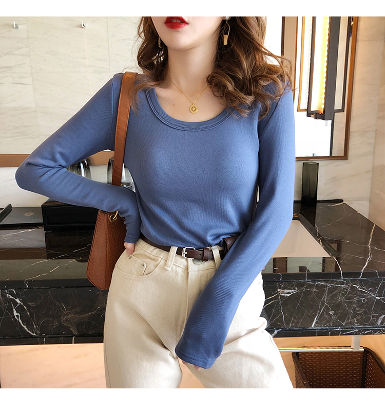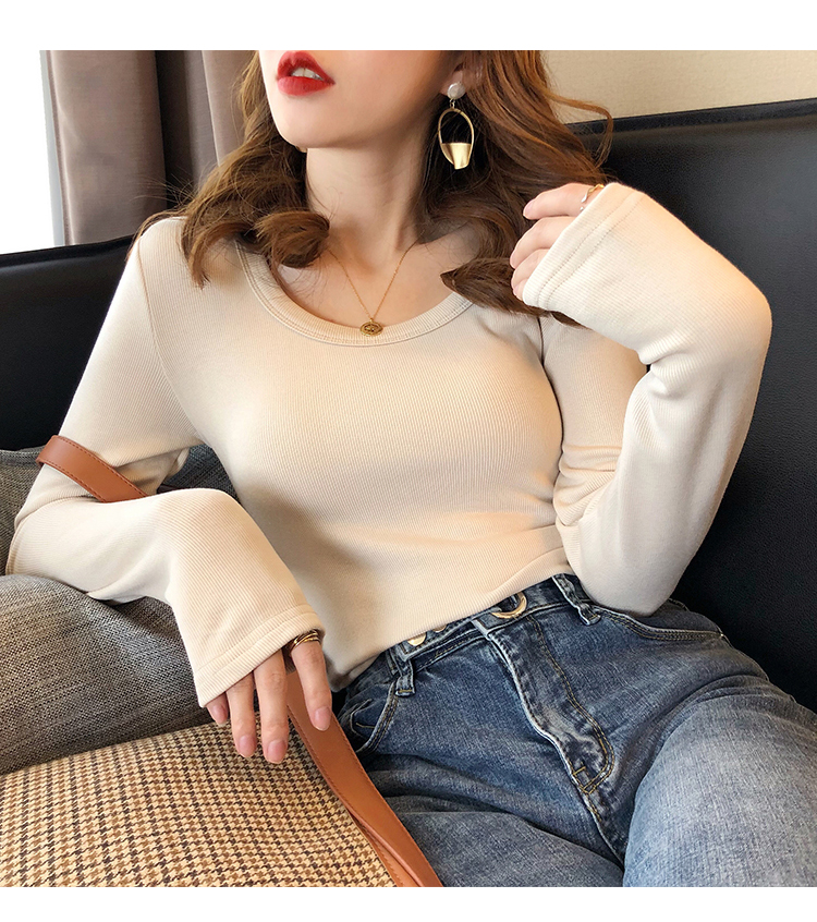 2019秋冬新款加絨打底衫女長袖圓領簡約加厚t恤修身百搭短款上衣1入