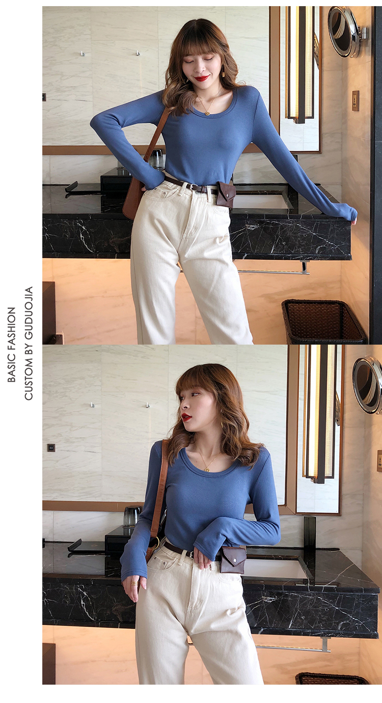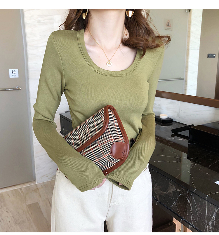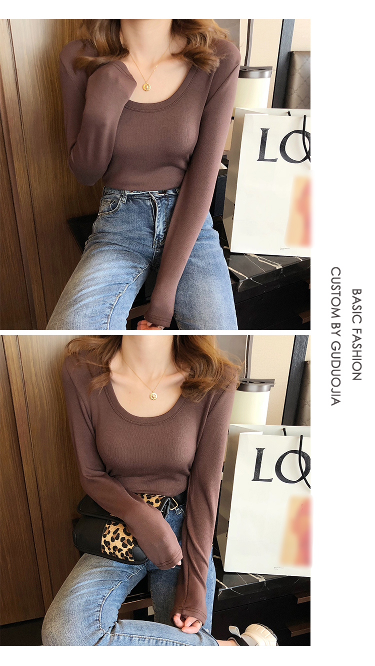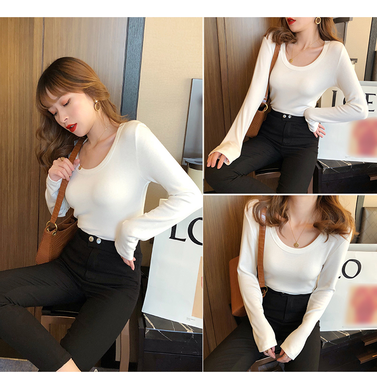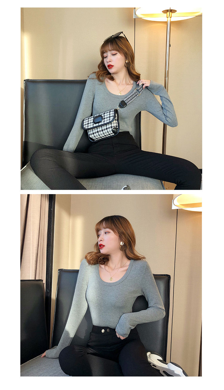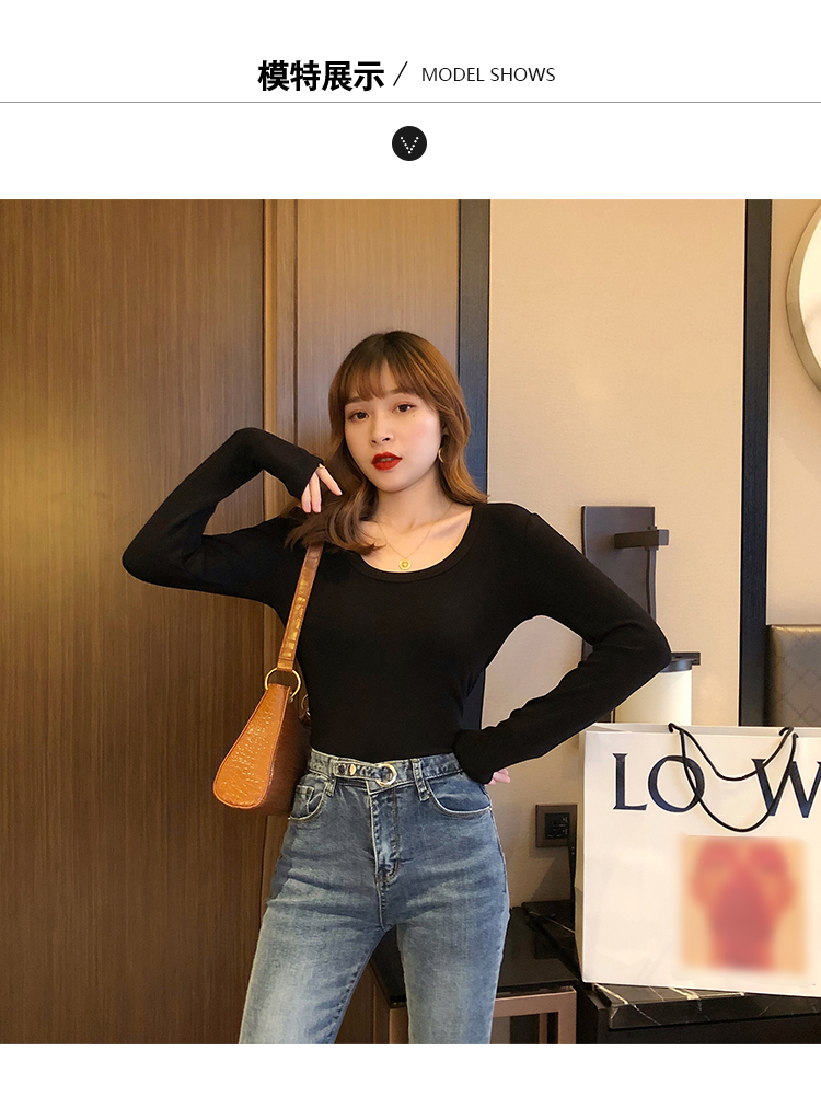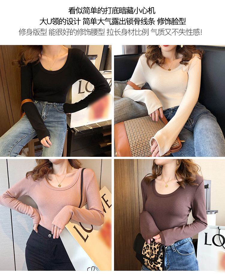 2019秋冬新款加絨打底衫女長袖圓領簡約加厚t恤修身百搭短款上衣1入
