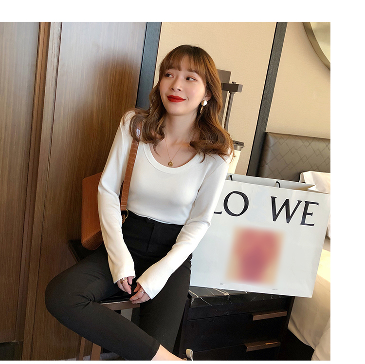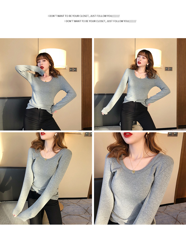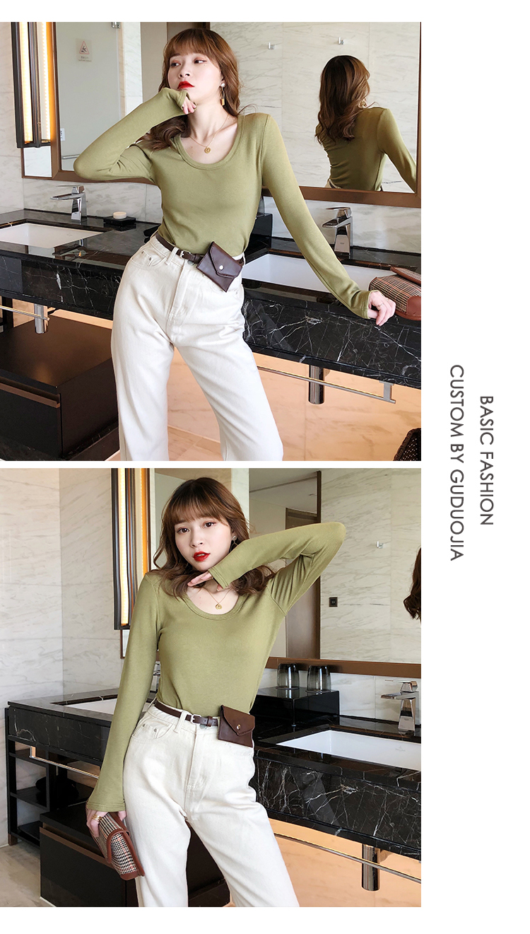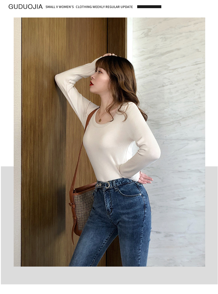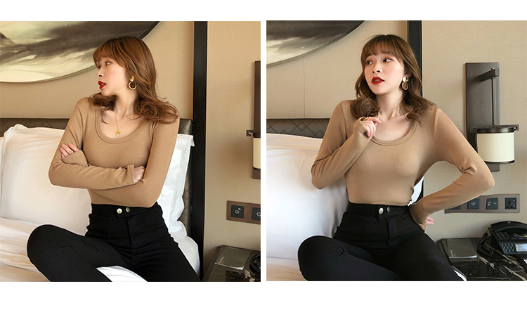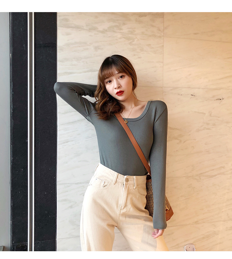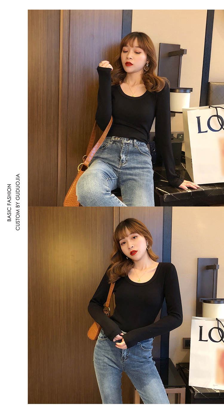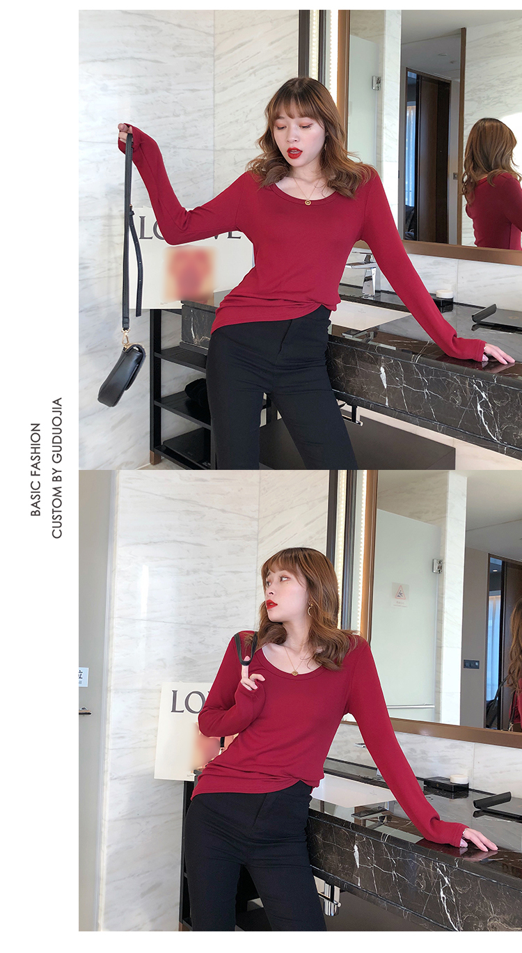 2019秋冬新款加絨打底衫女長袖圓領簡約加厚t恤修身百搭短款上衣1入