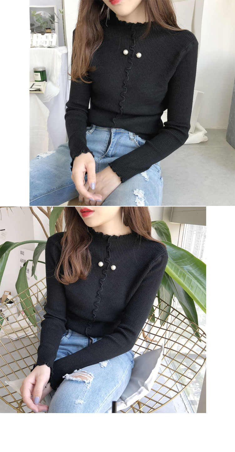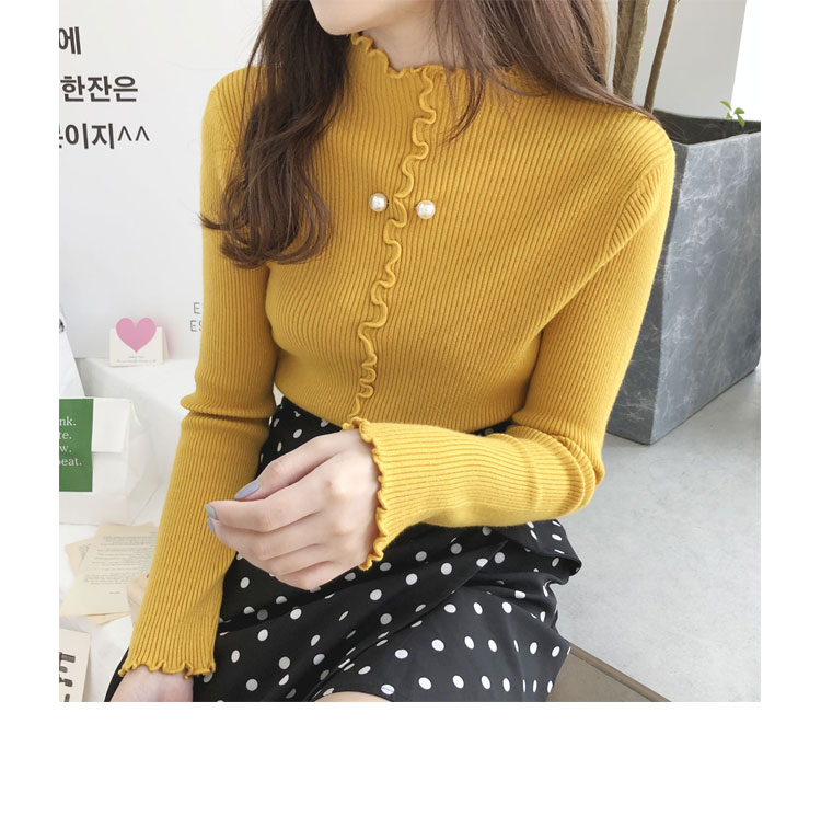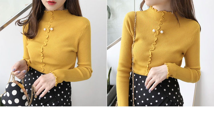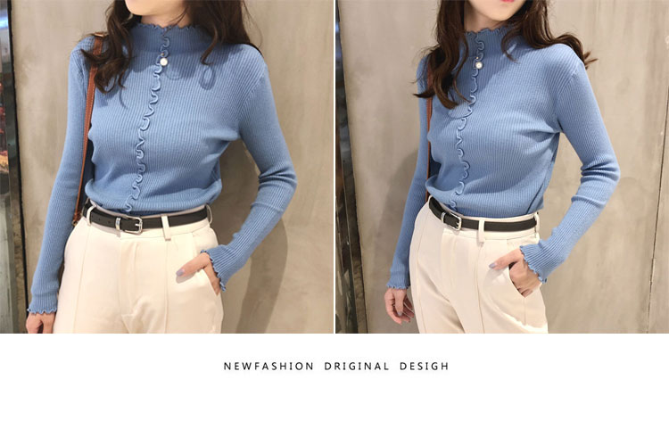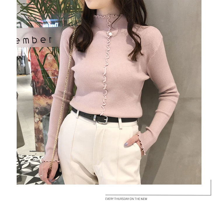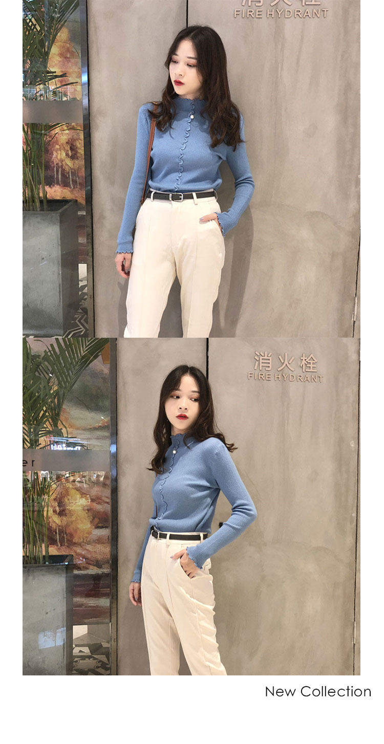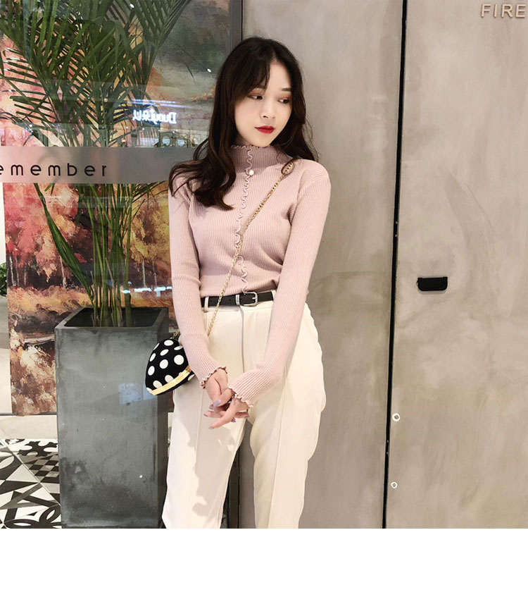 2019秋冬新款女裝木耳邊半高領針織衫修身短款韓版純色打底衫毛衣1入