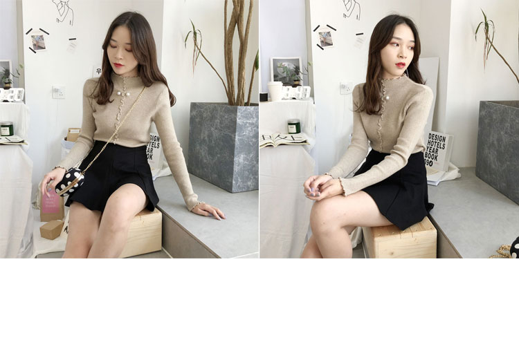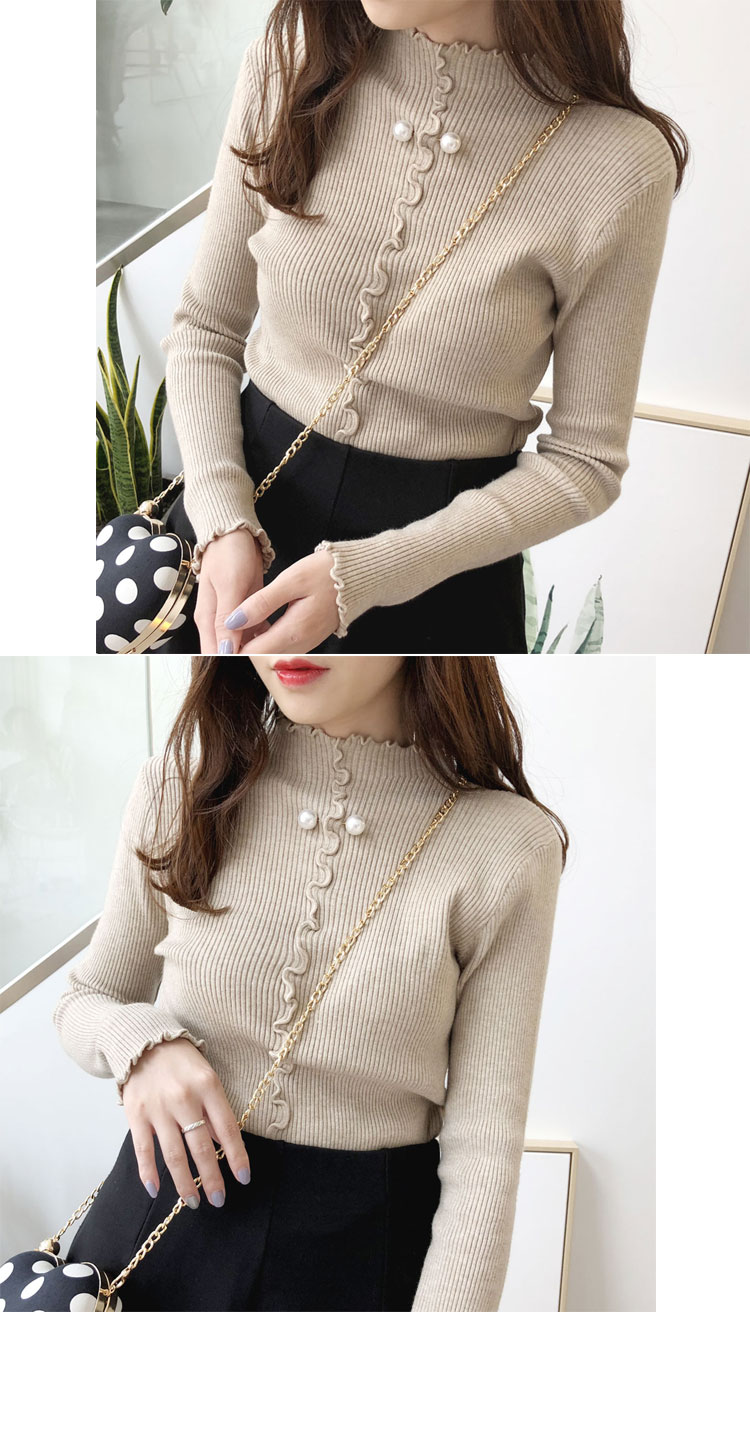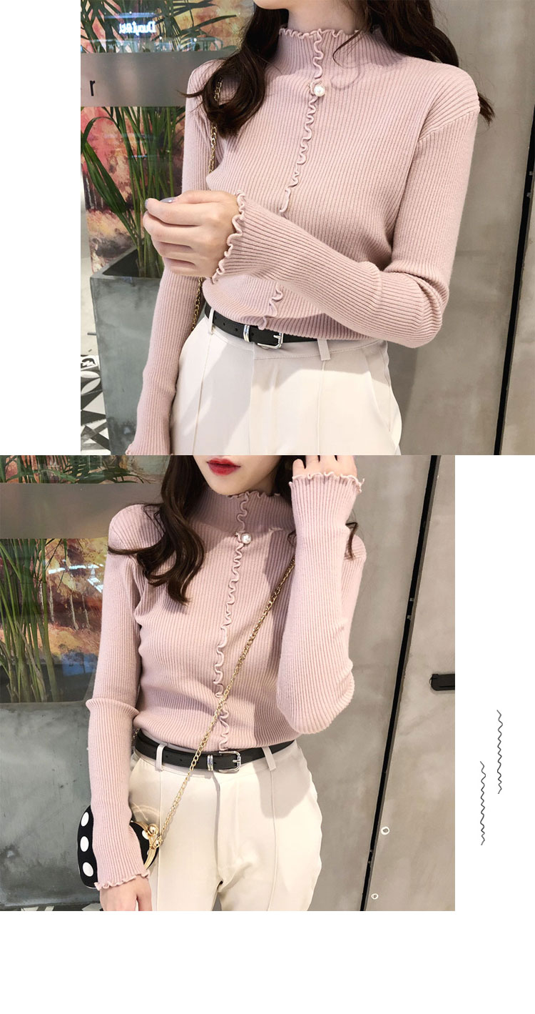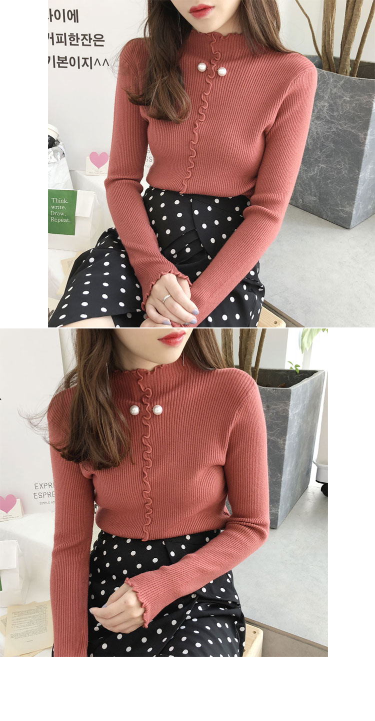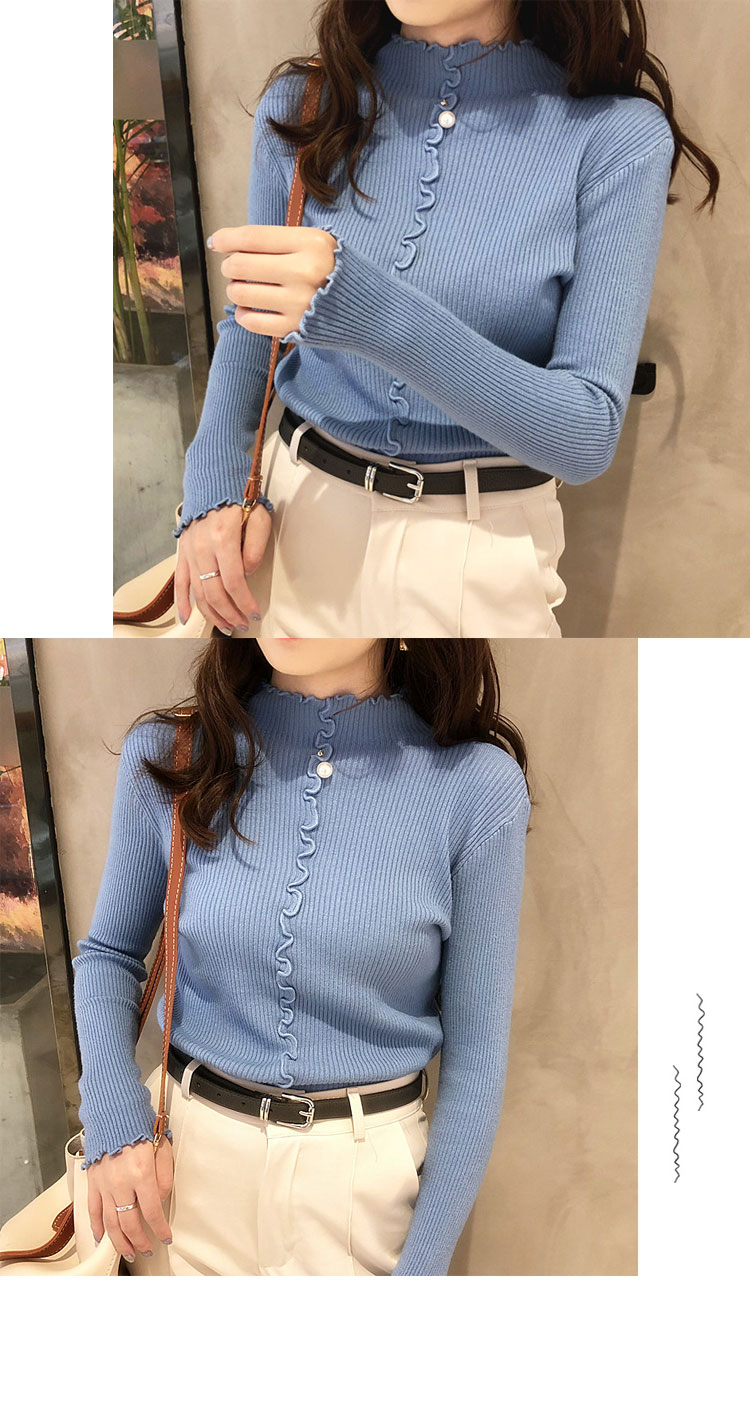 2019秋冬新款女裝木耳邊半高領針織衫修身短款韓版純色打底衫毛衣1入