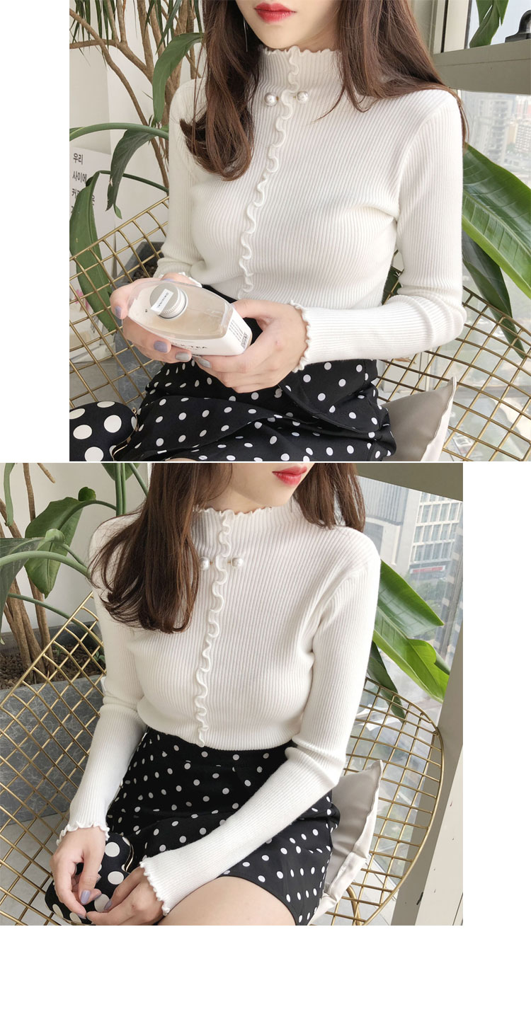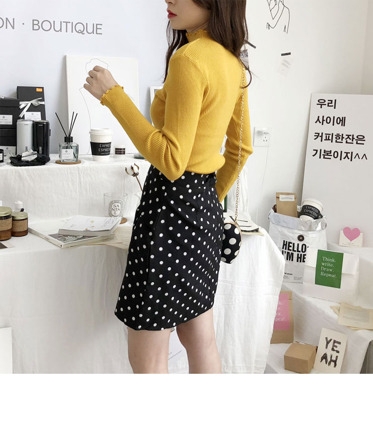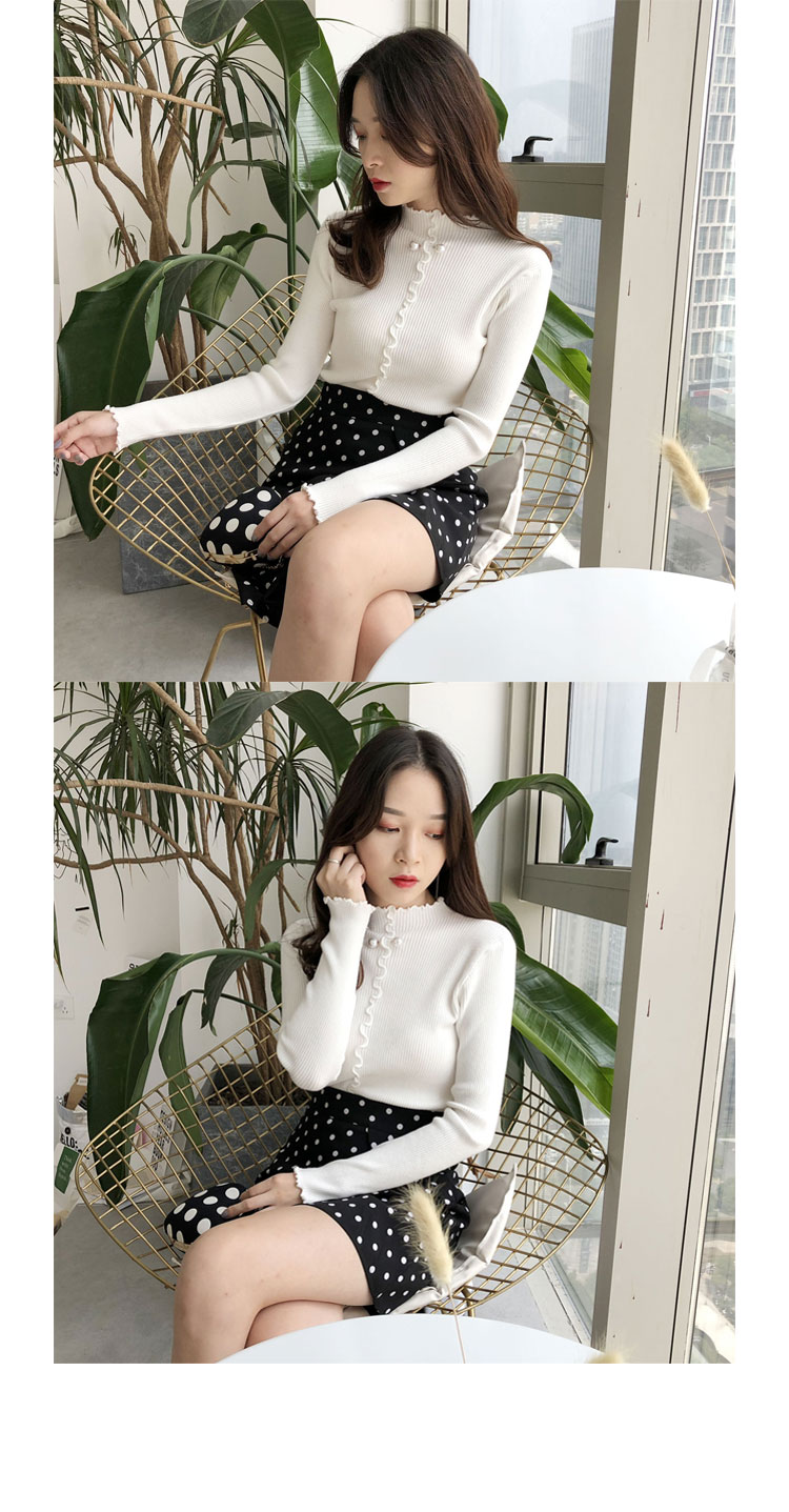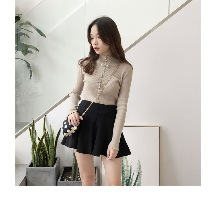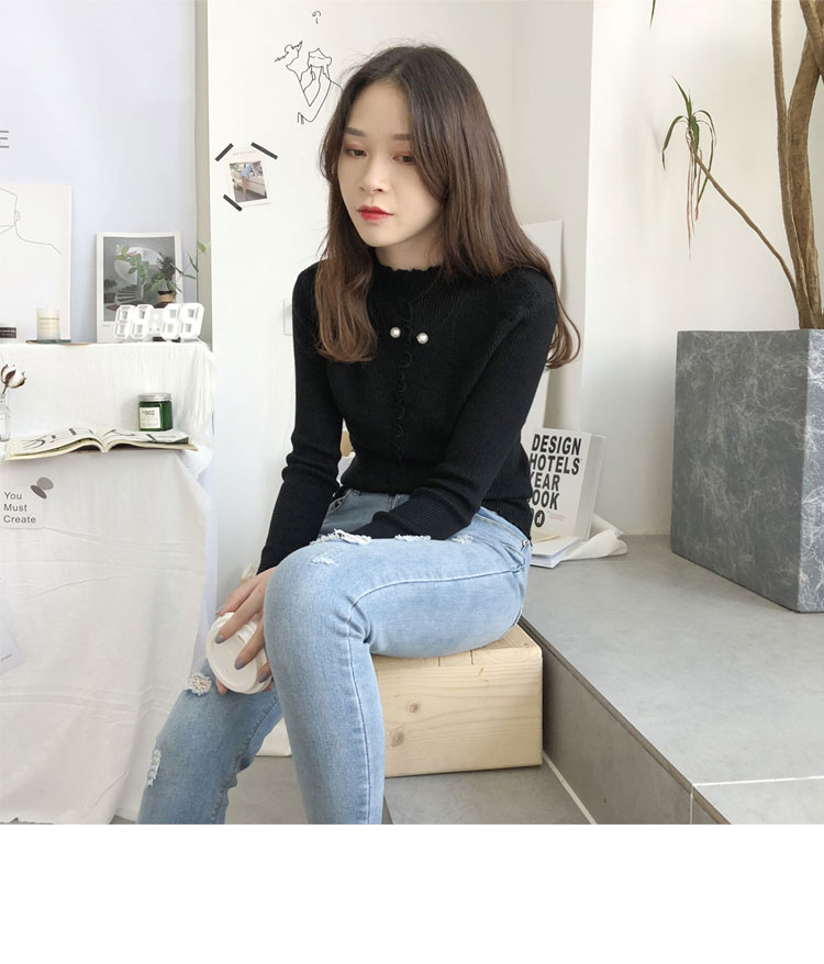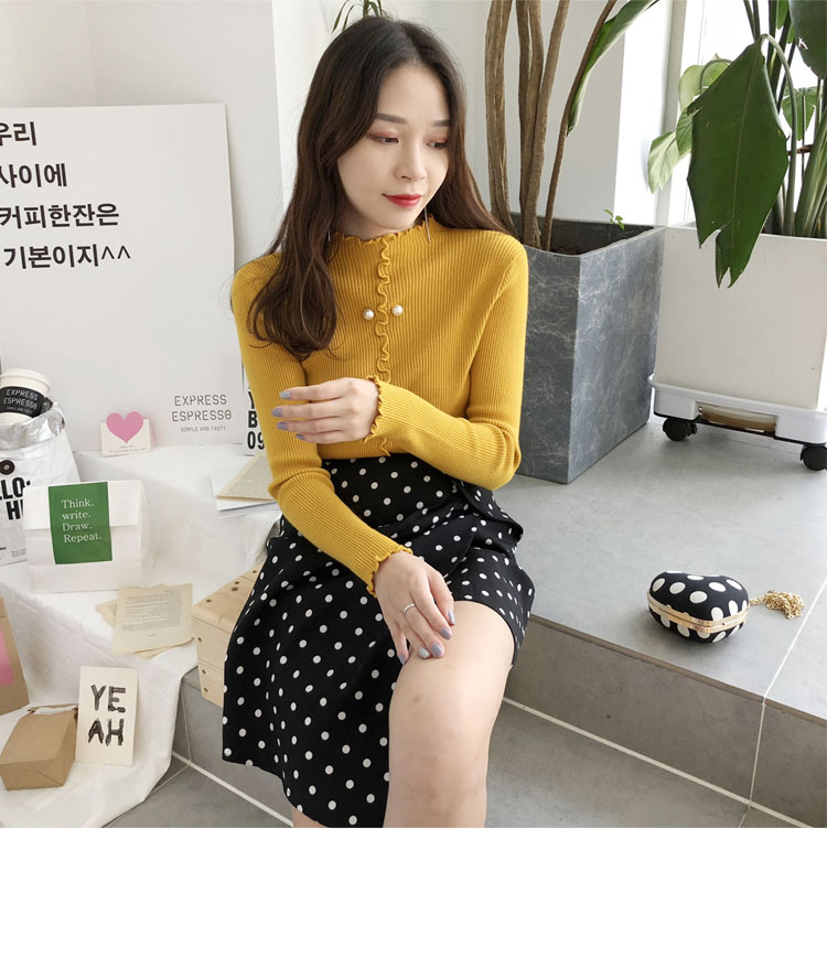 2019秋冬新款女裝木耳邊半高領針織衫修身短款韓版純色打底衫毛衣1入