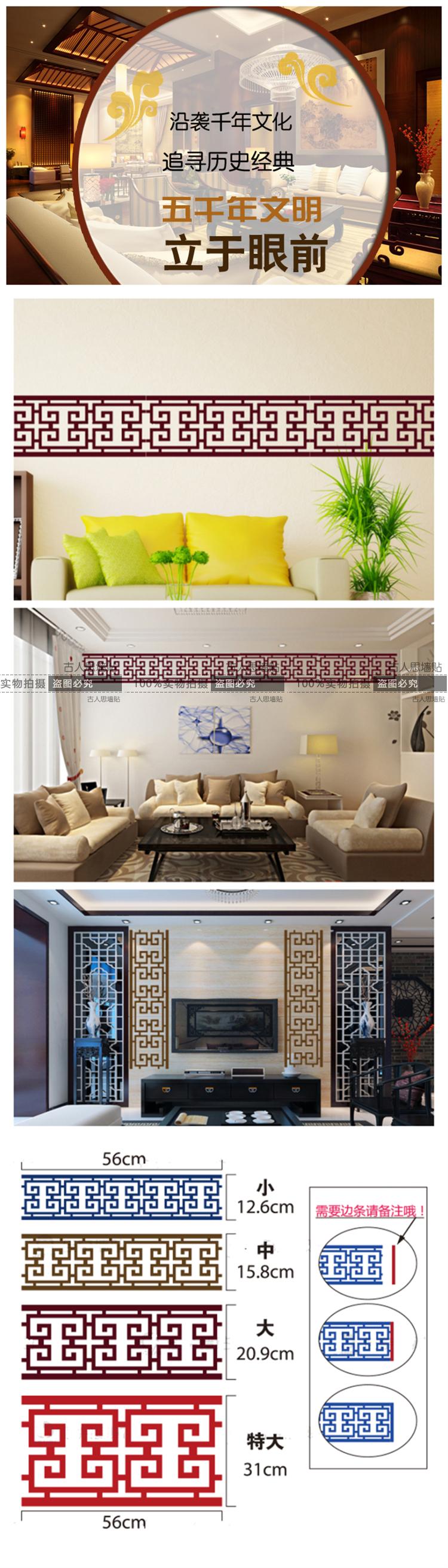 中國風邊框復古腰線墻貼紙 客廳電視墻背景裝飾墻貼 中式頂貼1入