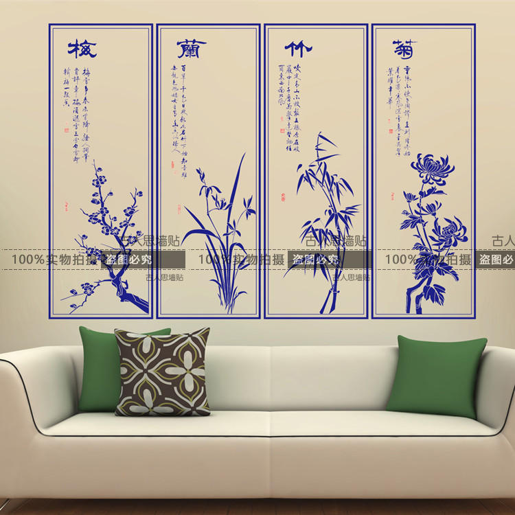 梅蘭竹菊中式墻貼紙 客廳書房玄關裝飾墻貼畫 中國風古典墻貼青花1入