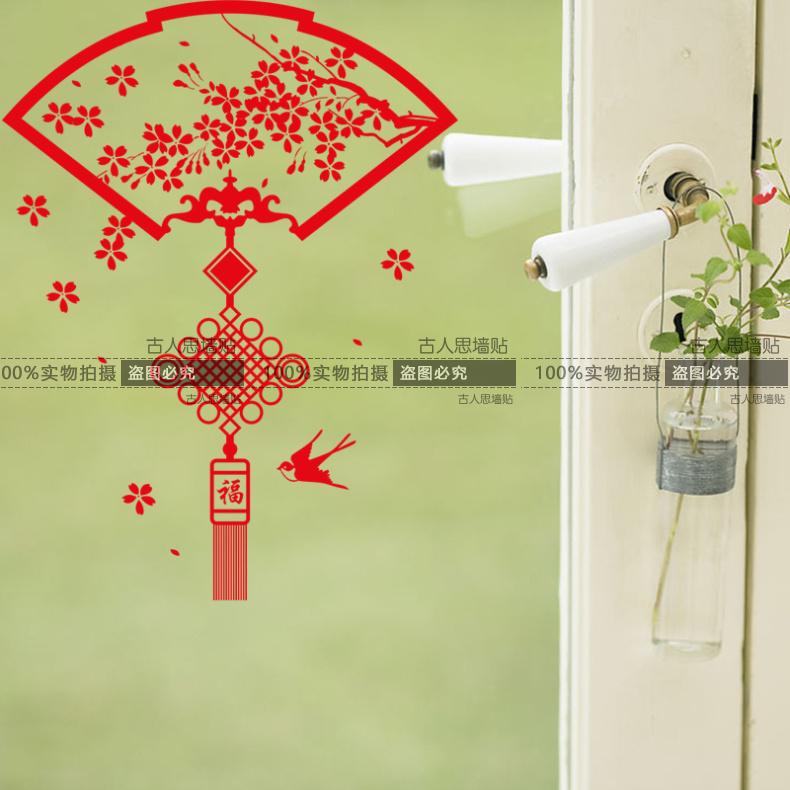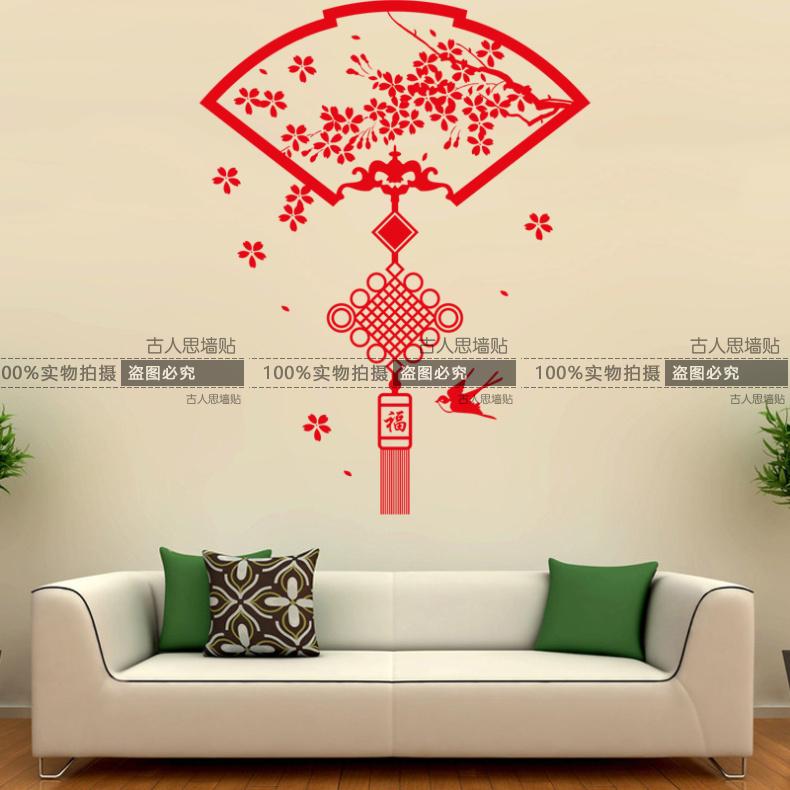 中國結臘梅喜慶扇子臘梅花墻貼紙 中國風中式客廳書房背景裝飾貼1入
