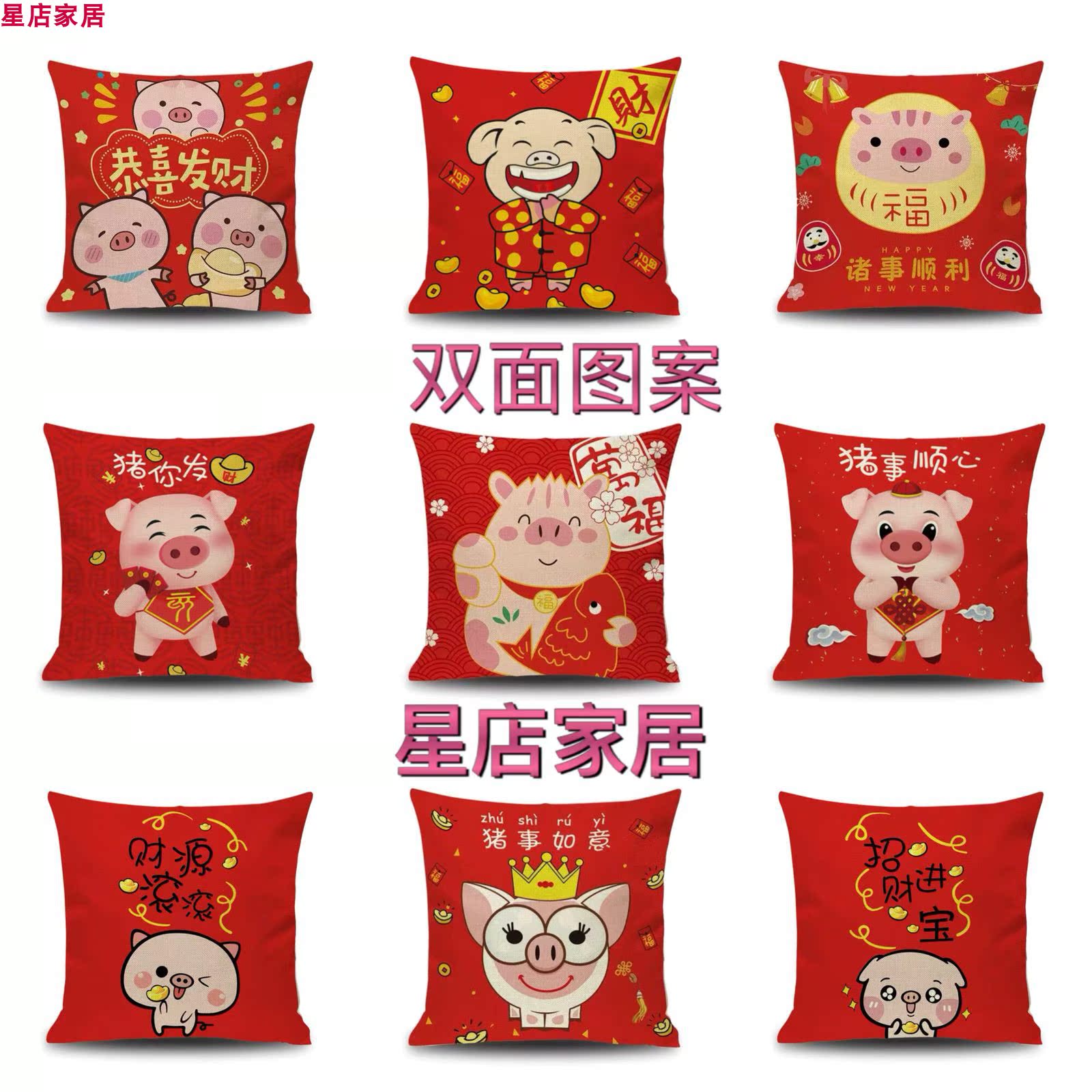2019年新年抱枕靠墊雙面豬年生肖抱枕沙發靠墊抱枕客廳沙發抱枕套1入