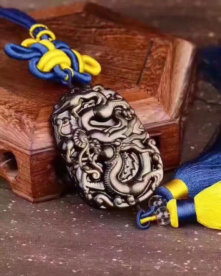 正品 天然黑曜石金曜石龍牌車掛 手工編織招財辟邪生肖龍吊墜1入