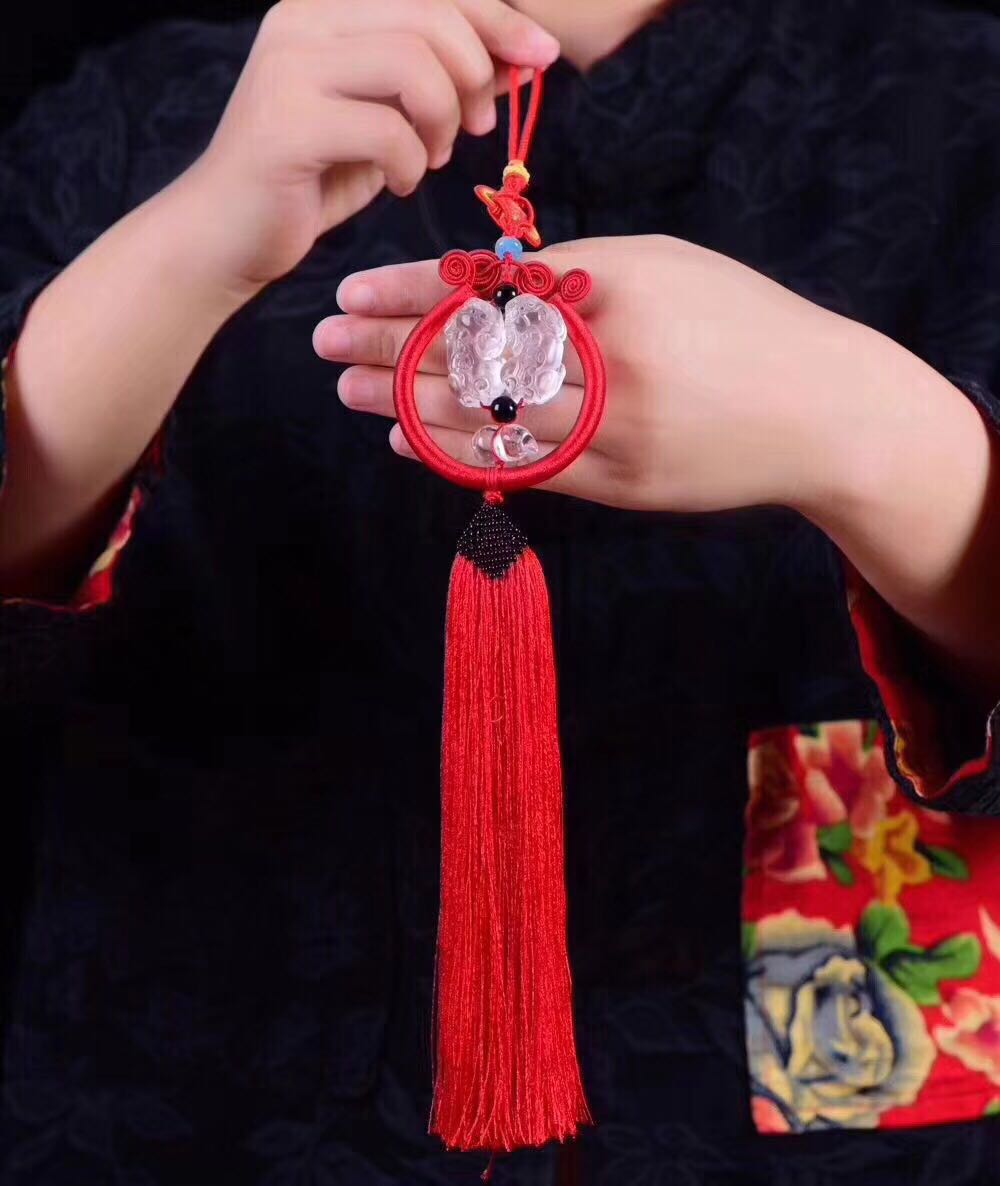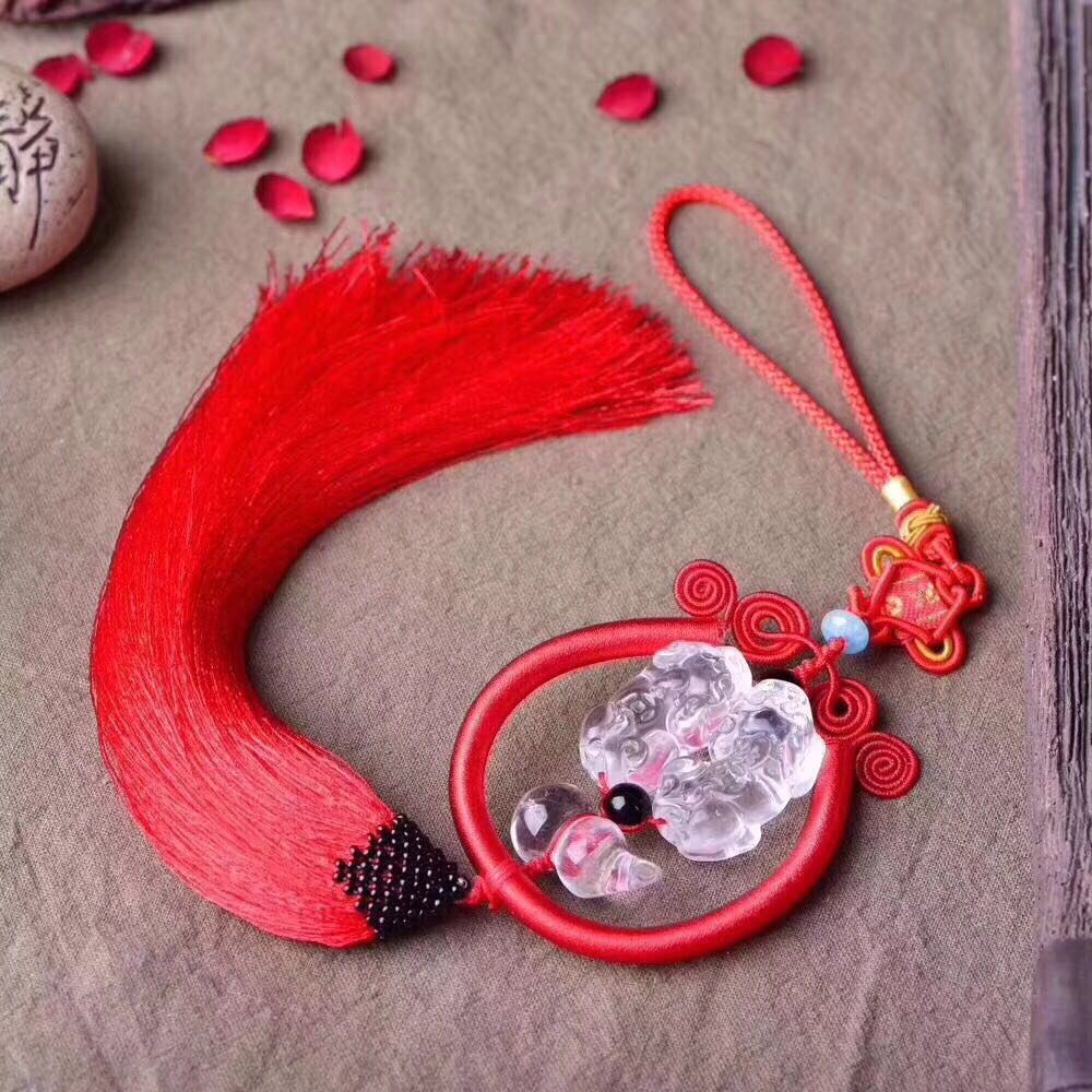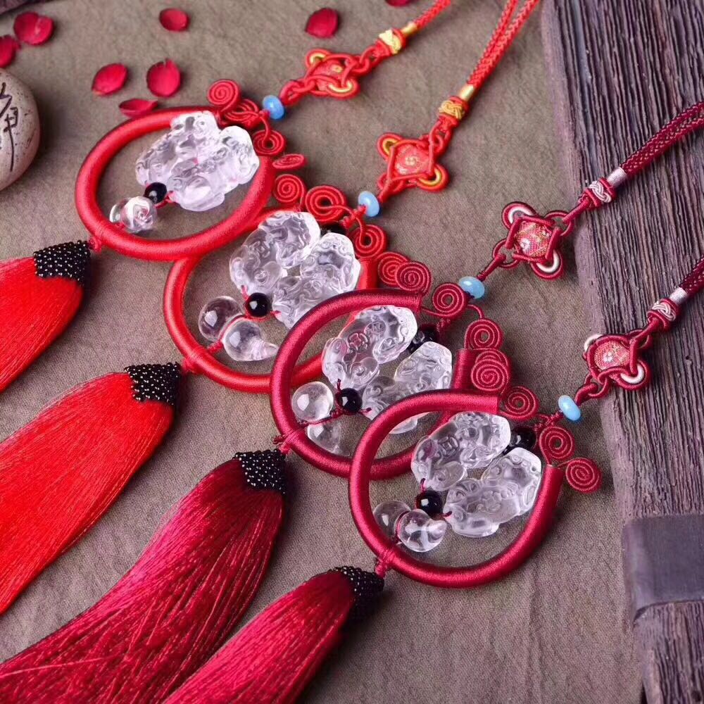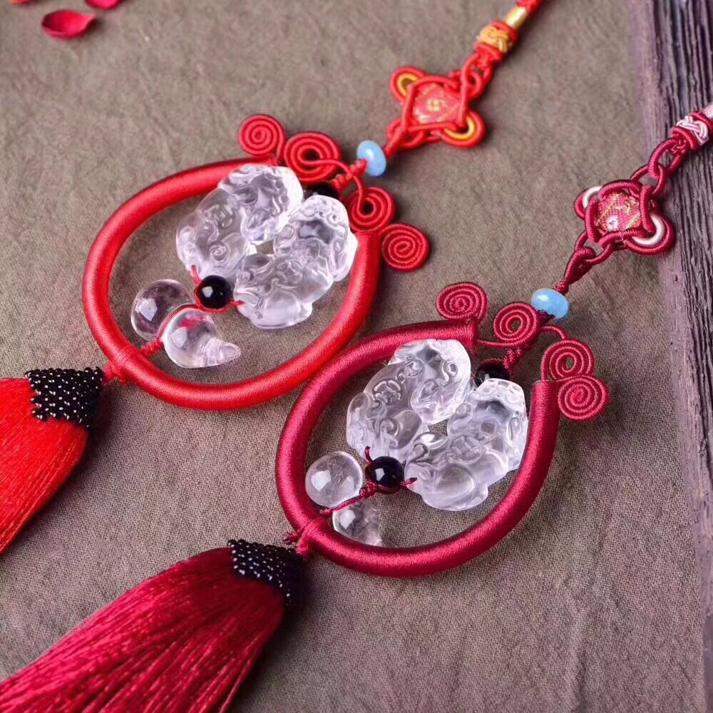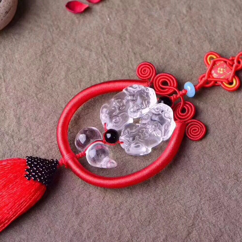 正品 天然白水晶葫蘆車掛貔貅招財辟邪保平安 紅色中國結水晶吊墜1入