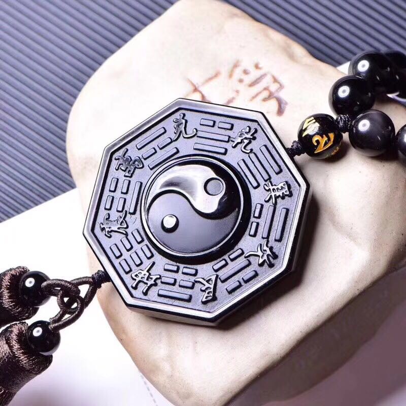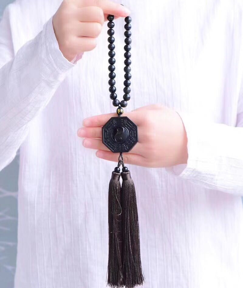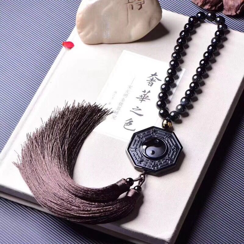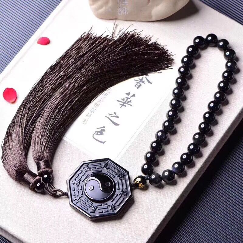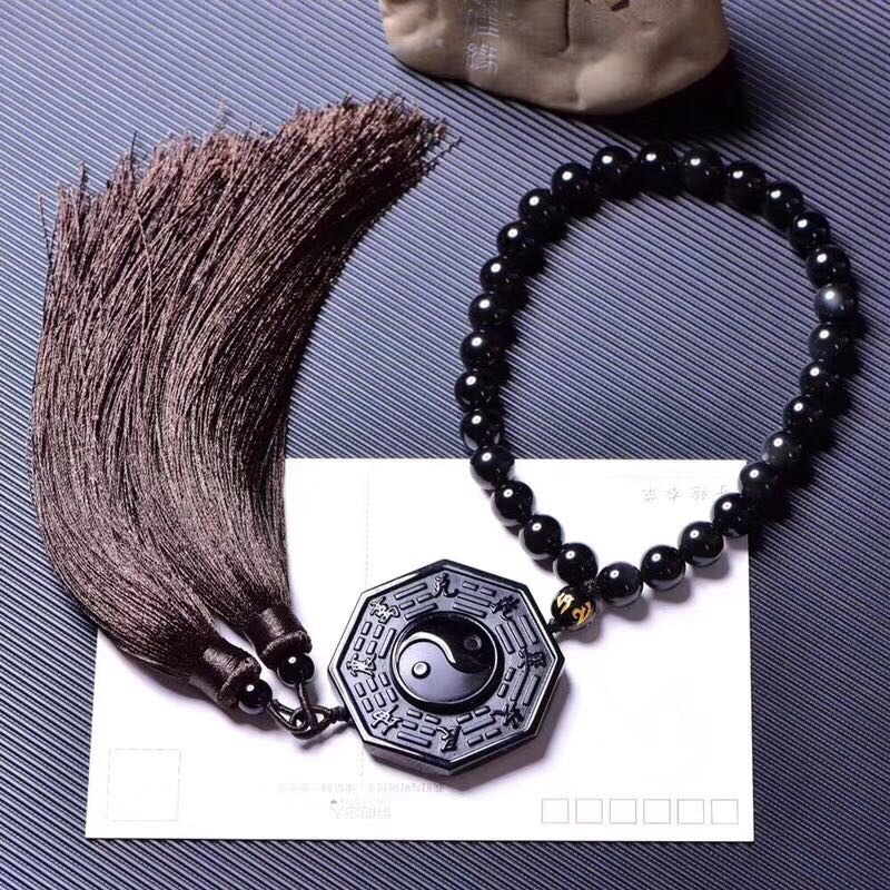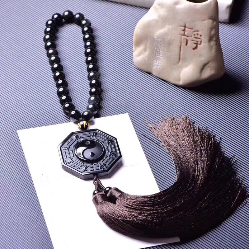 正品 天然黑曜石八卦牌車掛吊墜 招財辟邪吊墜中國結流蘇掛墜1入