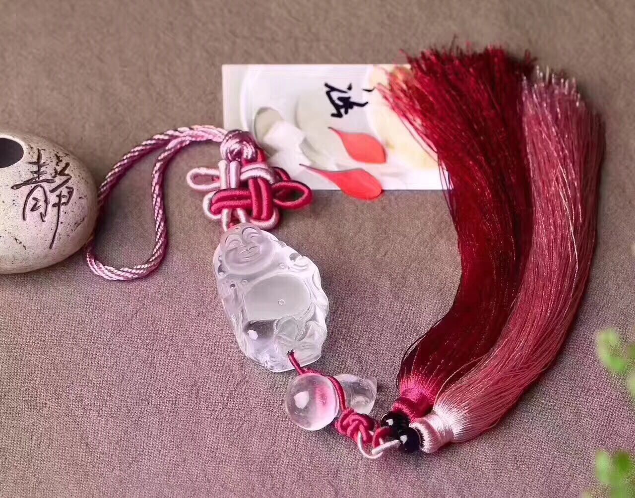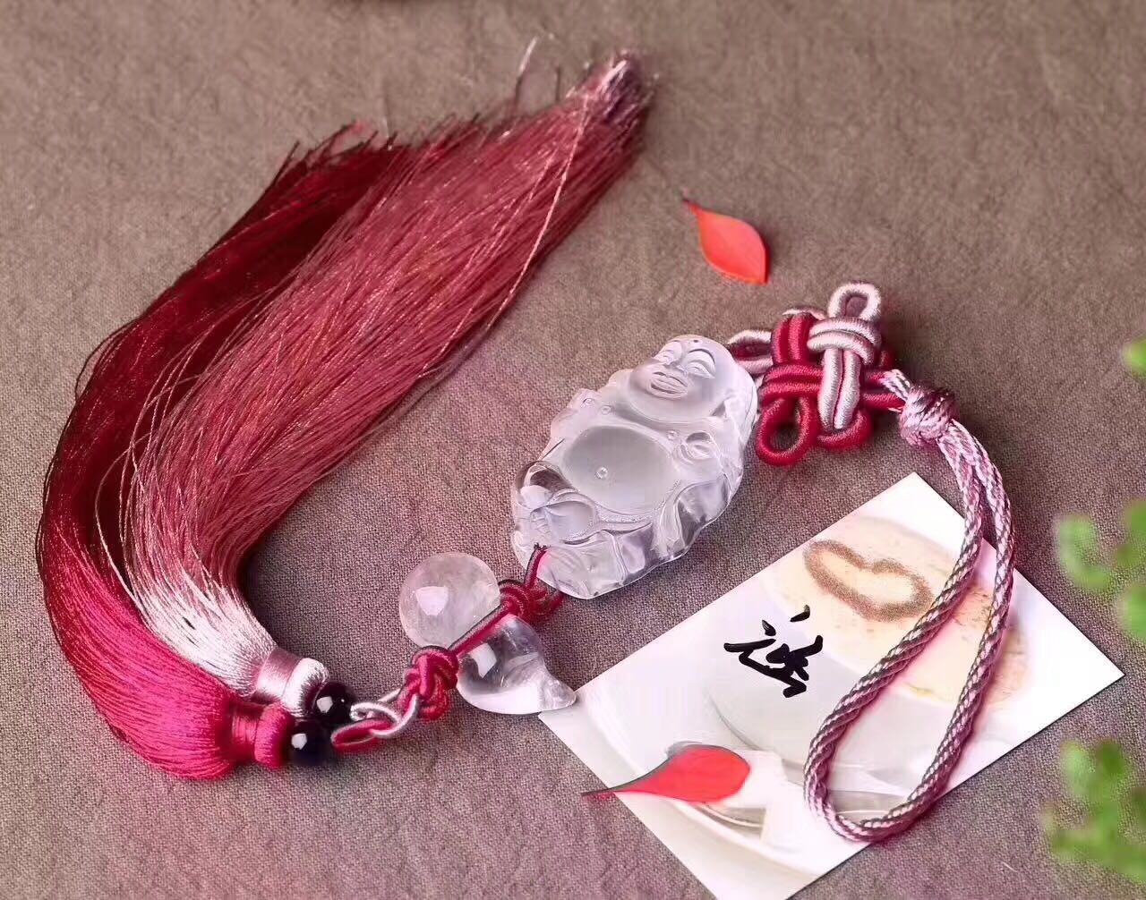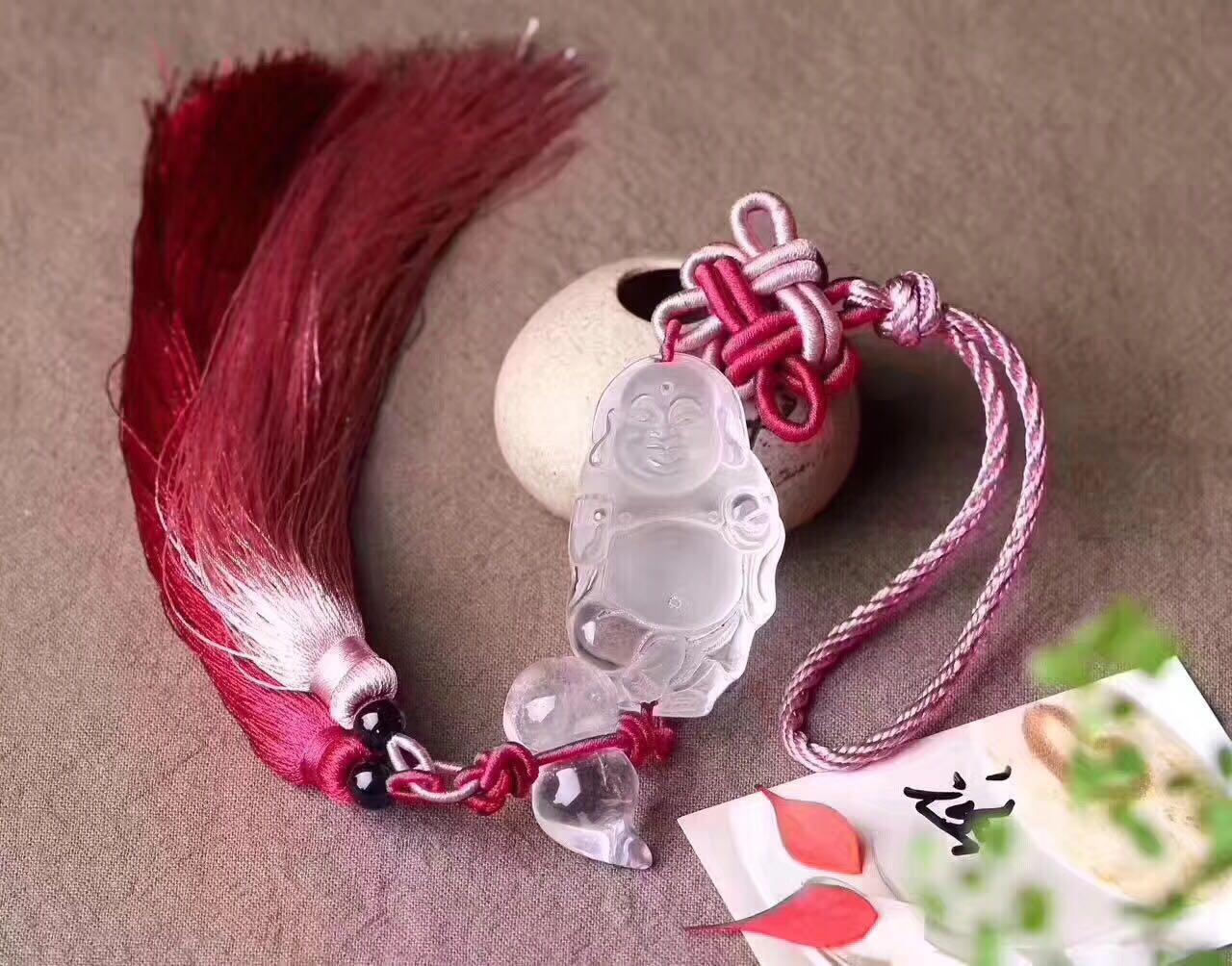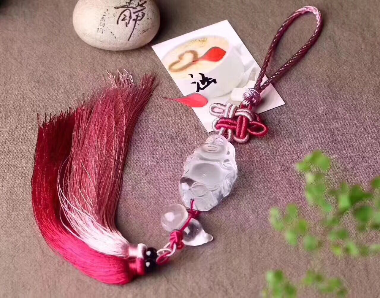 天然白水晶大肚佛車掛、手工編織流蘇、顏色搭配艷麗、葫蘆(福祿)平安!貨源多多