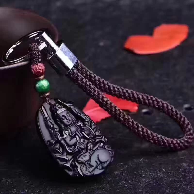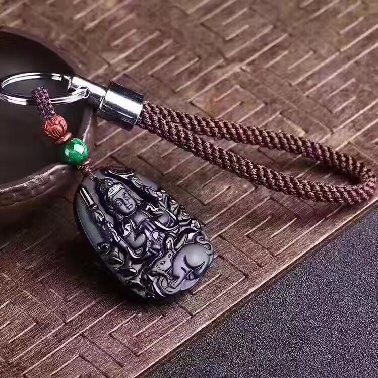 天然黑曜石生肖鼠守護神 千手觀音菩薩鑰匙扣 手工編織掛繩,吊墜尺寸:47*32*11