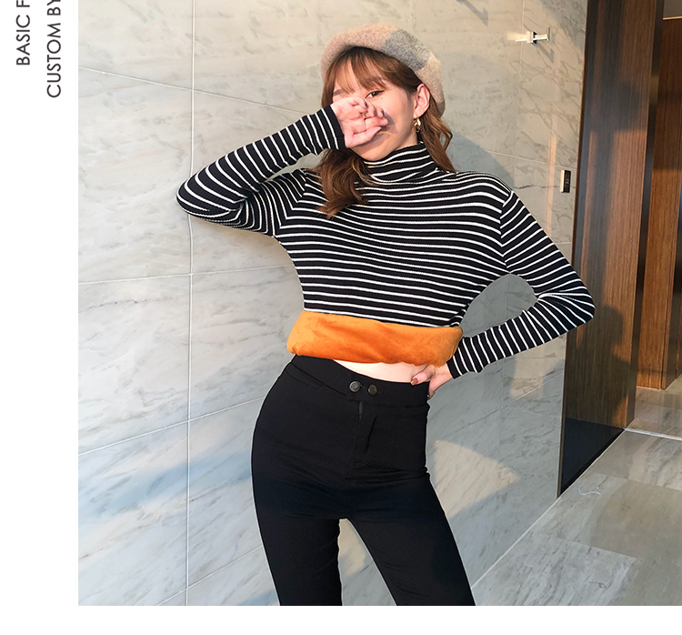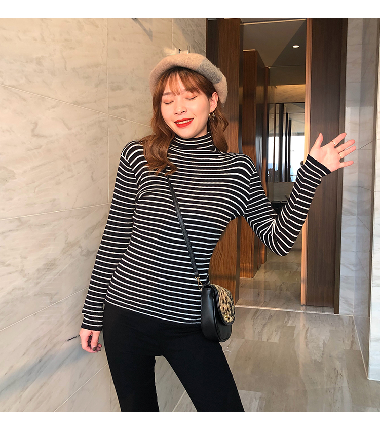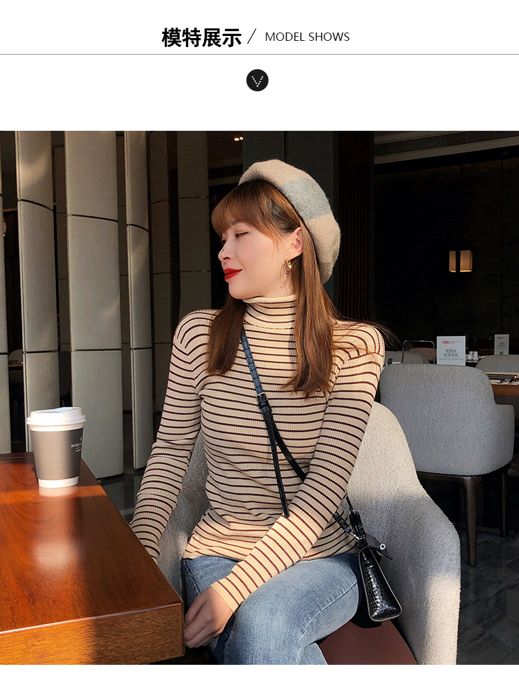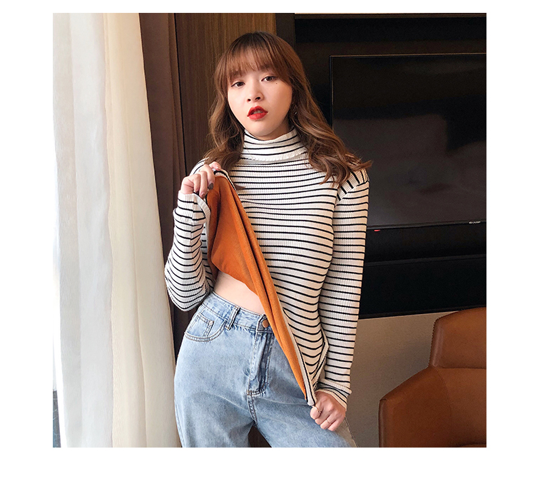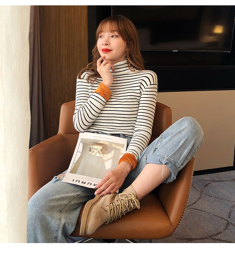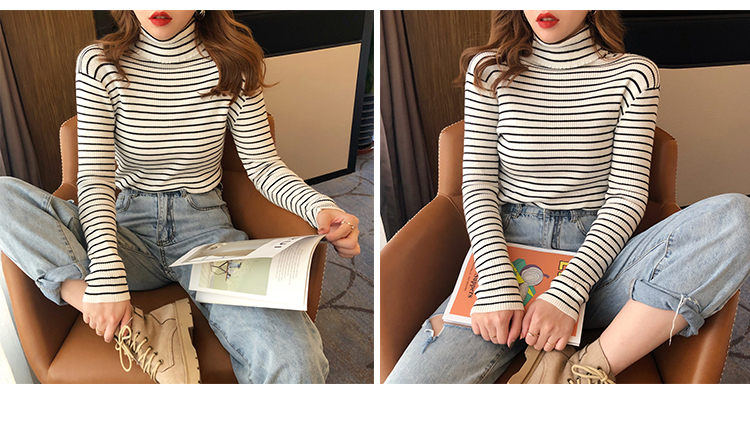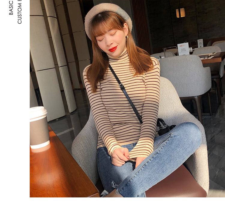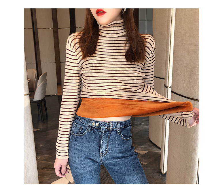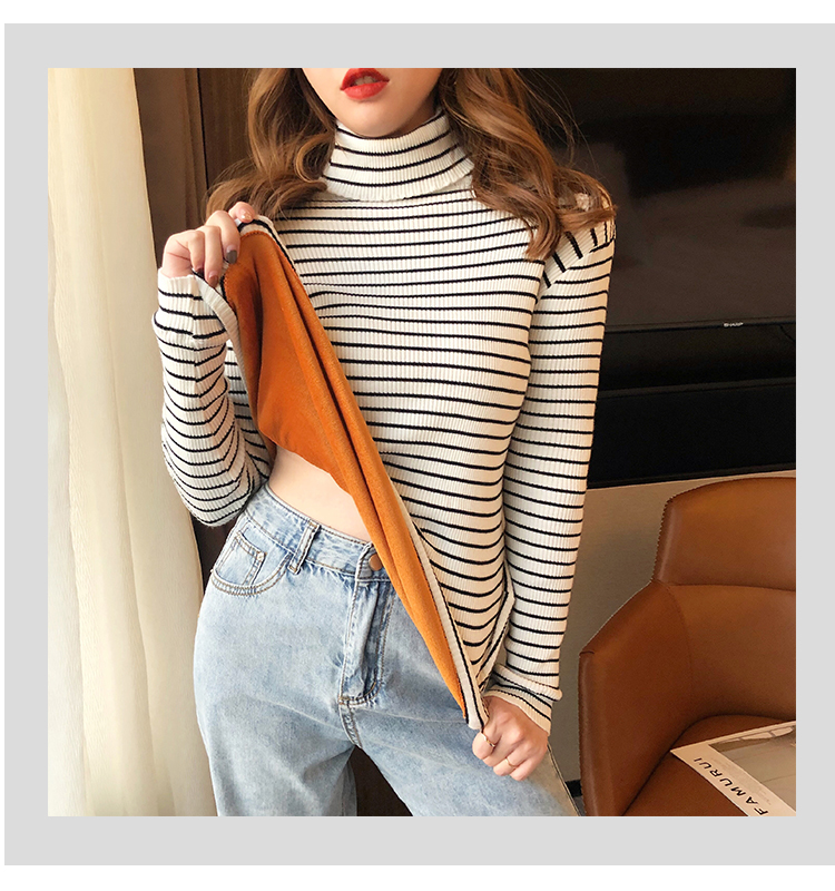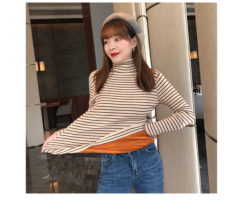 高領毛衣女秋冬新款韓版條紋針織打底衫外穿加絨加厚套頭毛衣1入