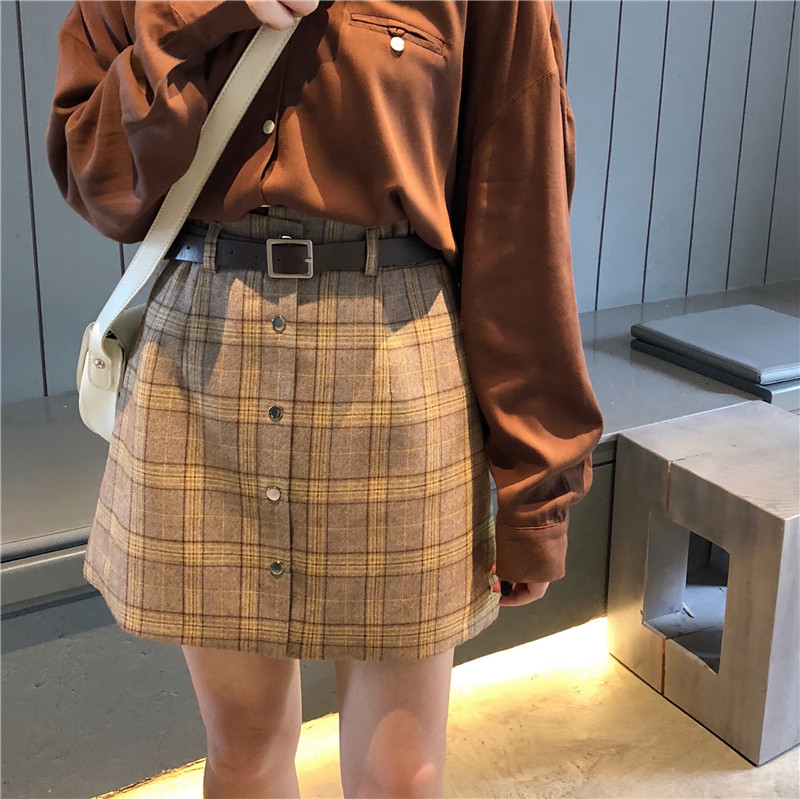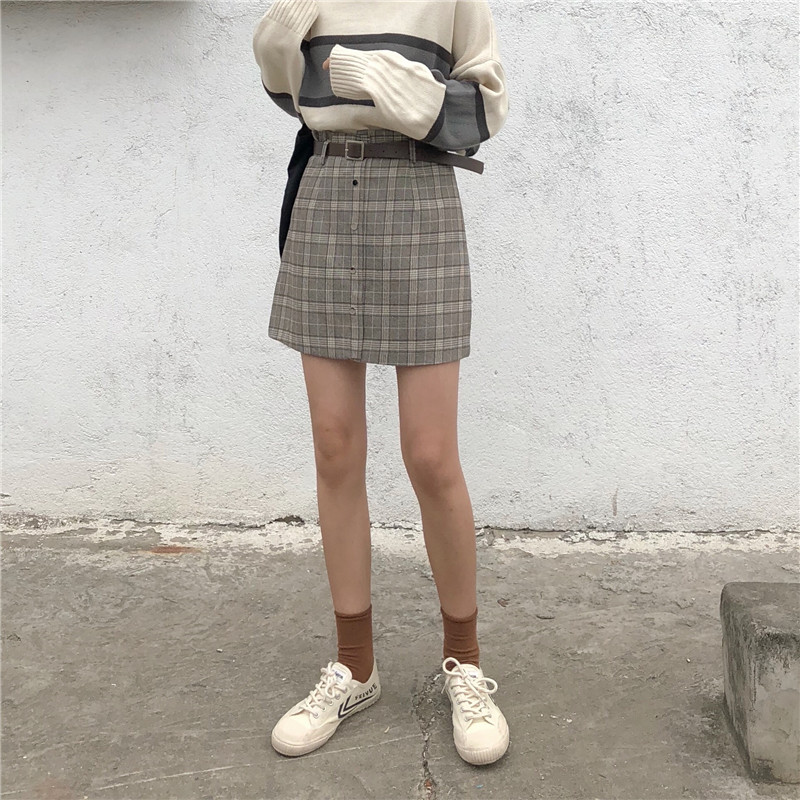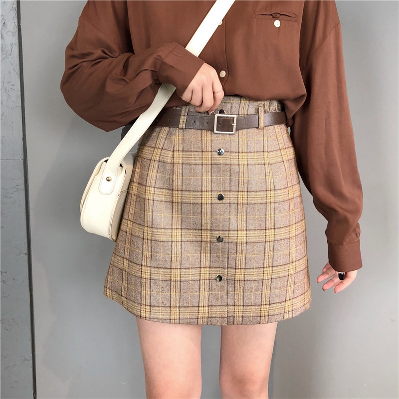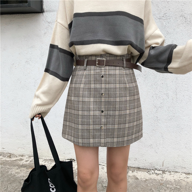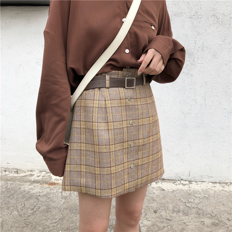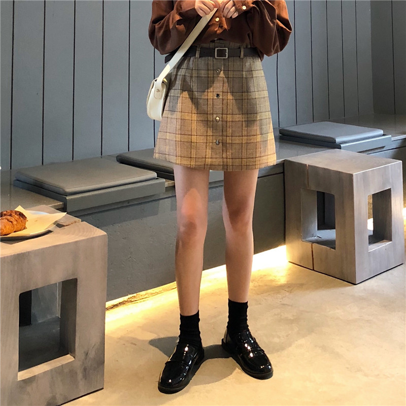高腰chic短裙半身裙秋冬女大碼A字一步裙顯瘦包臀格子裙1入