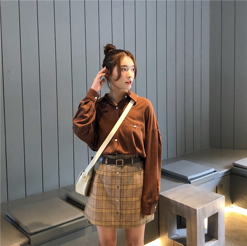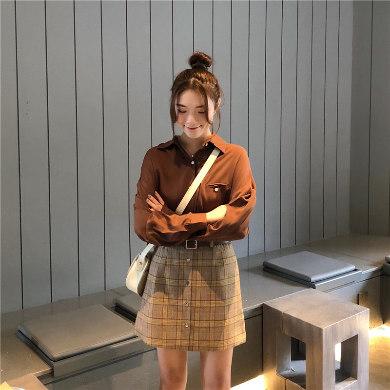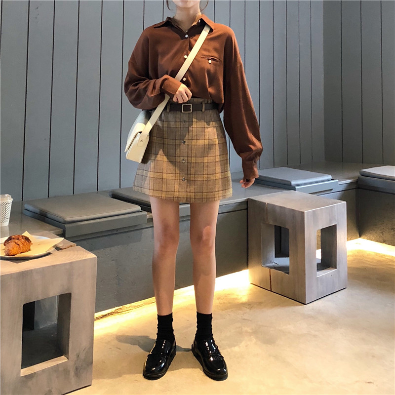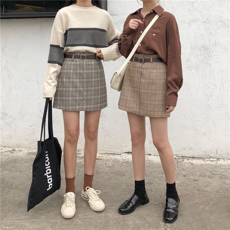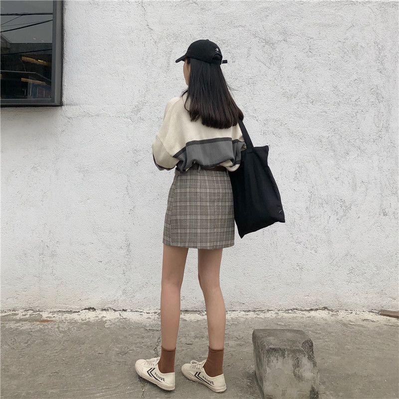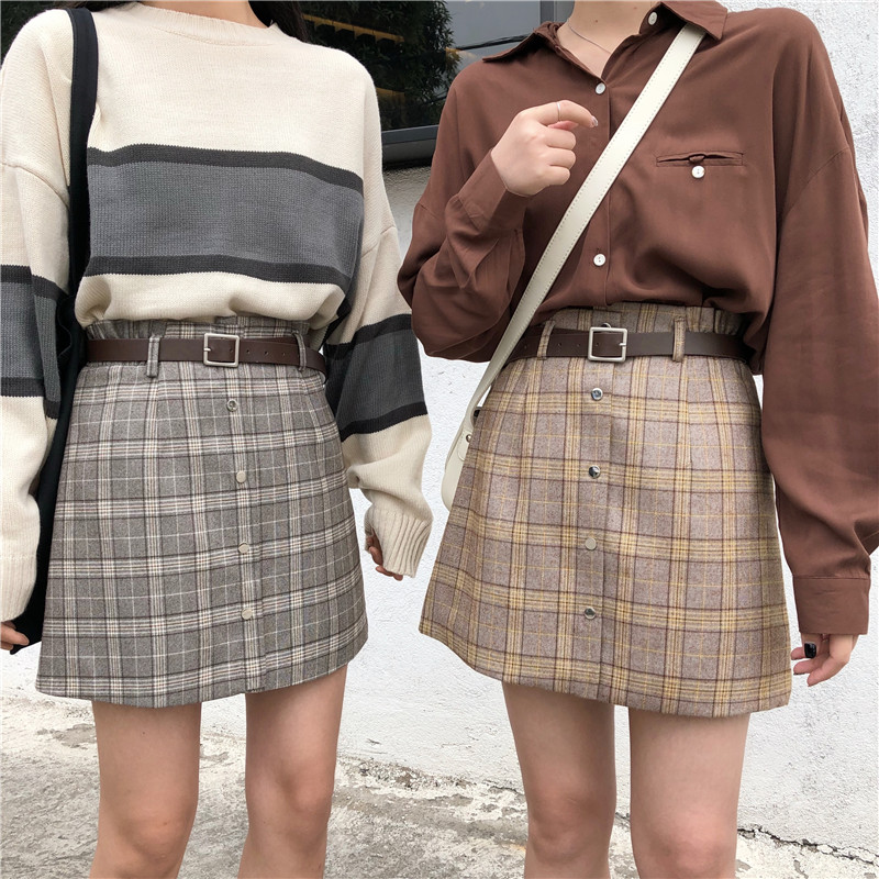 高腰chic短裙半身裙秋冬女大碼A字一步裙顯瘦包臀格子裙1入
