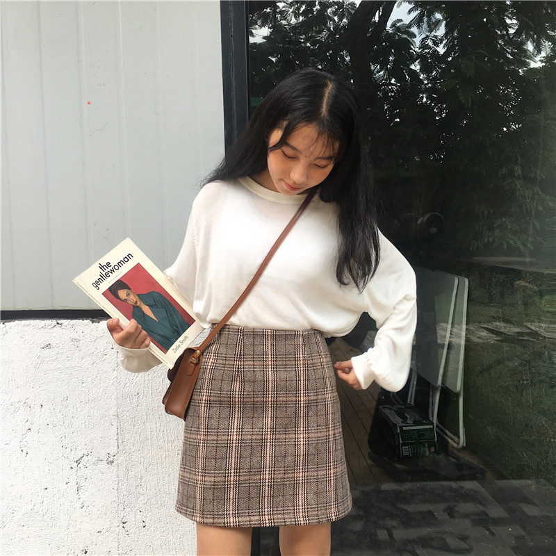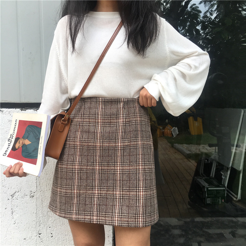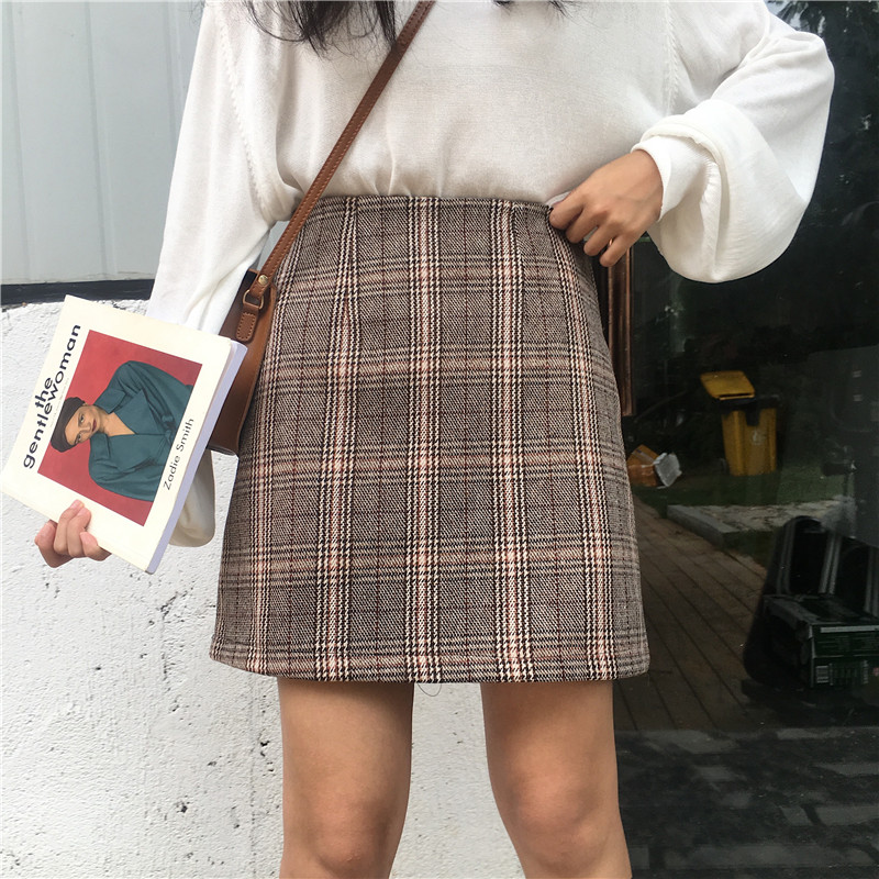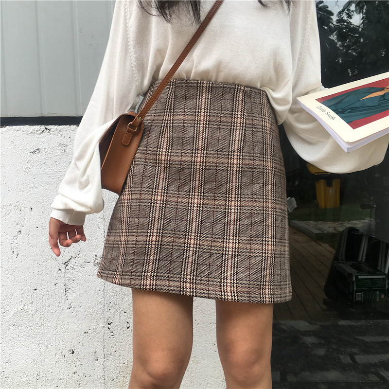 韓版格子大碼半身裙秋冬女A字裙胖mm百搭學生高腰包臀短裙冬1入