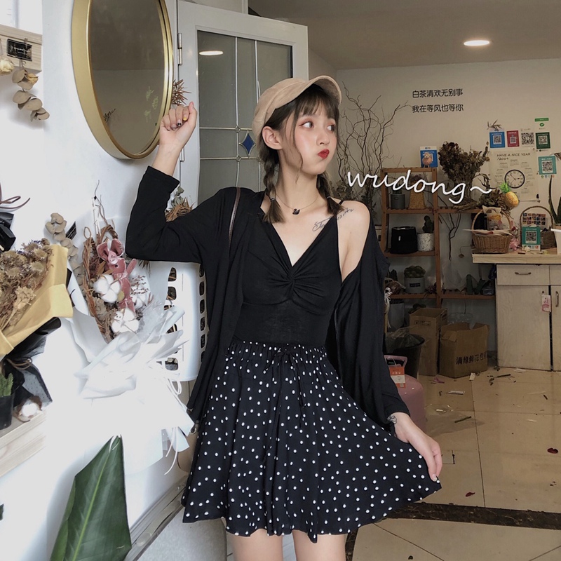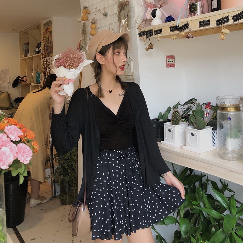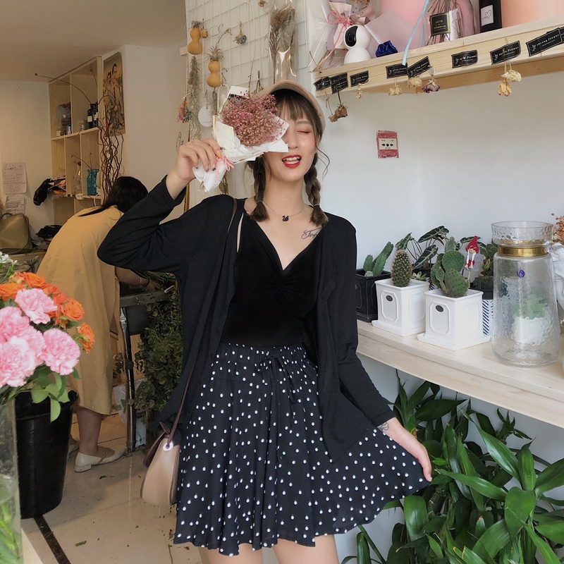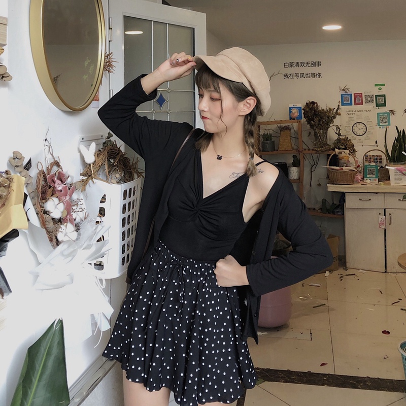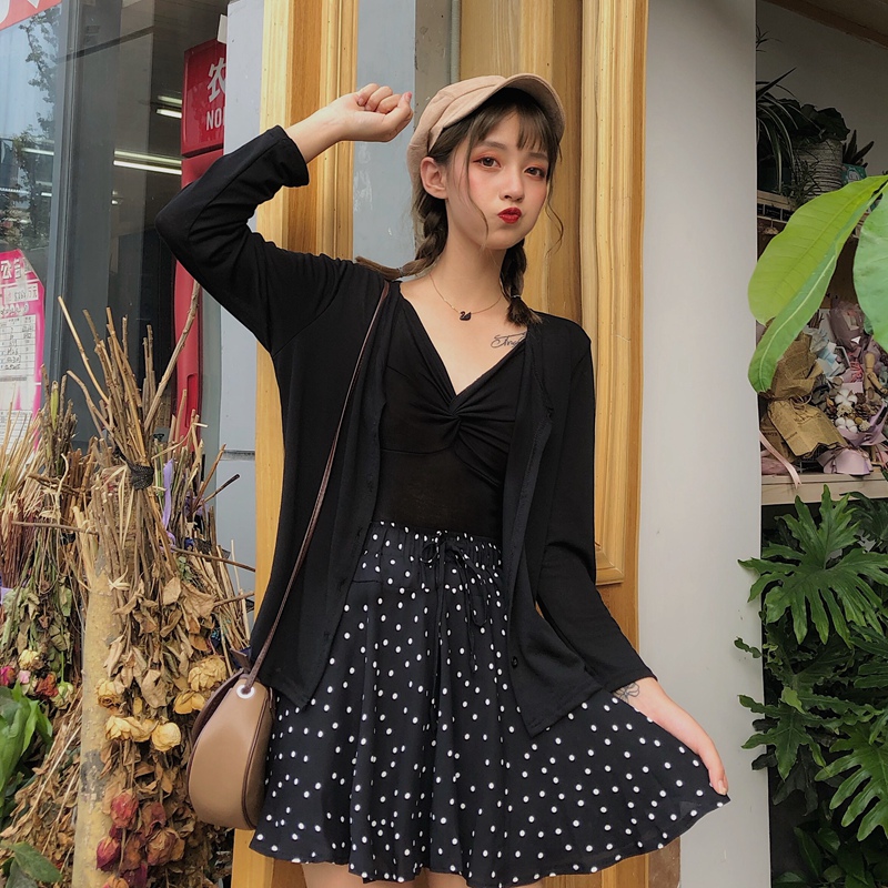 韓版松緊腰大碼波點壓褶裙女夏季顯瘦小黑裙百搭A字半身裙短裙子1入