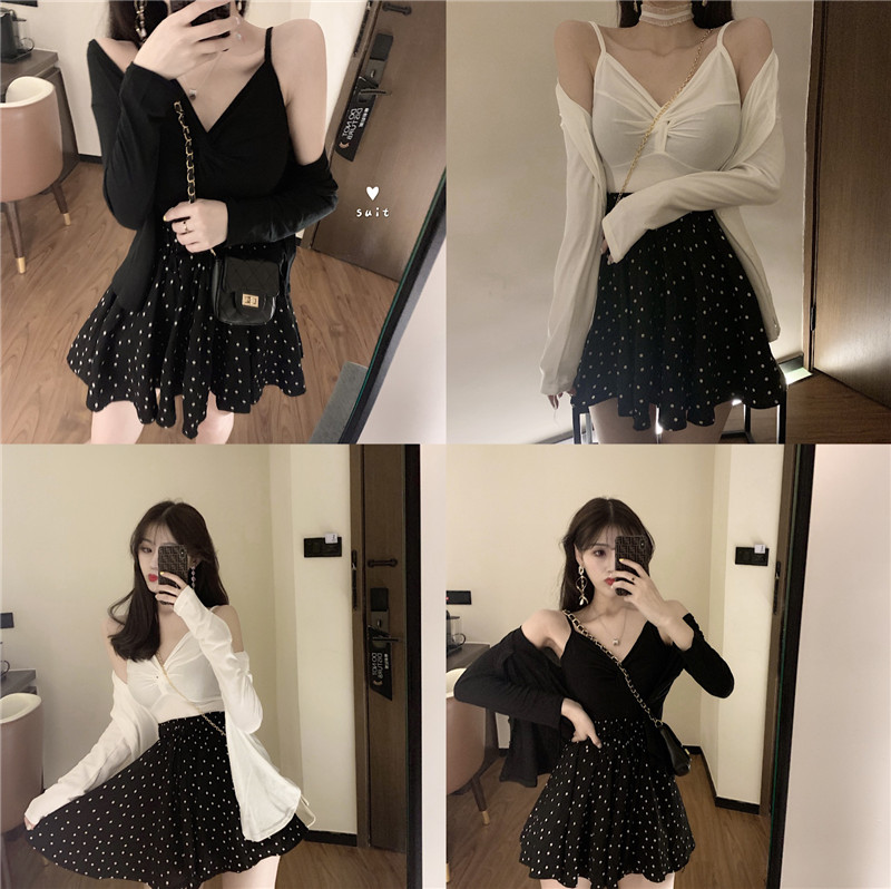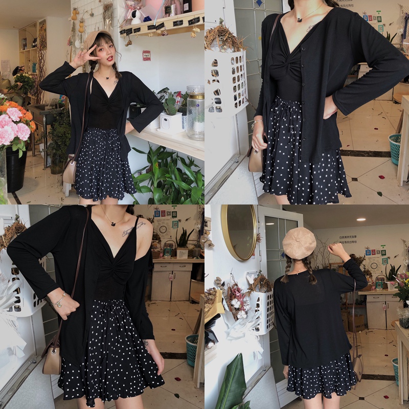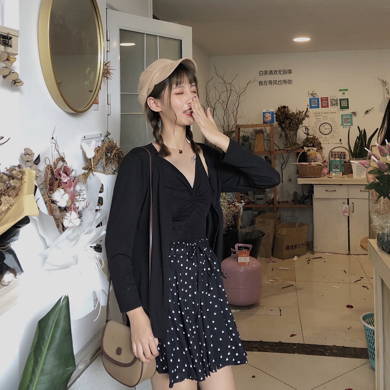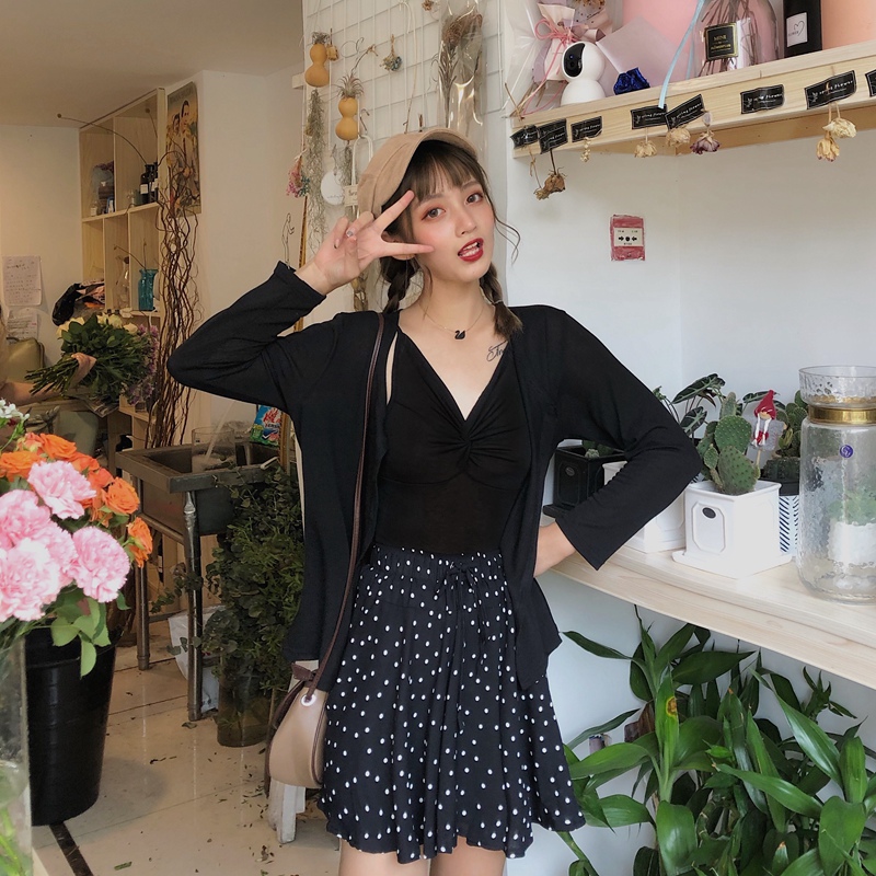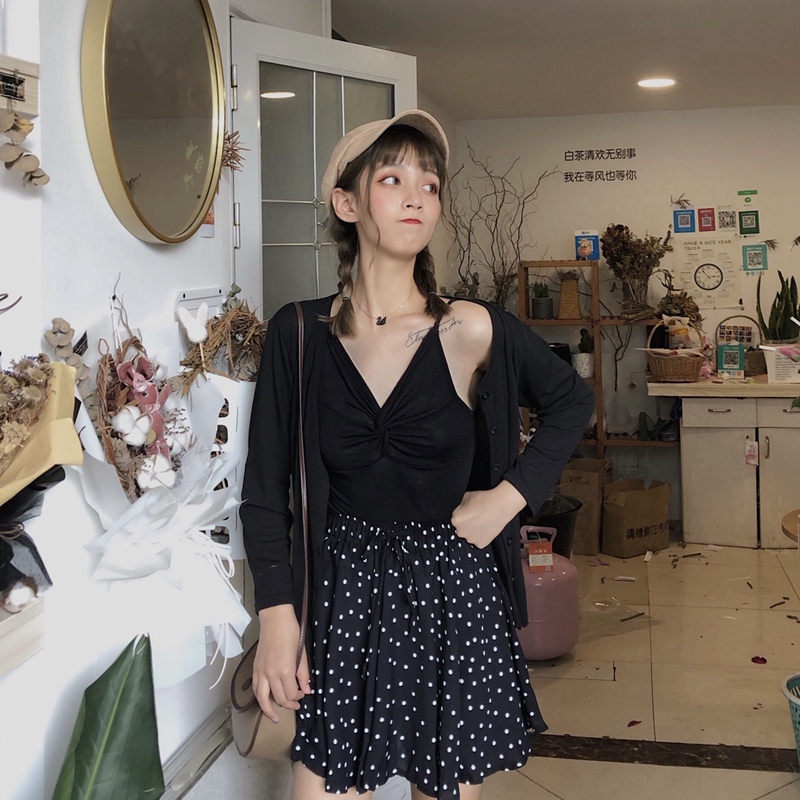 韓版松緊腰大碼波點壓褶裙女夏季顯瘦小黑裙百搭A字半身裙短裙子1入