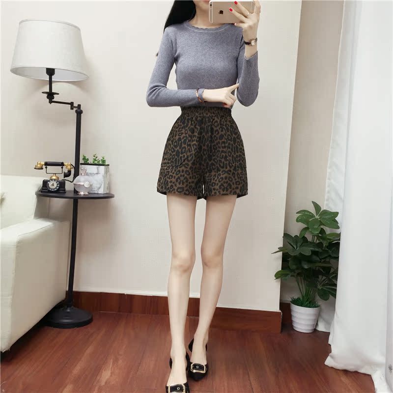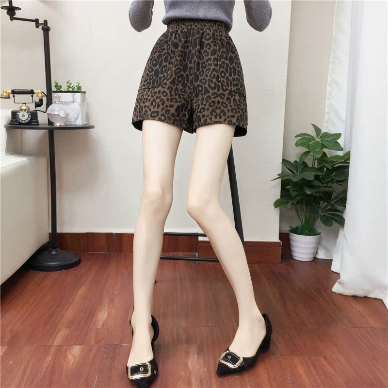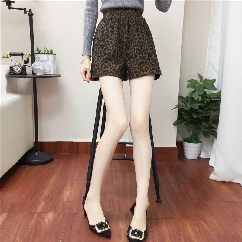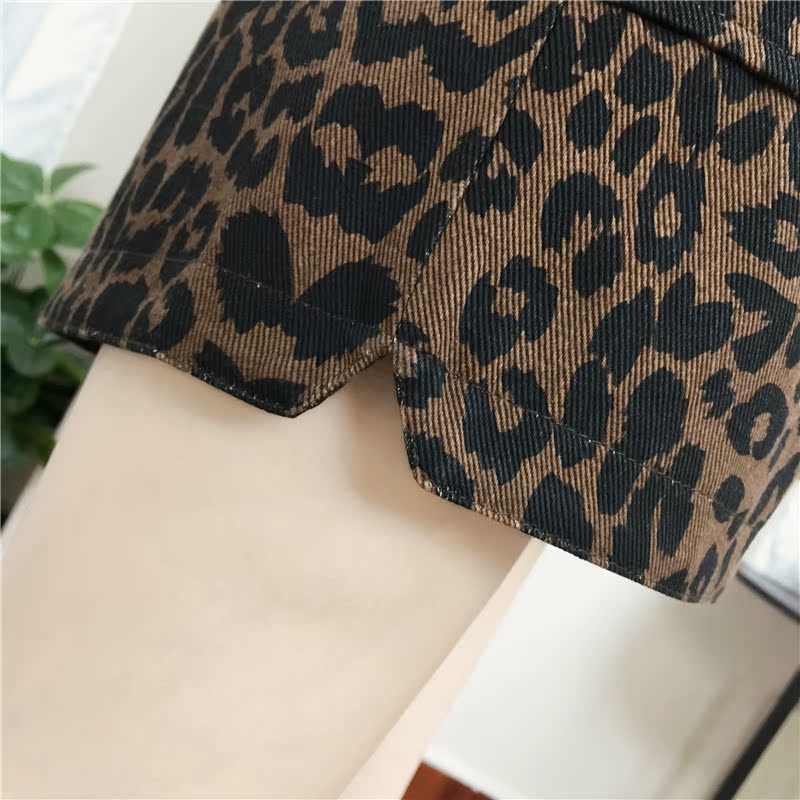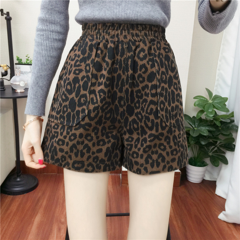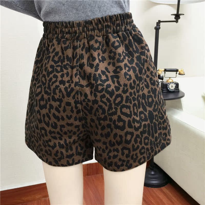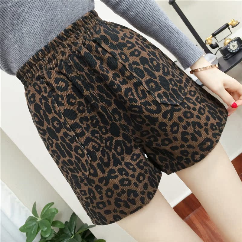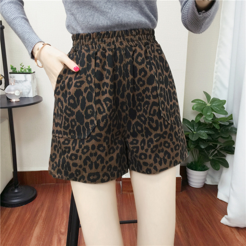 褲子女秋胖mm大碼休閑褲豹紋牛仔闊腿褲外穿高腰chic短褲1入