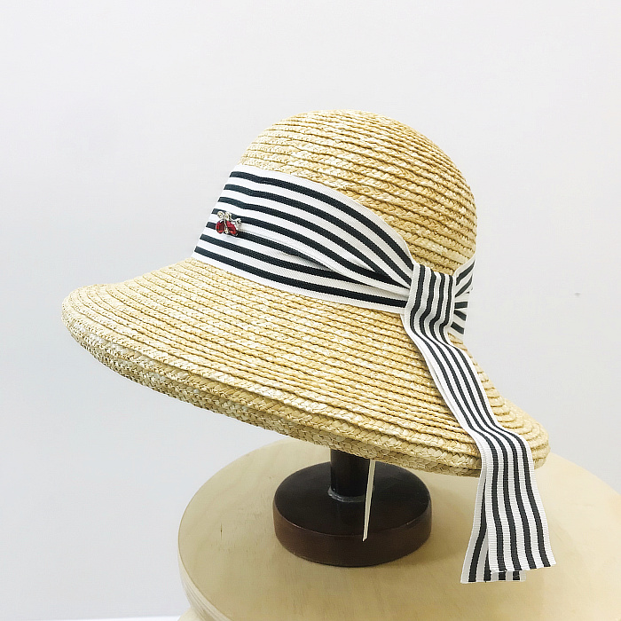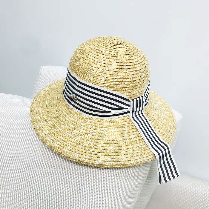 赫本風優雅復古鉆扣防曬沙灘帽麥草條紋飄帶漁夫帽女夏天遮陽草帽1入