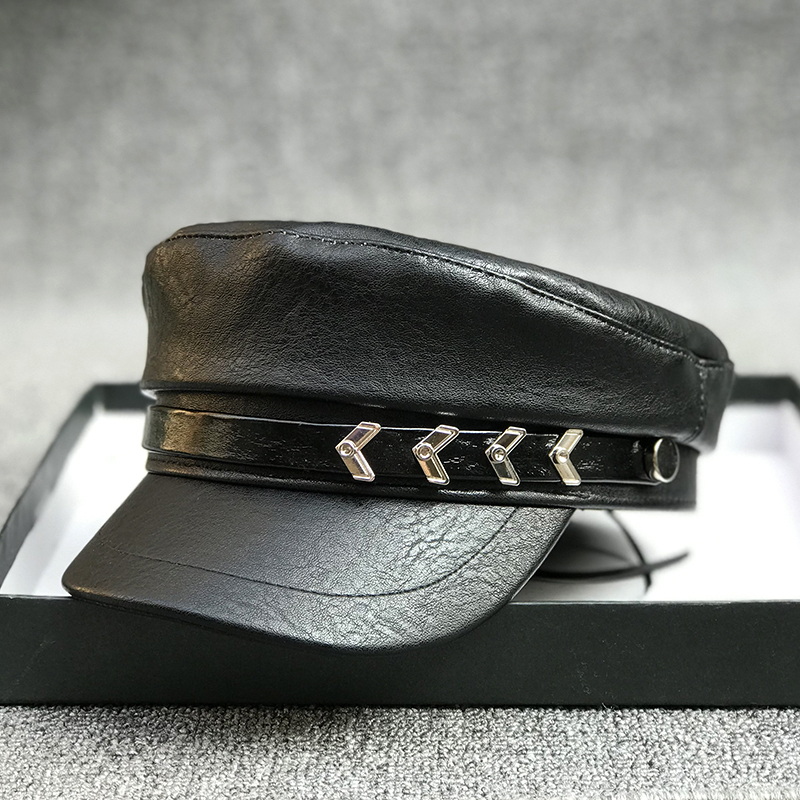 韓版秋冬PU皮鴨舌帽子女時尚水鉆裝飾海軍帽平頂帽個性百搭八角帽1入