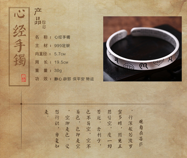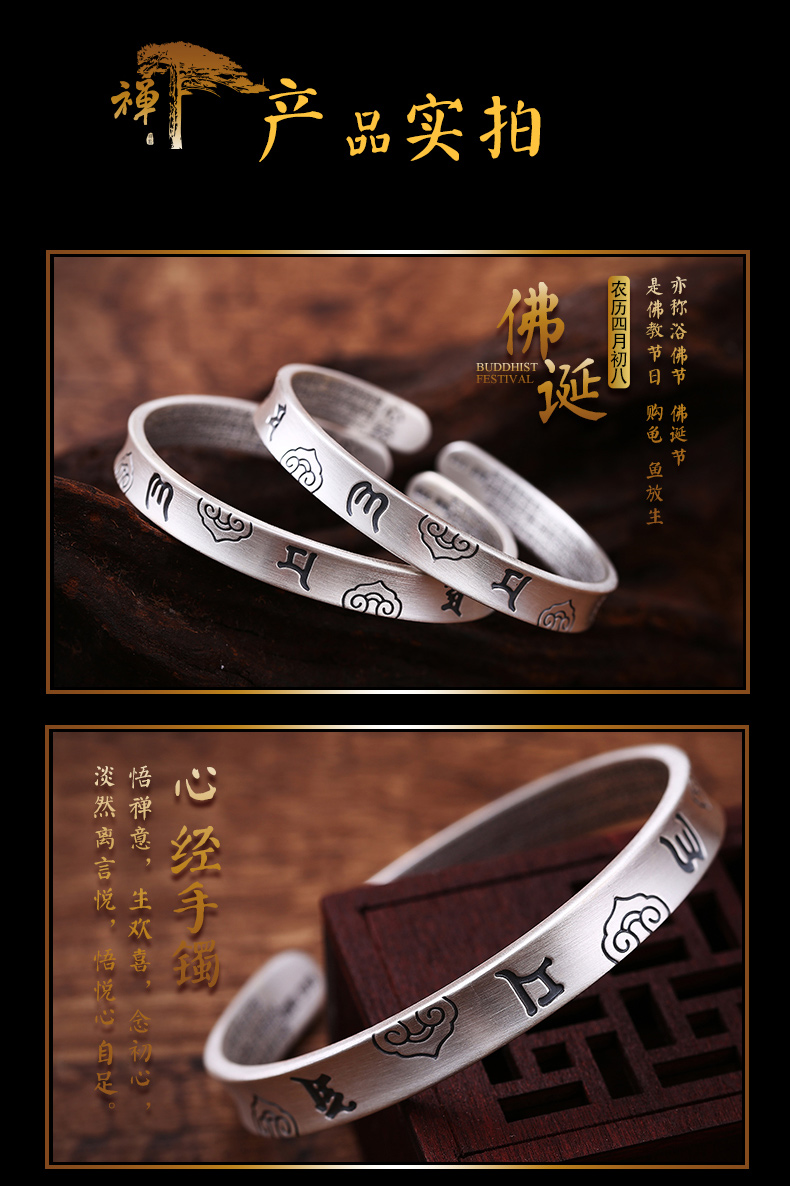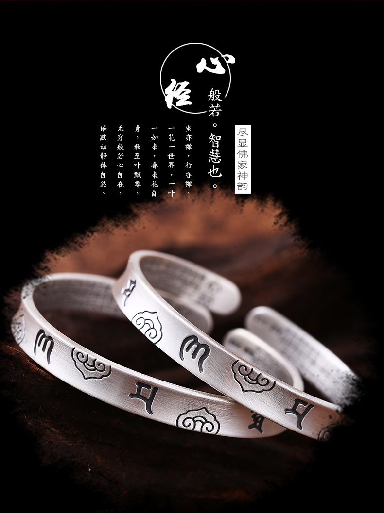 開光999純銀心經手鐲女網紅冷淡風送女友媽媽六字真言開口鐲子1入