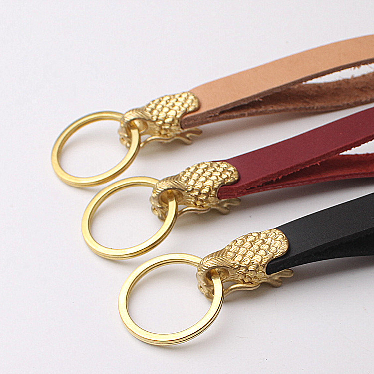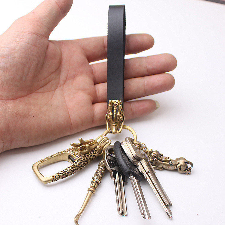 中國風銅飾頭層純牛皮純銅鑰匙繩生肖龍手機繩鑰匙掛件動物1入