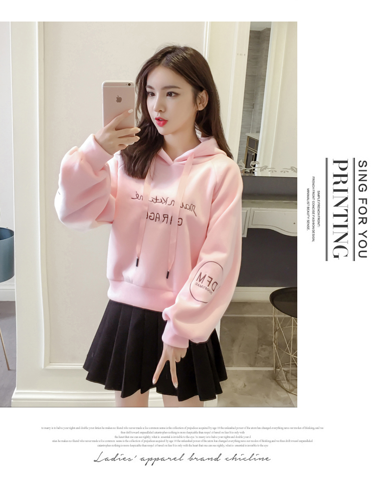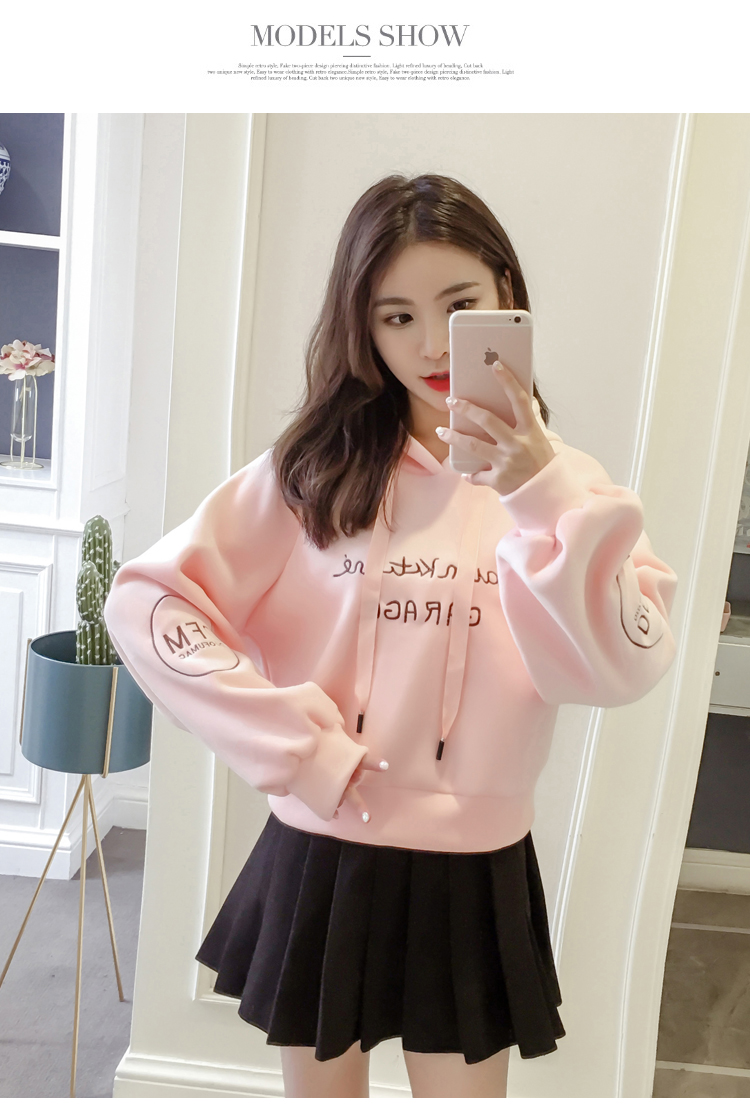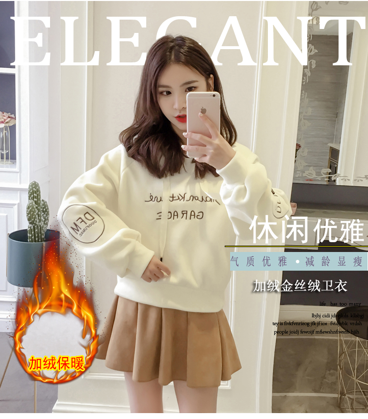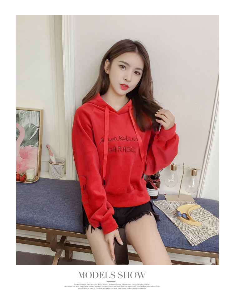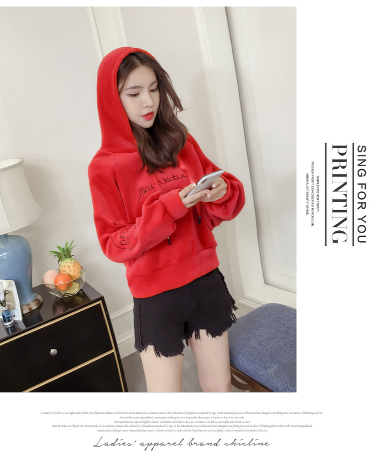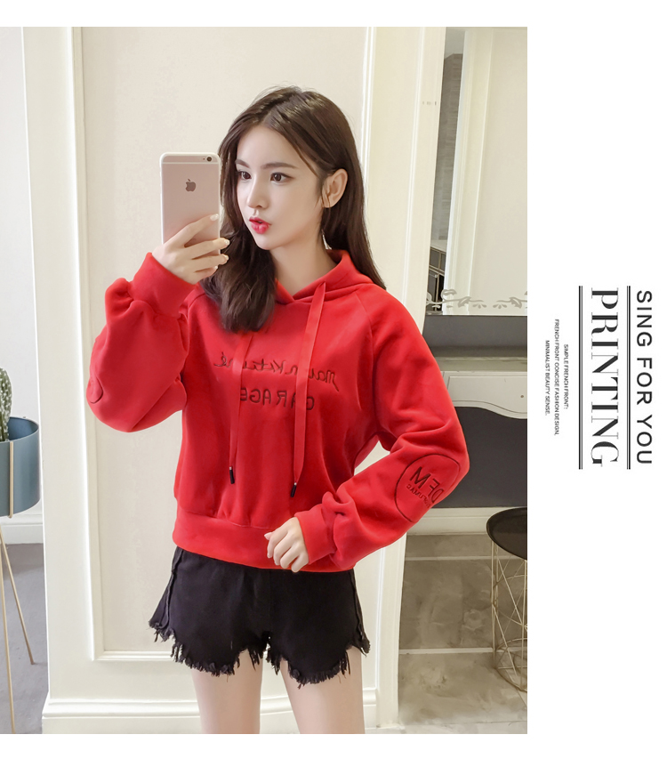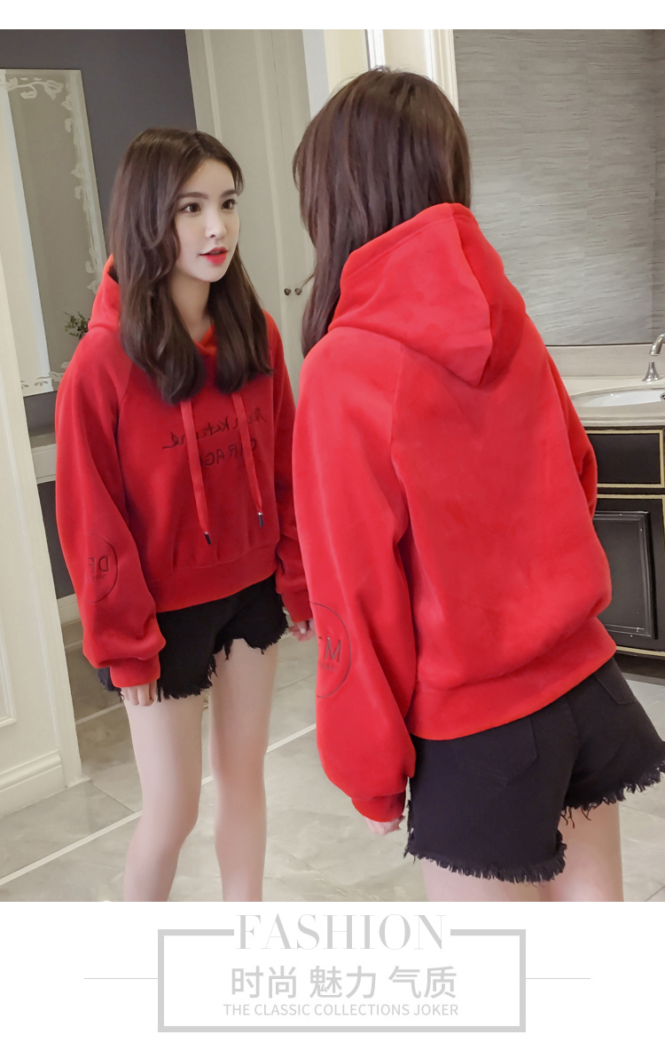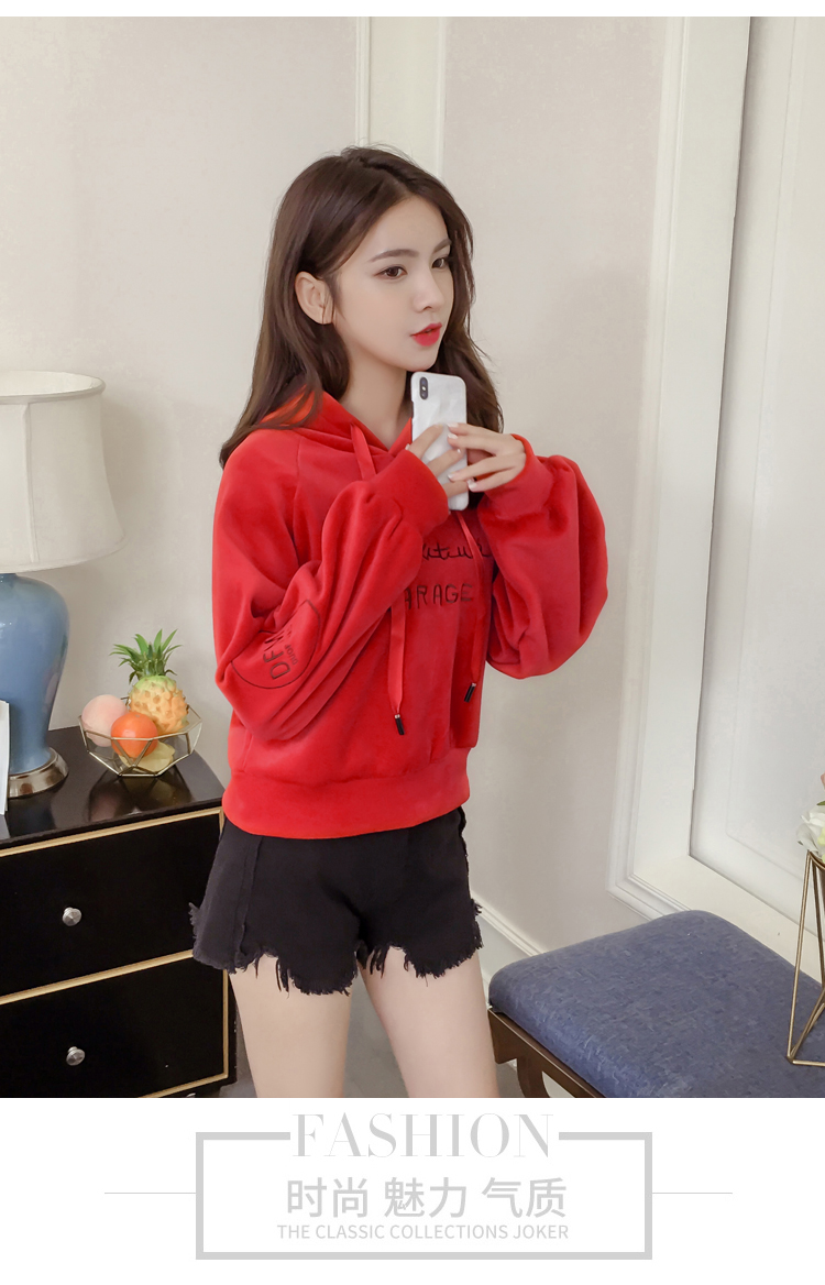 金絲絨連帽衛衣女加絨加厚秋冬新款韓版寬松學生刺繡短款套頭上衣1入