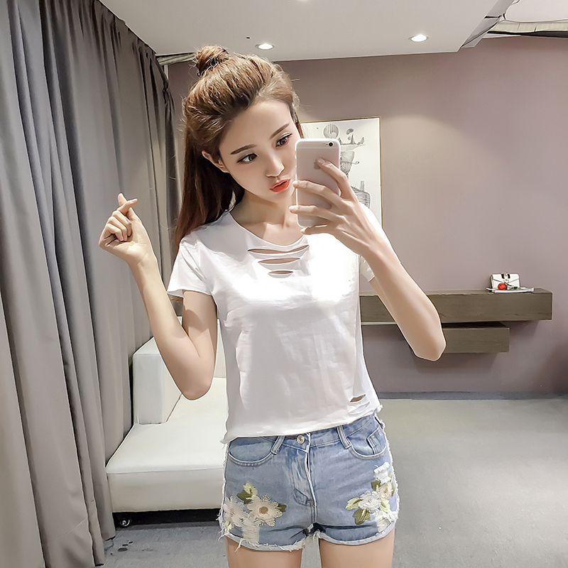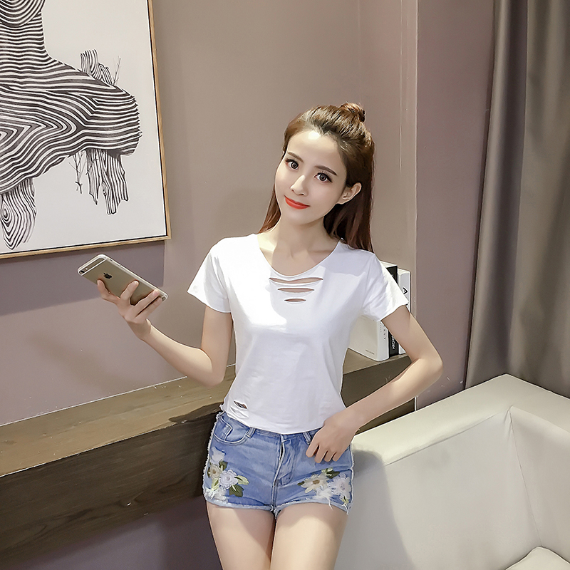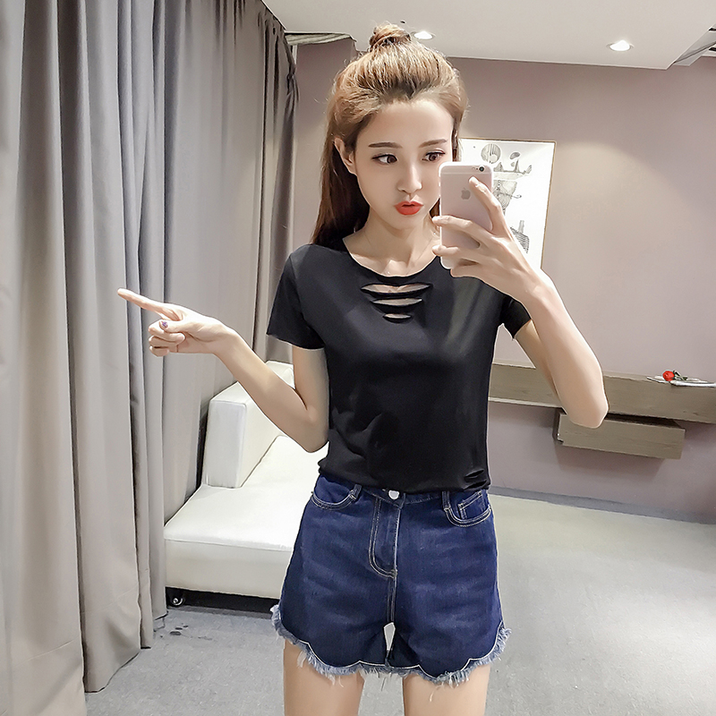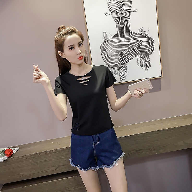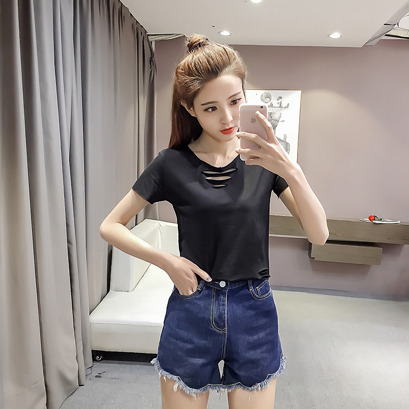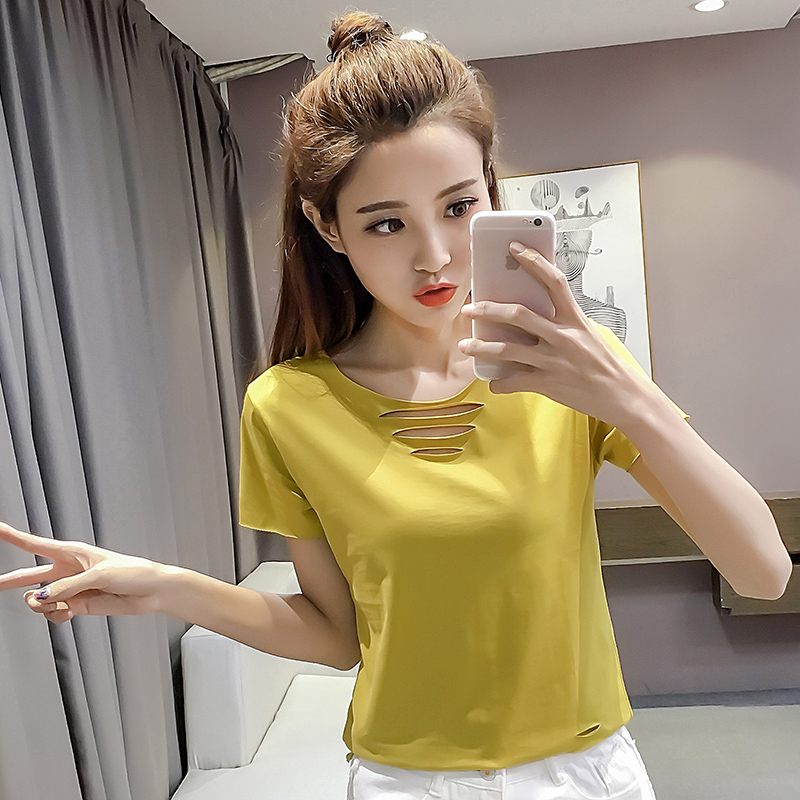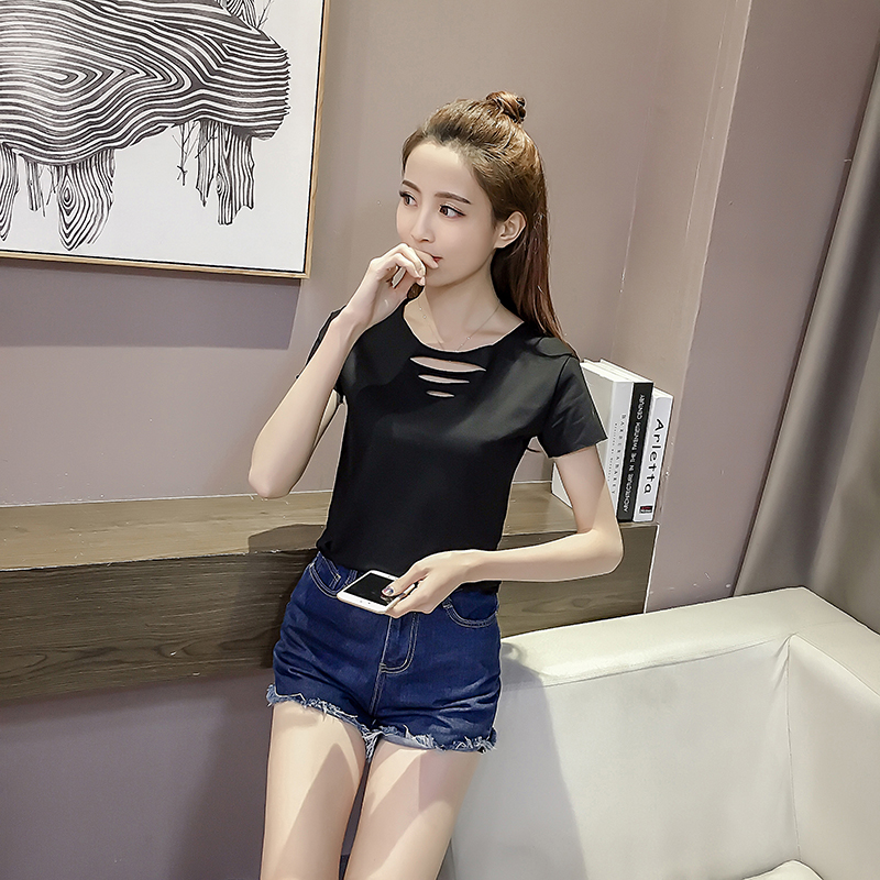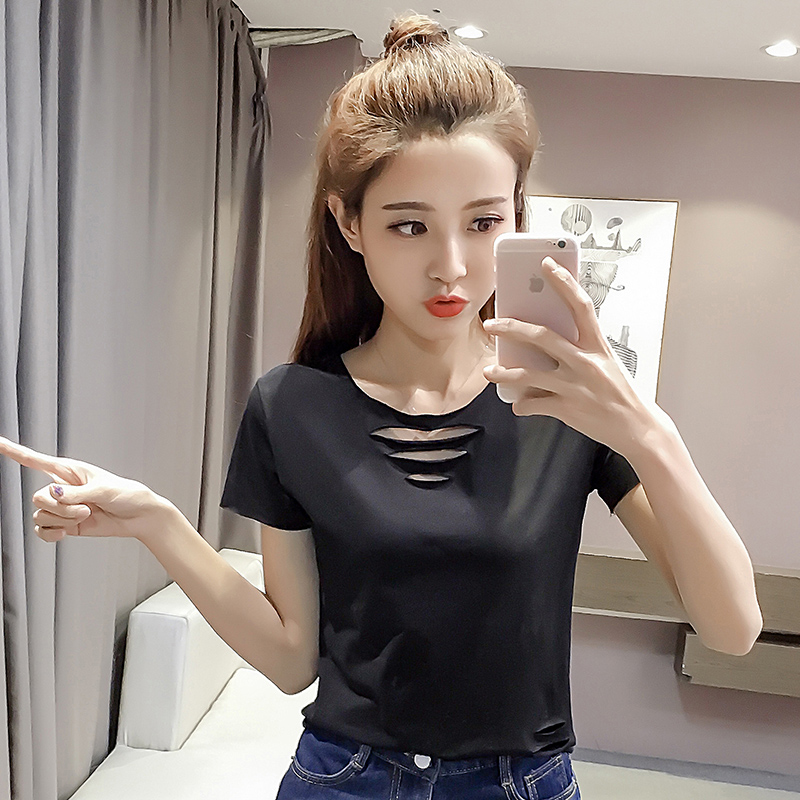 針織T恤女2019夏季新款修身顯瘦性感漏背鏤空韓范短袖短款上衣潮1入