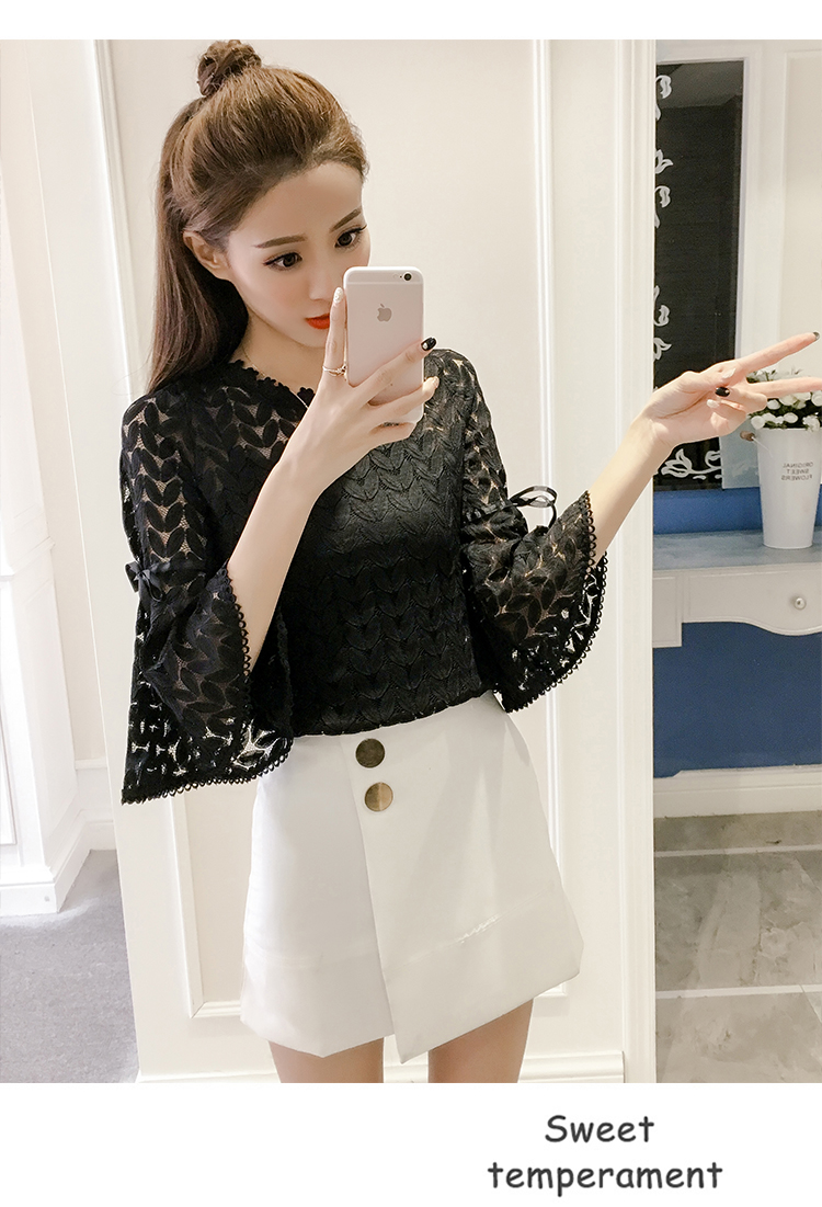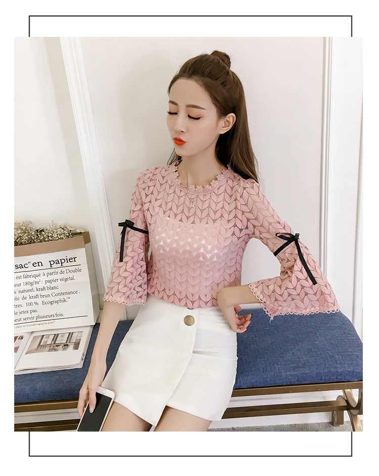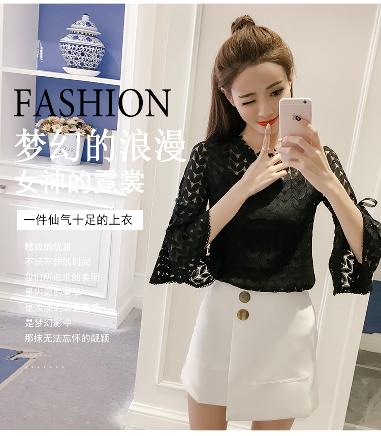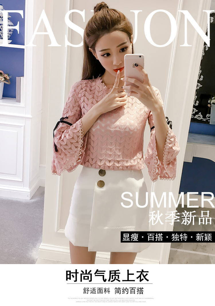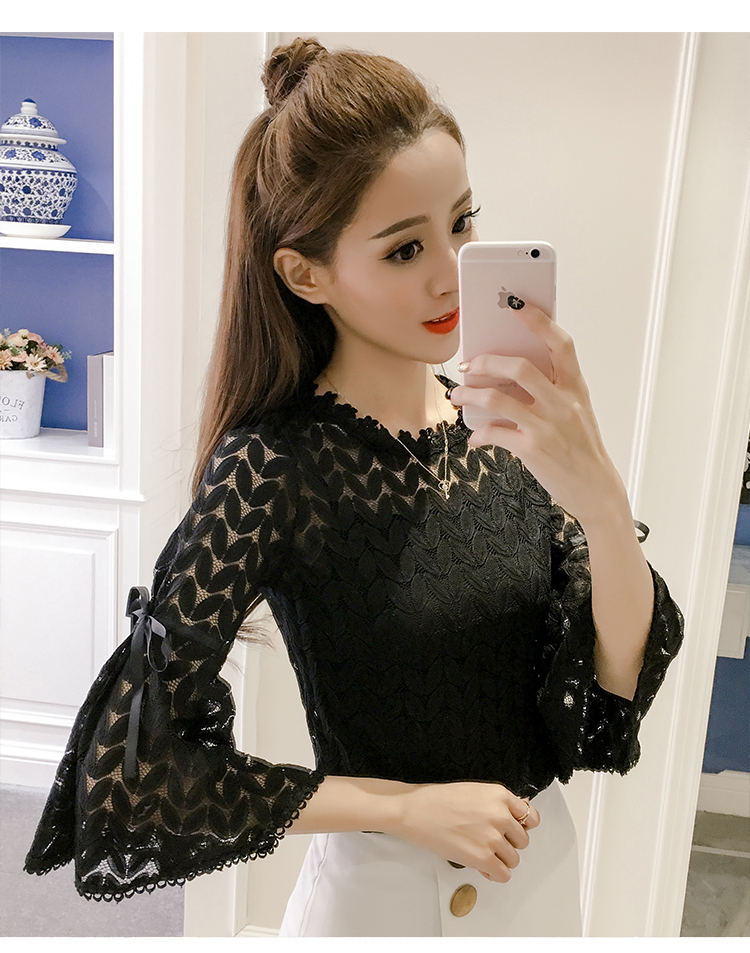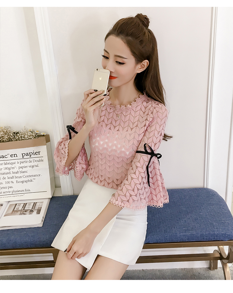 2019秋裝新款韓版氣質七分袖雪紡衫鏤空蕾絲上衣女喇叭袖超仙小衫1入
