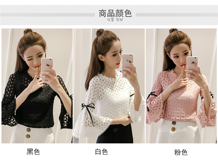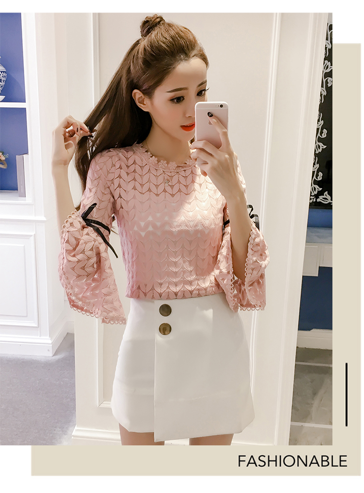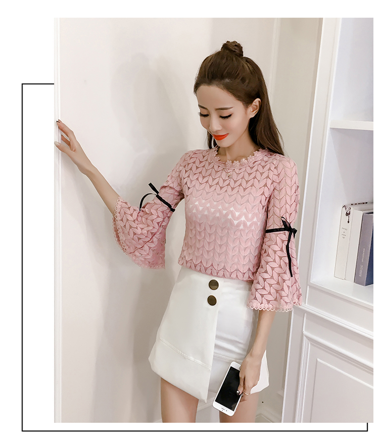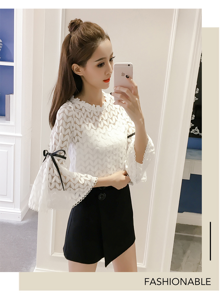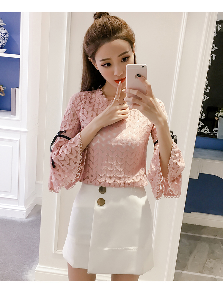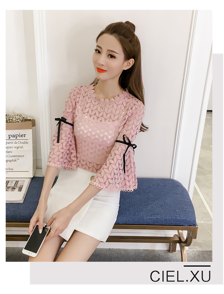 2019秋裝新款韓版氣質七分袖雪紡衫鏤空蕾絲上衣女喇叭袖超仙小衫1入